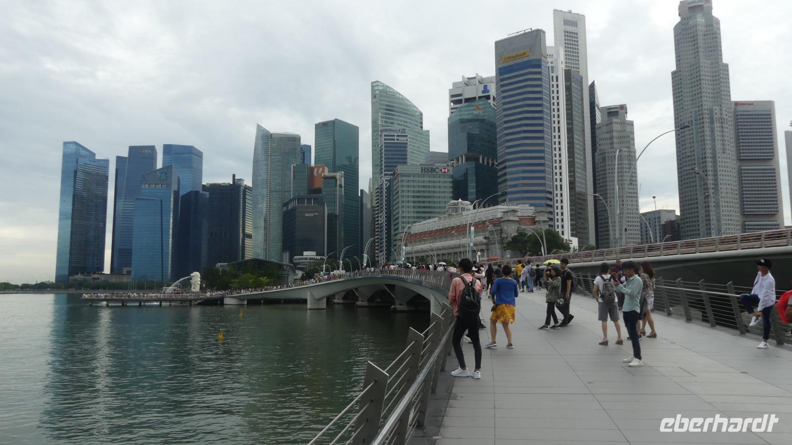 Am Clarke Quay gehen wir nachmittags an Bord eines Schiffes für einen einstündige Hafenrundfahrt durch diesen riesigen Naturhafen. Das Wetter ist noch verregnet. Wir sind aber zuversichtlich, dass wir morgen beim Auslauf unseres Kreuzfahrtschiffes bessere Bedingungen aus etwas anderer Perspektive von Deck 15 haben werden.