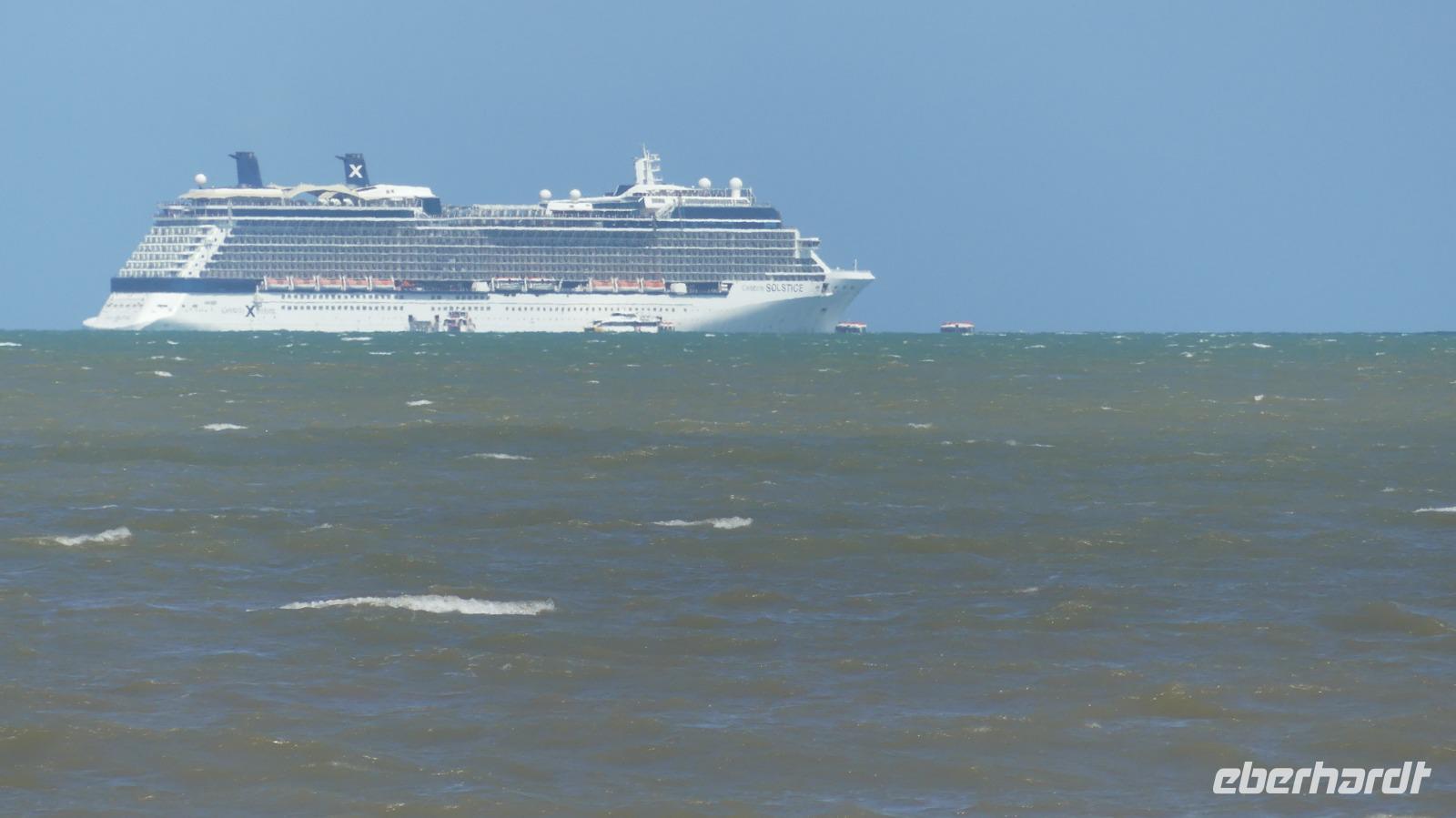 In Kuranda halten wir und bummeln durch den Ort. Für Einige von uns auch Gelegenheit für erste Einkäufe, wenn ich da so an Opale denke, von denen es hier wirklich eine verlockende Auswahl gibt :-). Damit haben wir die Zeit bis zum Einchecken im Hotel angenehm überbrückt. Unser Hotel befindet sich in dem hübschen kleinen Seebad Palm Cove. Den freien Nachmittag nutzen die Meisten von uns, um Schlaf nachzuholen. Für das Abendessen suchen wir uns ein schönes Lokal an der Esplanade. Auf dem Meer liegt ein Kreuzfahrtschiff auf Reede, bei näheren Hinsehen erkenne ich die Celebrity Solstice. Unser Kreuzfahrtschiff ist auf dem Weg nach Brisbane und Sydney.