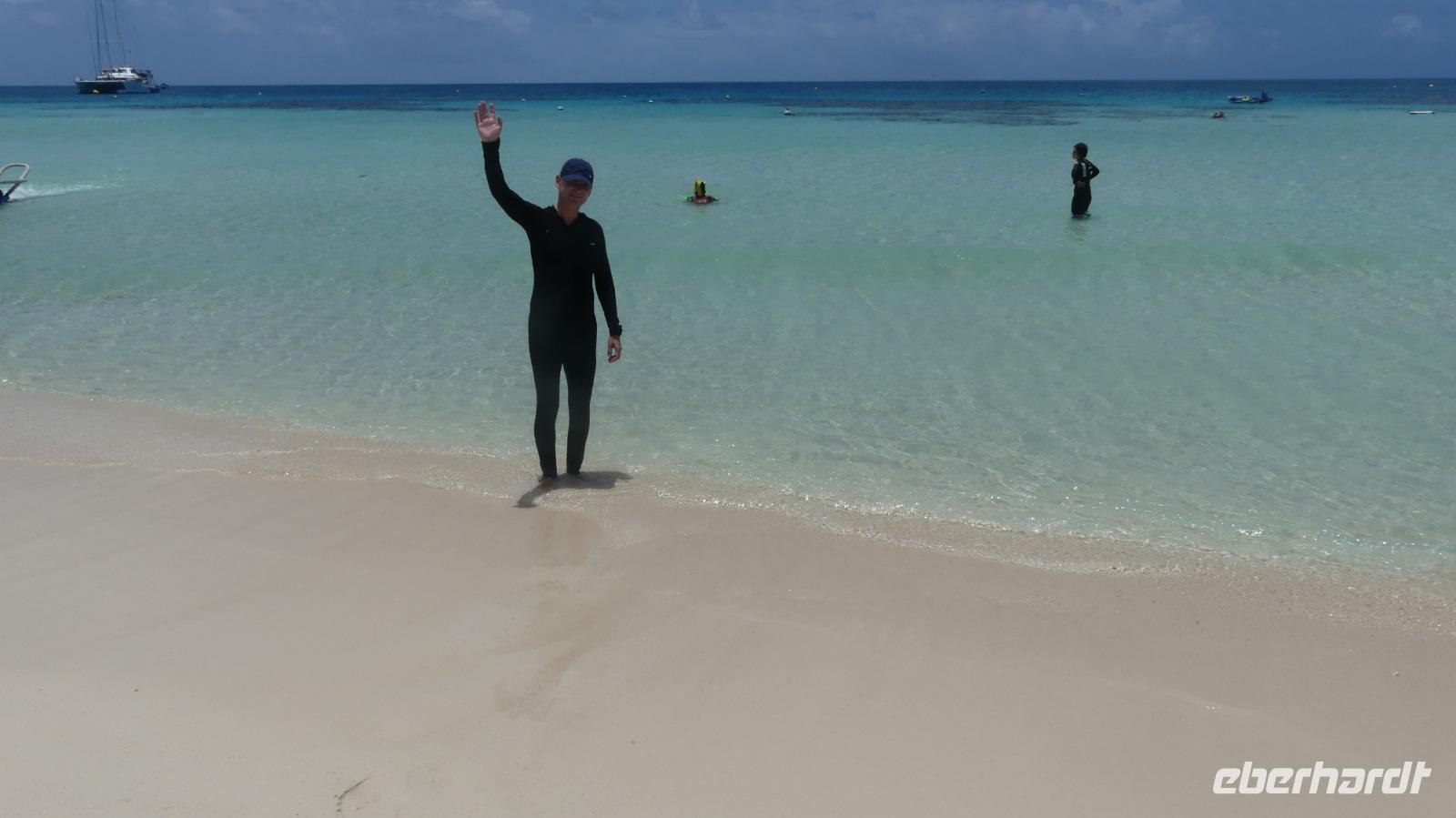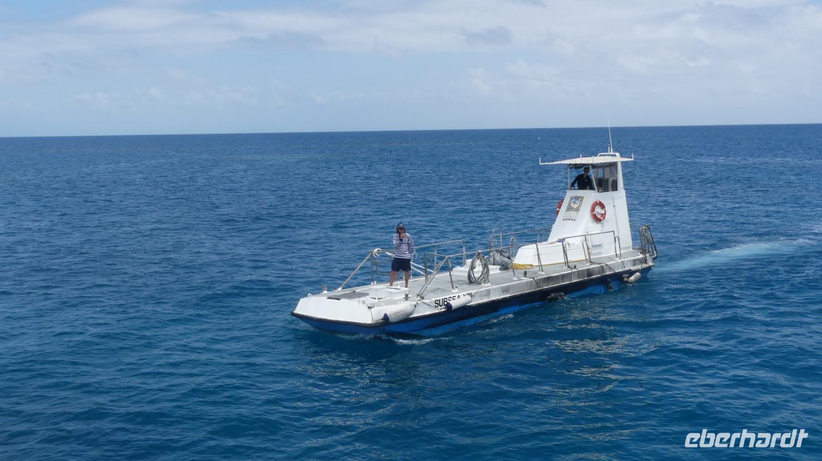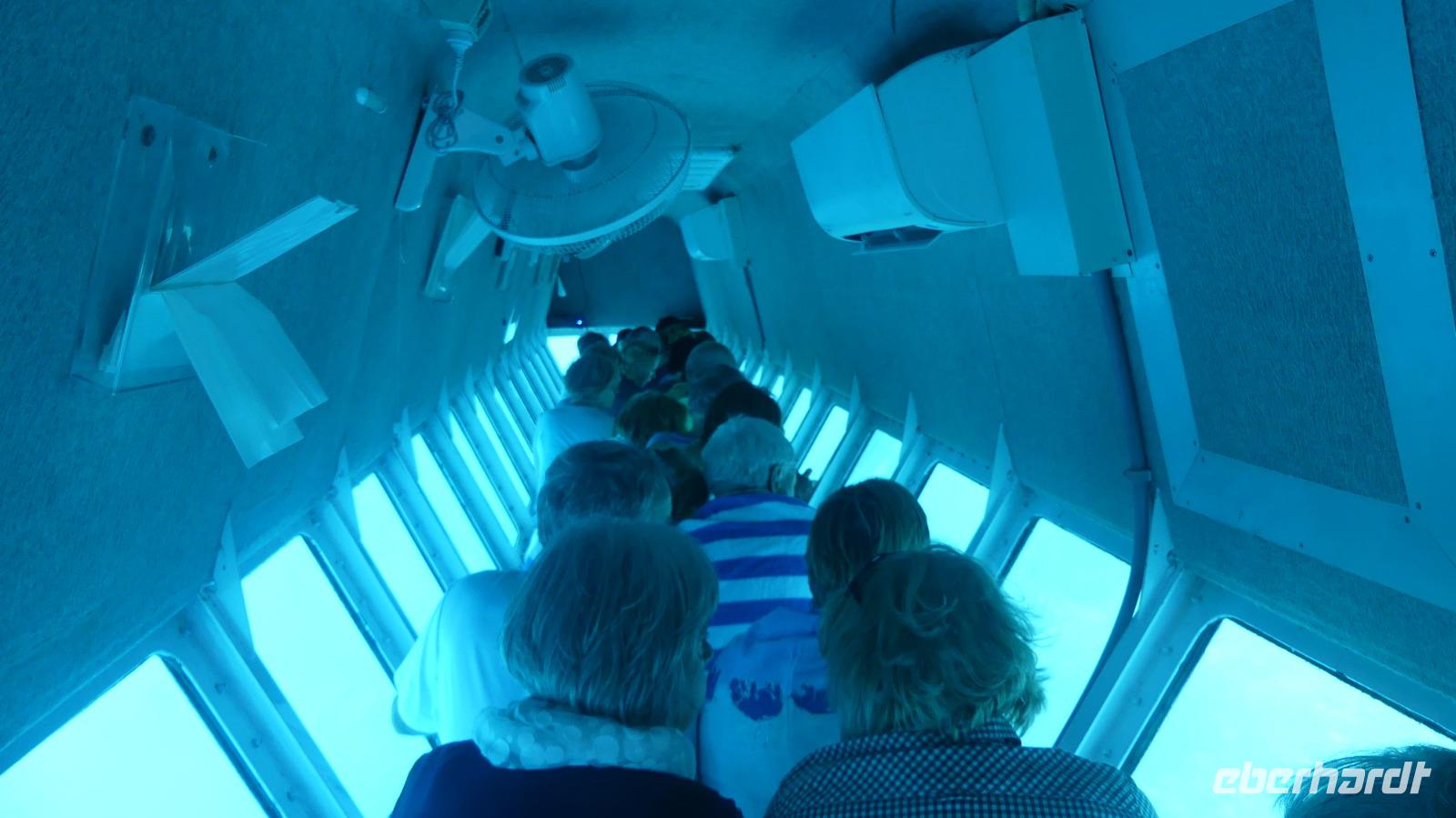 Am Morgen gibt es an Bord der „Ocean Spirit" eine angenehme Überraschung - meine Kollegin Vanessa ist mit einer Australienreisegruppe auch auf dem Katamaran. Vor Michaelmas Cay unternehmen wir eine Eberhardt-Exklusiv-Tauchfahrt mit einem sogenannten Semisubmarine gemeinsam mit Vanessas Gruppe. Während der Unterwasserfahrt sehen wir viele verschiedene Weich- und Hartkorallen und Riffbewohner wie zum Beispiel Papageienfische, riesige Mördermuscheln und einen Hai. Über 900 Korallen- und 1.600 Fischartenarten leben hier am Great Barrier Reef. Das Riff ist das Ergebnis eines 14.000 Jahre andauernden Wachstumprozesses.