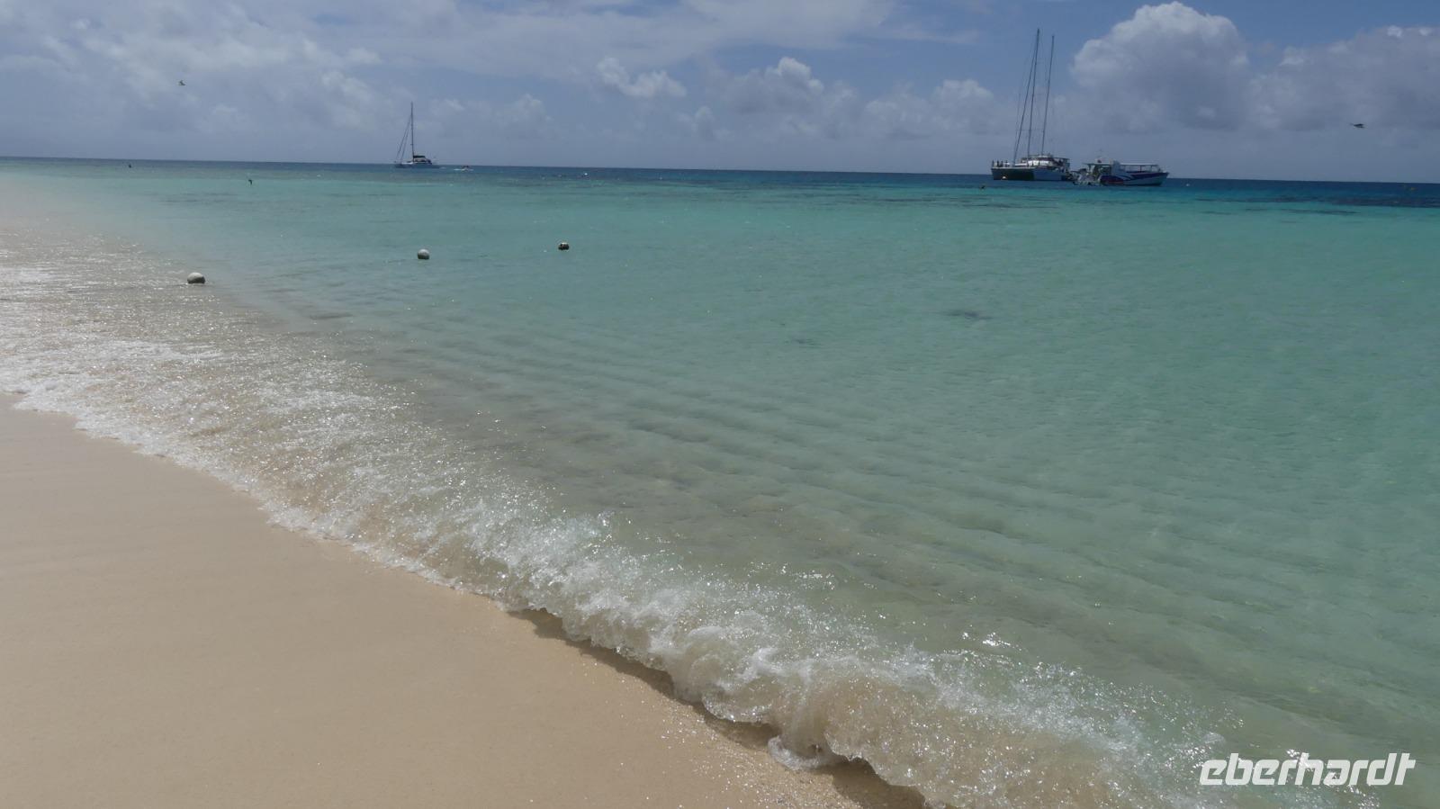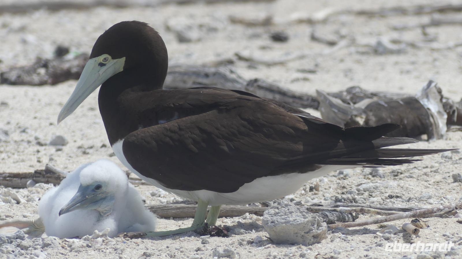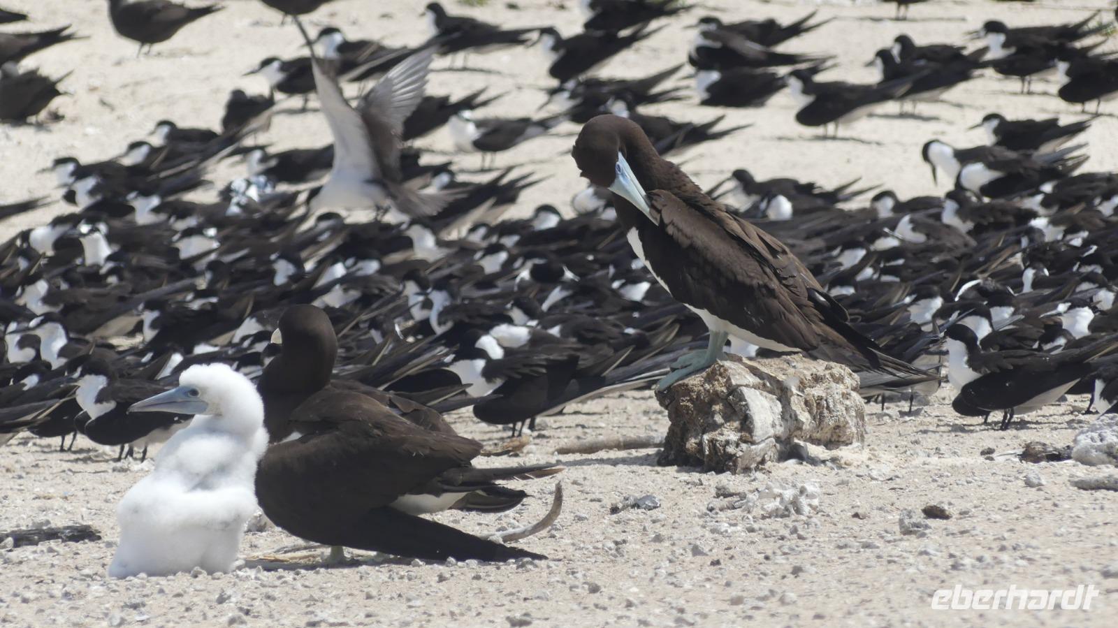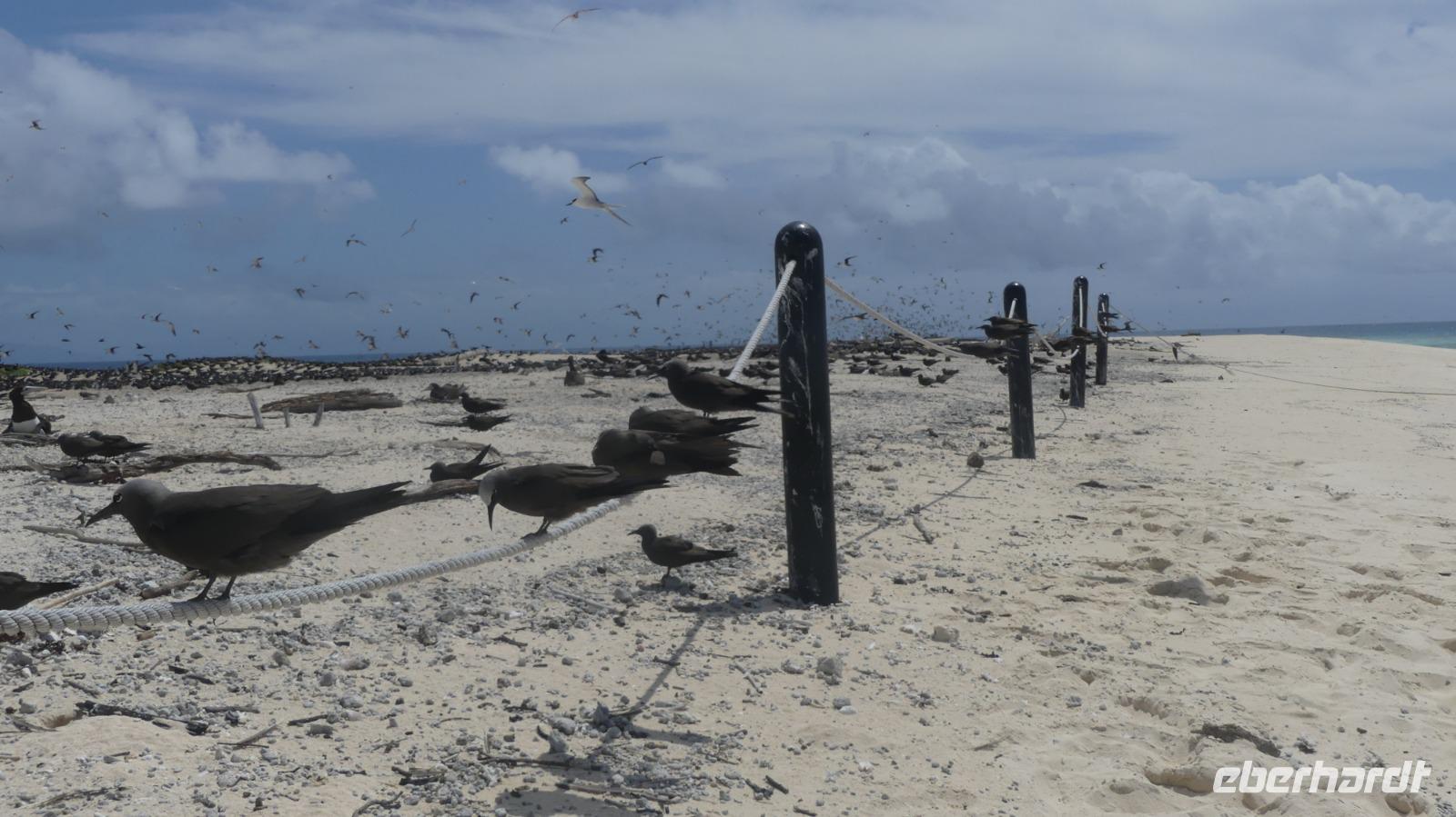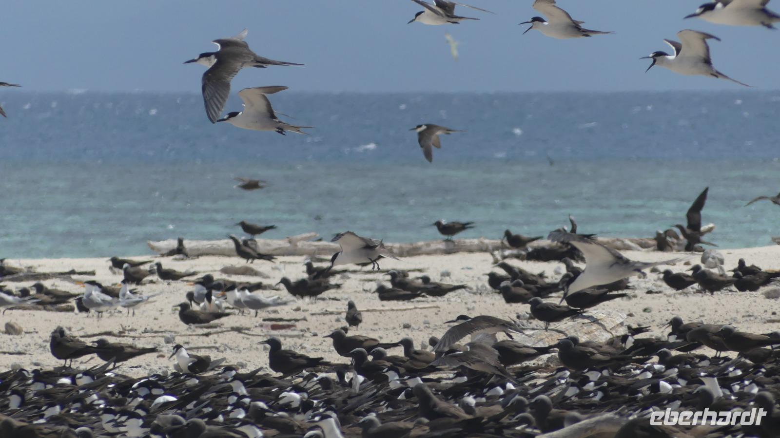 Wer möchte, tendert zur Insel. Hier halten sich derzeit ca. 6.500 Seevögel zur Brut auf. Wir können sie ganz aus der Nähe beobachten. Die Insel ist gleichzeitig Ausgangspunkt zum Baden im warmen Wasser oder zum Schnorcheln im Ganzkörperanzug. Dieser schützt vor der starken Sonne und vor Quallen.