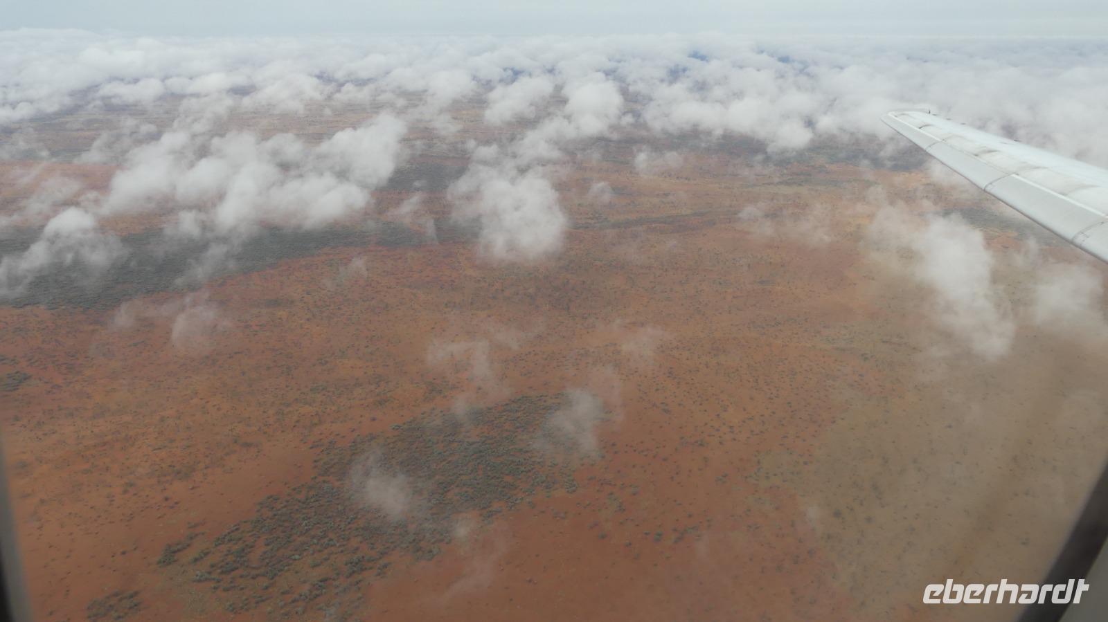 Schon während des Fluges wird uns klar, warum man die Mitte Australiens das „rote Zentrum" nennt, denn über weite Strecken ist die Erdoberfläche rötlich gefärbt.