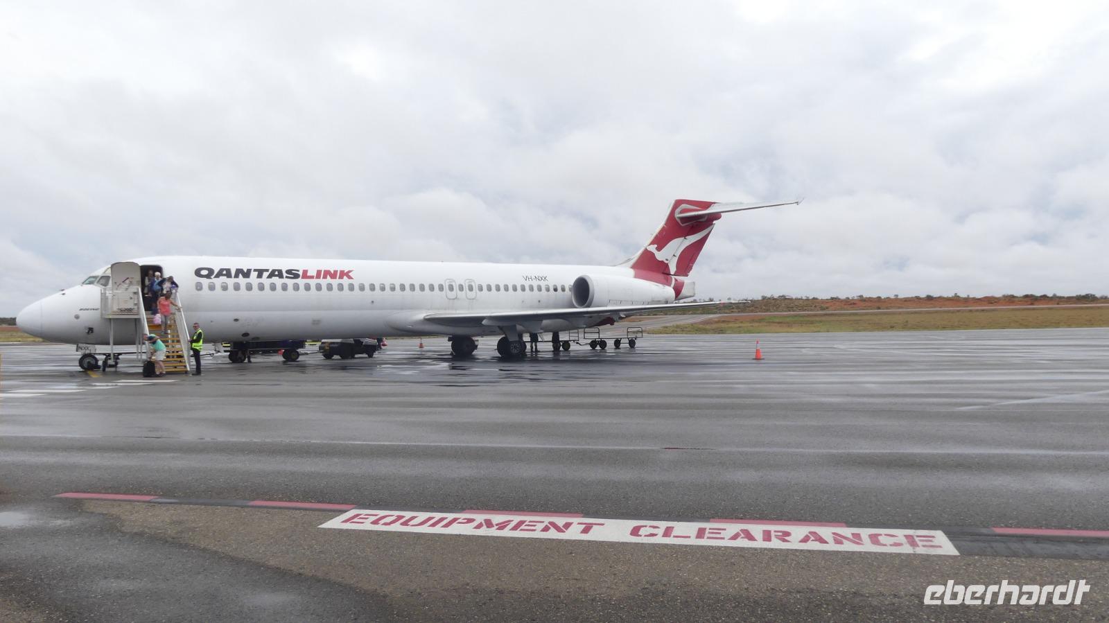 Eine kleine Boeing vom Typ Boeing 717-200 der Queensland and Northern Territories Air Services, kurz Quantas fliegt uns in zwei Stunden von der tropische Küste des Sonnenscheinstaates Queensland ins Outback der Region des „Uluru" wie man hier den Ayers Rock hier nennt.
