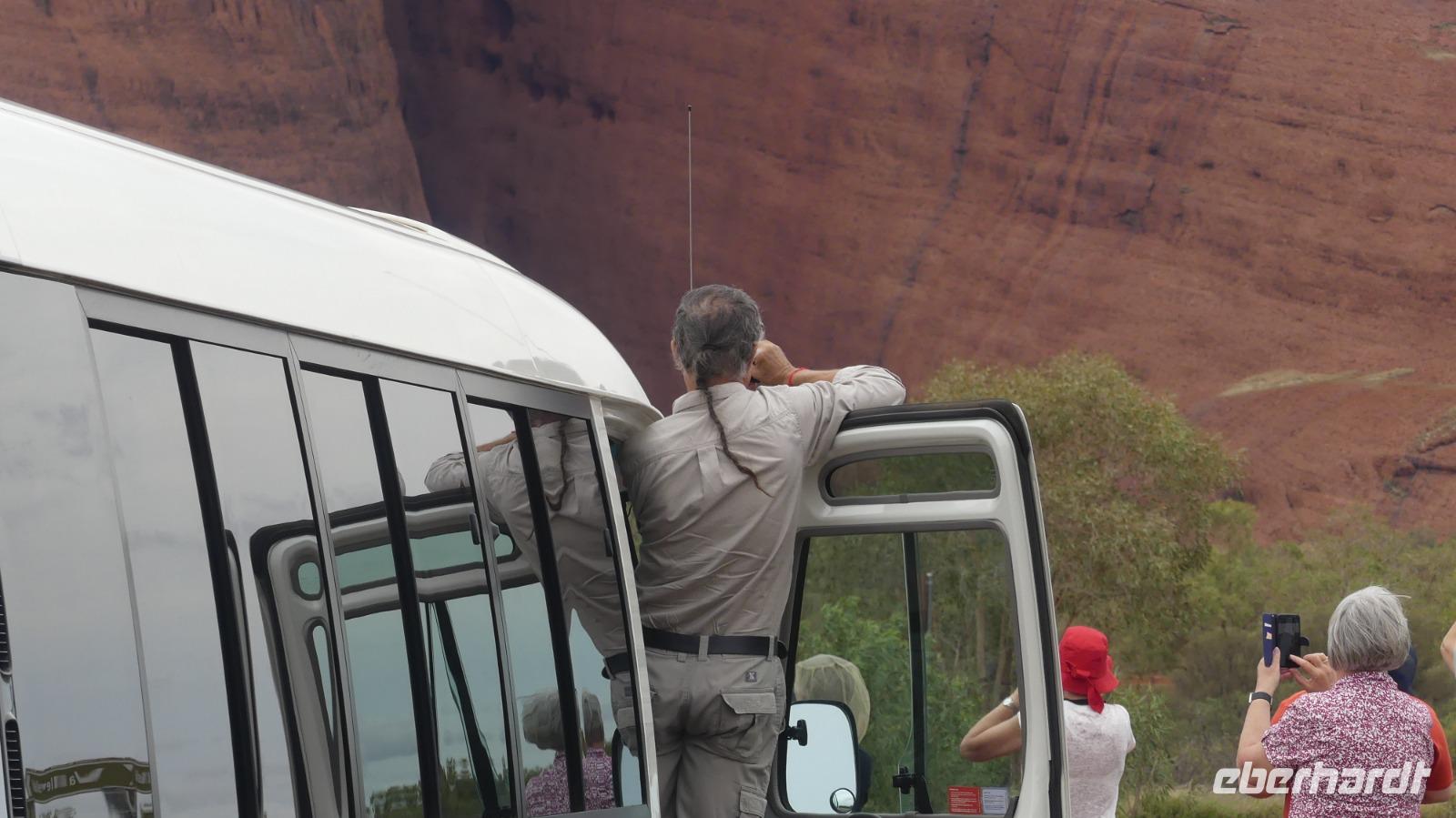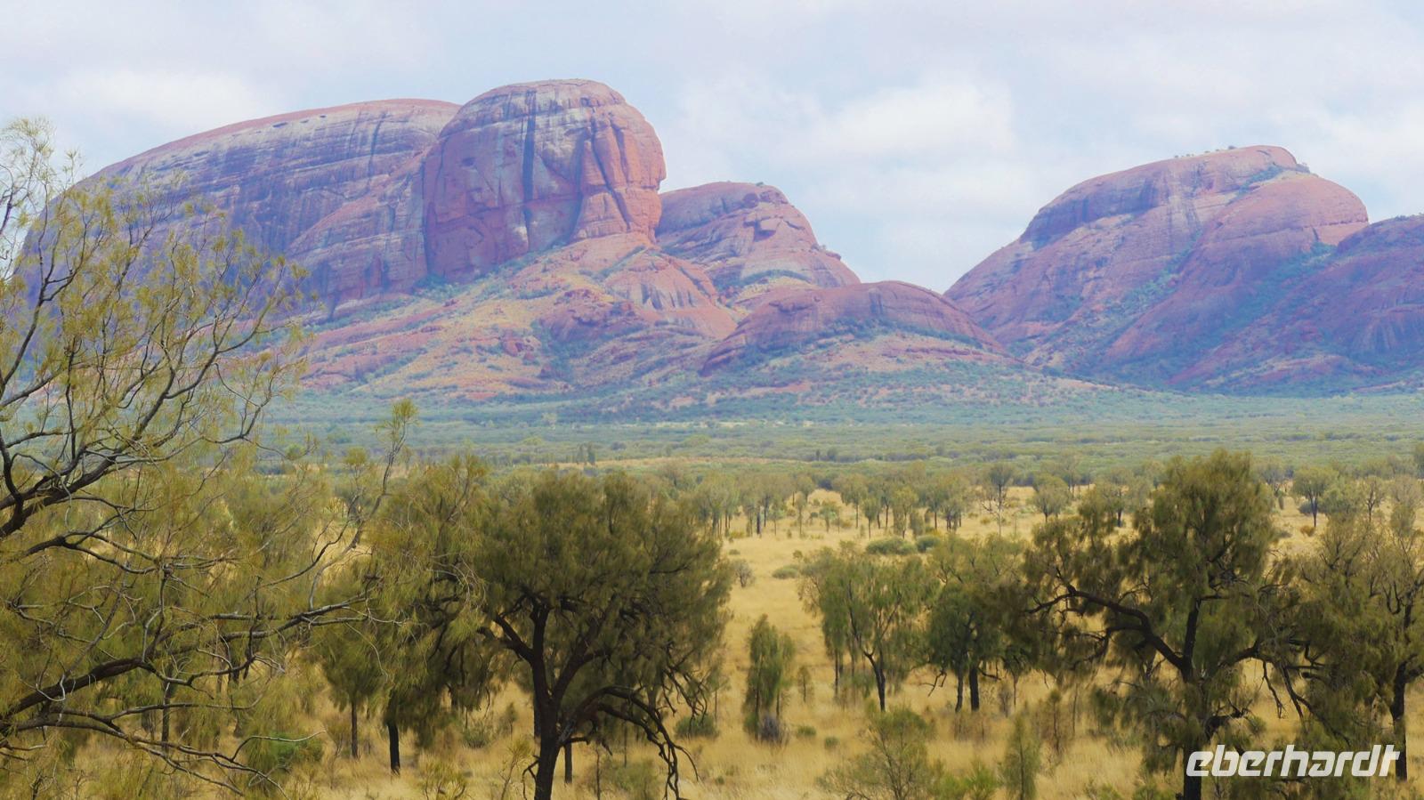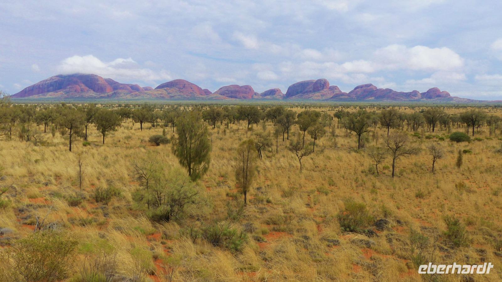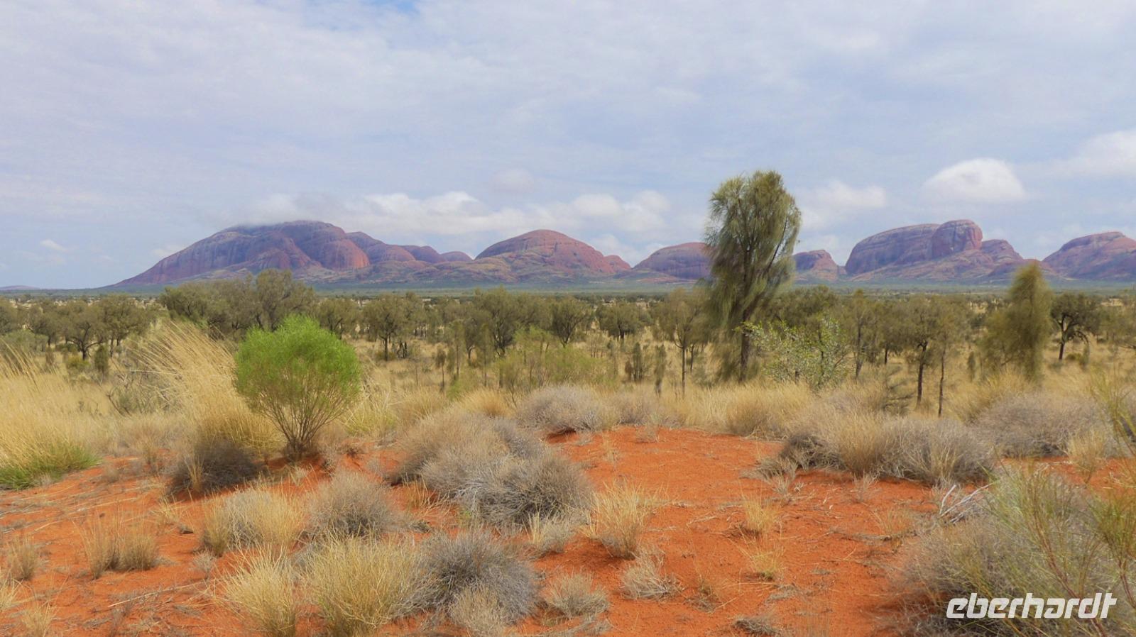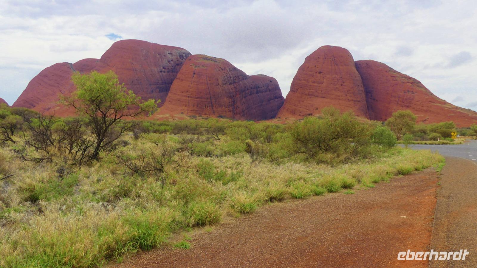 Bevor es losgeht, organisiert uns Marcel noch Fliegennetze gegen die lästigen „Flys". Dann fahren wir erstmal am Ayers Rock bzw. Uluru vorbei zu den die Kata Tjutas. Übersetzt bedeutet Kata Tjuta einfach nur „viele Berge". Genaugenommen sind es 36 Felskuppeln mit einer kräftigen rotbraunen Farbe. Mit Marcel wandern wir den Walpa Gorge Walk, Schlucht der „Olgas", wie die Kat Tjutas auch genannt werden. Namensgeber war ihr Entdecker Ernest Giles, der sie nach seinen Förderern aus dem Hause Württemberg benannte - Olga von Württemberg.