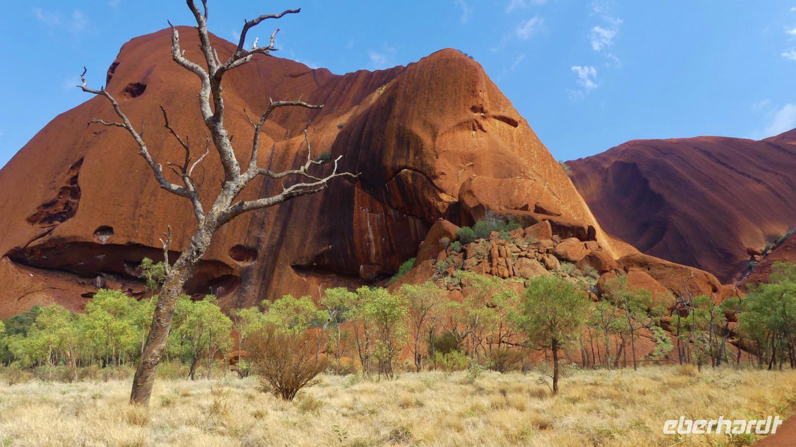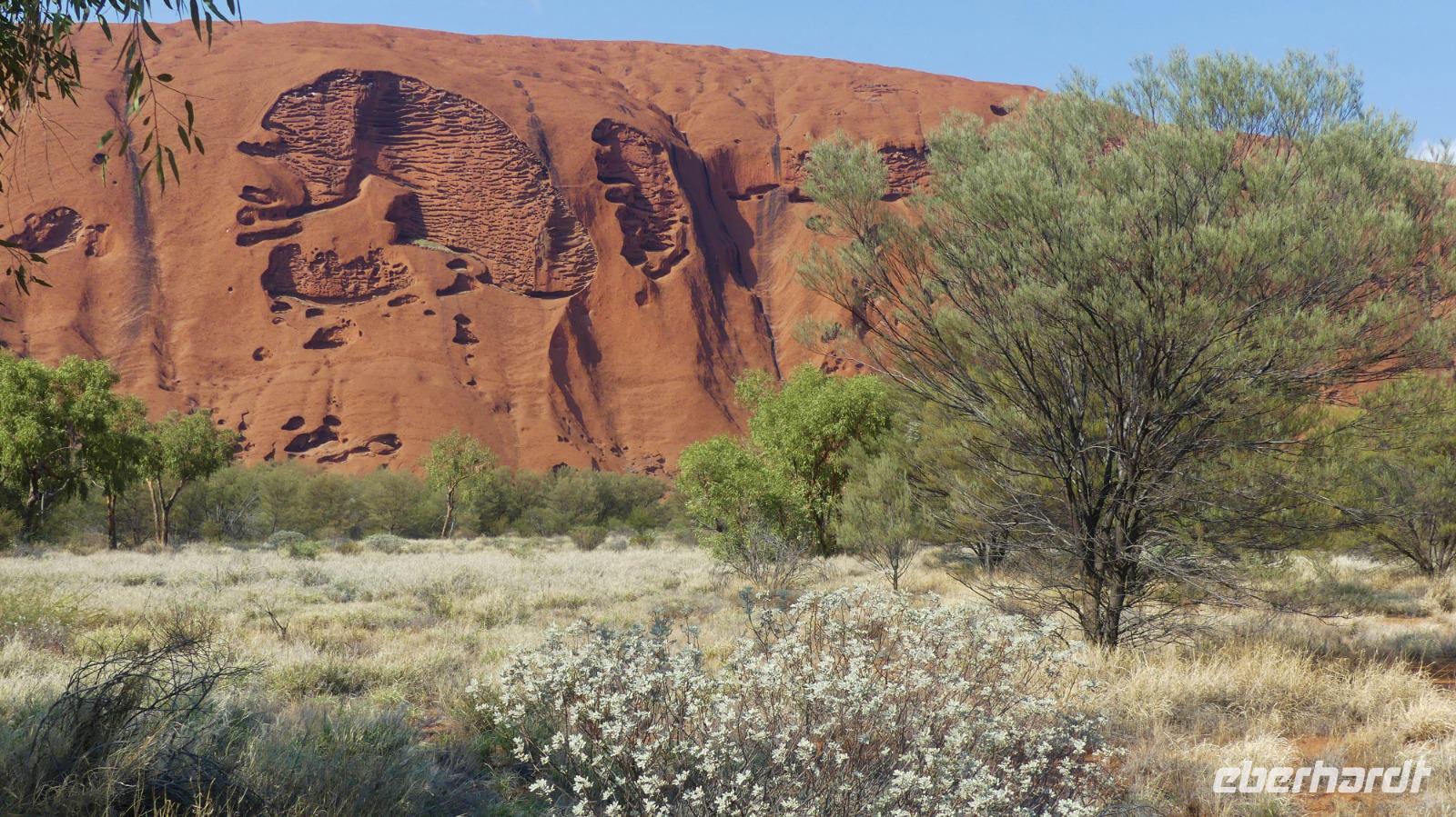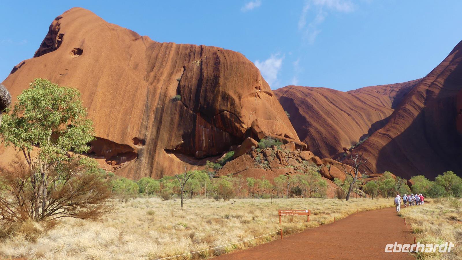 Im Kulturzentrum am Uluru frühstücken wir. Anschließend unternehmen wir mehrere kleine Wanderungen direkt am Ayers Rock. Jetzt strahlt auch die Morgensonne, so dass die kräftige rotbraune Färbung des Uluru wunderschön leuchtet. Am Uluru können wir verschiedene Gesteinsformationen erkennen. Marcel erklärt uns wie die Aborigines diese deuten und welche Geschichten sie damit verbinden. Ich glaube diese Traumzeit-Erzählungen sind für uns etwas sehr Ungewöhnliches und nicht immer ganz einfach zu verstehen. Wir sehen auch verschiedene Felsmalereien, heilige Stätten der Ureinwohner, Wasserstellen und eine der markantesten Formationen am Uluru, das sogenannte „Gehirn". Marcel kennt sich hier bestens aus und nach seinen Darstellungen hat er einen guten Draht zu den Ureinwohnern von deren Wissen er schöpft.