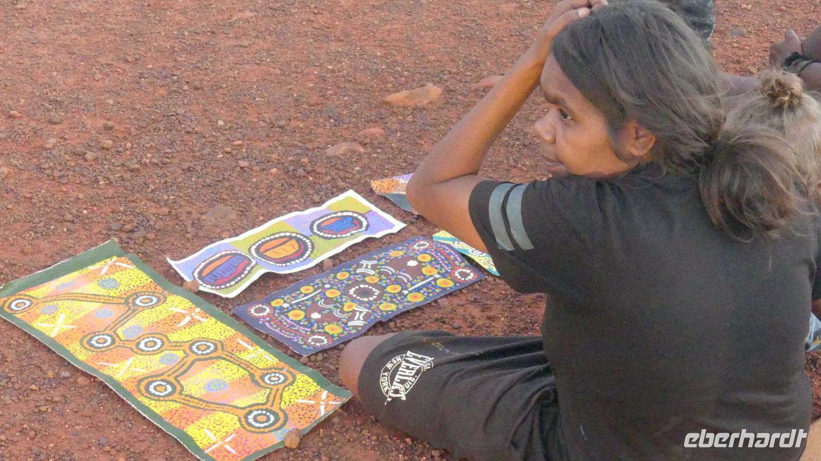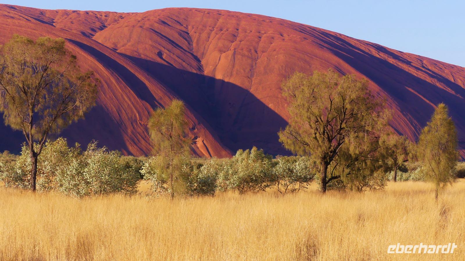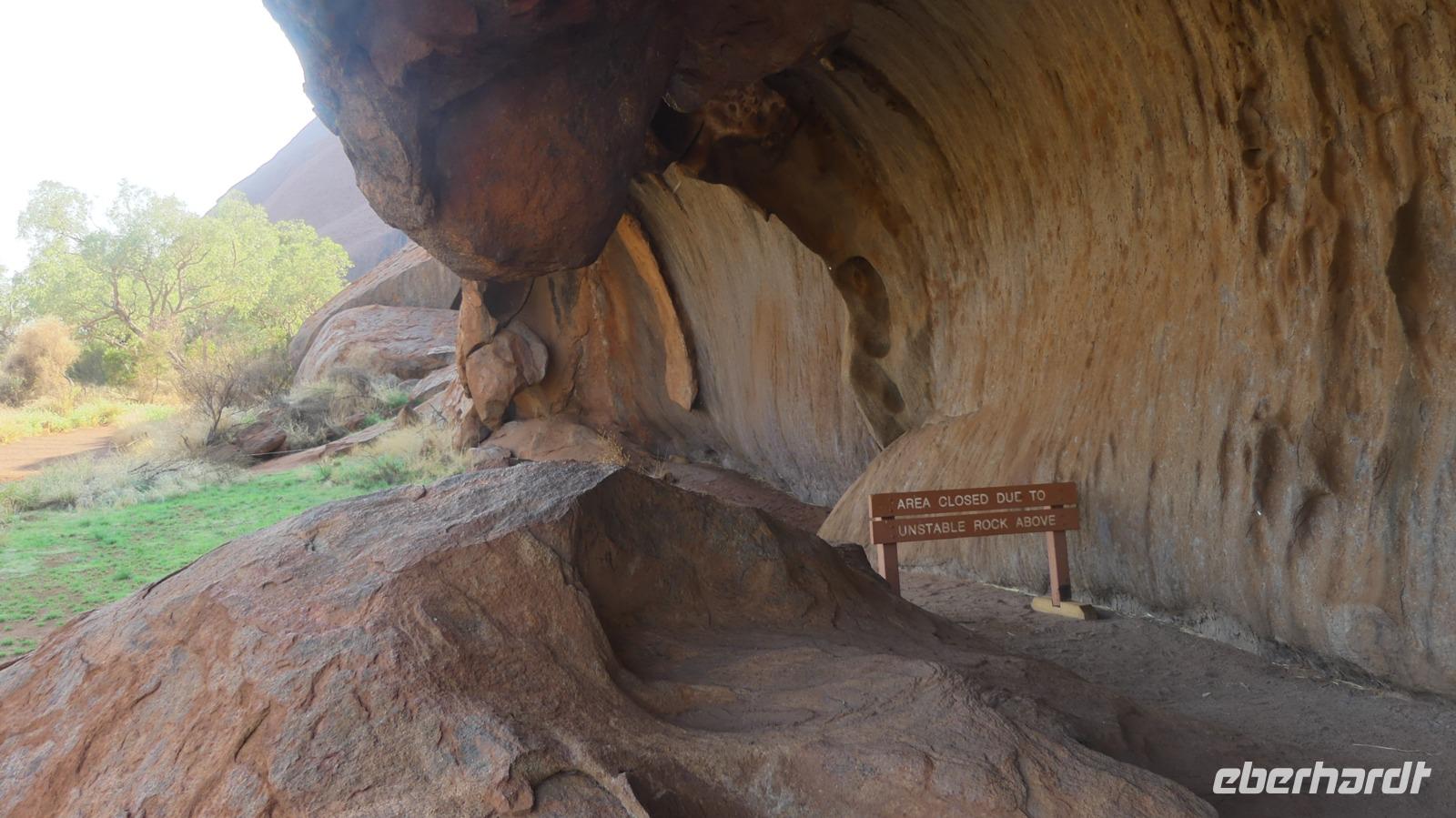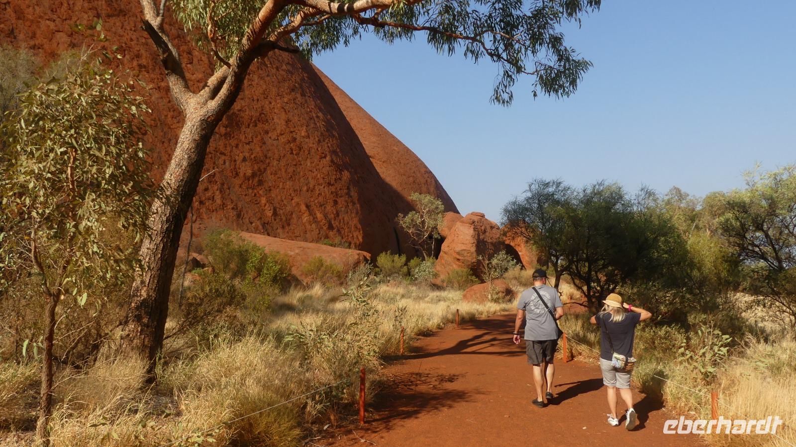 Im Kulturzentrum am Uluru frühstücken wir. Anschließend unternehmen wir mehrere kleine Wanderungen direkt am Ayers Rock. Jetzt strahlt auch die Morgensonne, so dass die kräftige rotbraune Färbung des Uluru wunderschön leuchtet. Am Uluru können wir verschiedene Gesteinsformationen erkennen. Marcel erklärt uns wie die Aborigines diese deuten und welche Geschichten sie damit verbinden. Ich glaube diese Traumzeit-Erzählungen sind für uns etwas sehr Ungewöhnliches und nicht immer ganz einfach zu verstehen. Wir sehen auch verschiedene Felsmalereien, heilige Stätten der Ureinwohner, Wasserstellen und eine der markantesten Formationen am Uluru, das sogenannte „Gehirn". Marcel kennt sich hier bestens aus und nach seinen Darstellungen hat er einen guten Draht zu den Ureinwohnern von deren Wissen er schöpft.