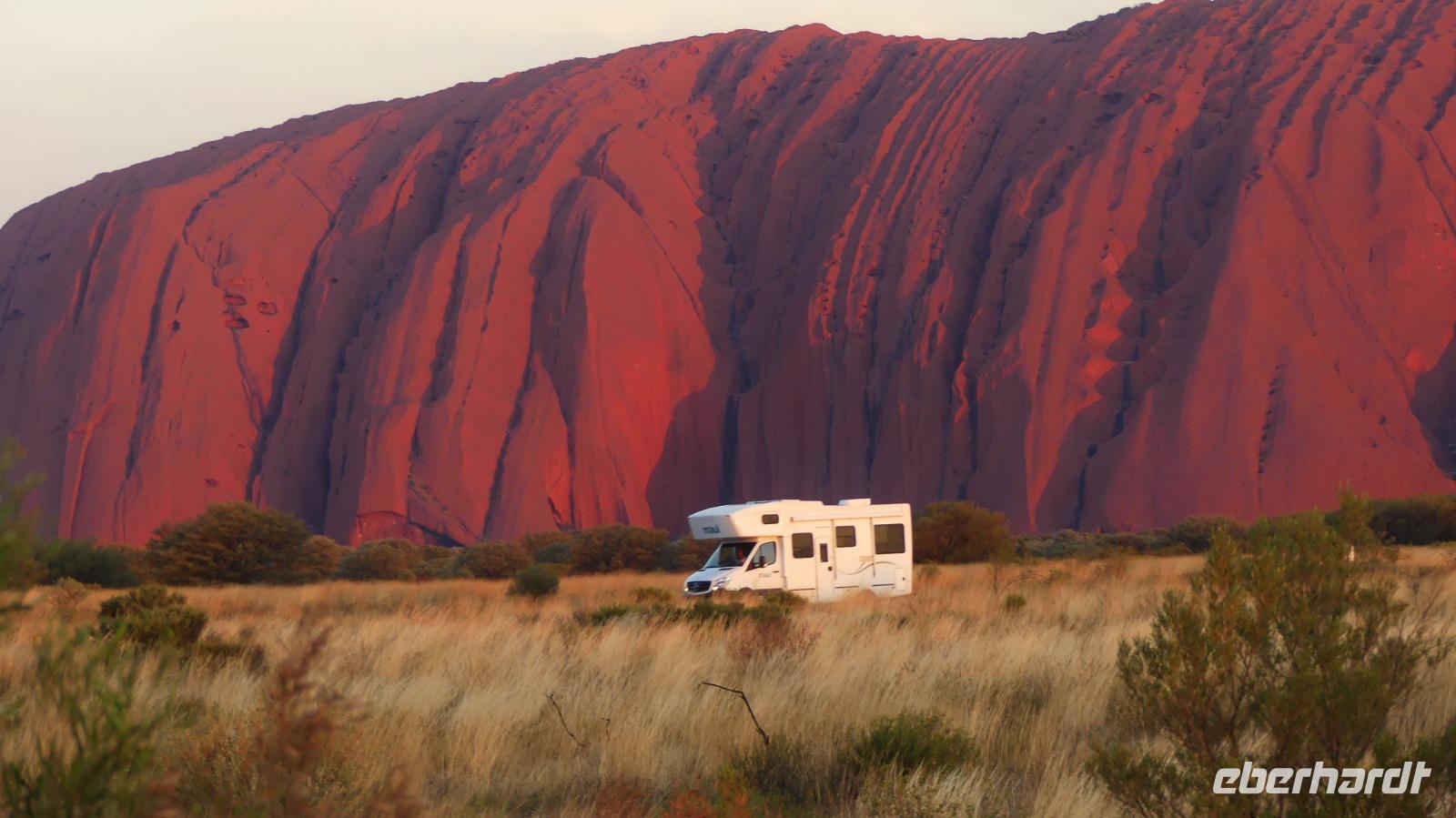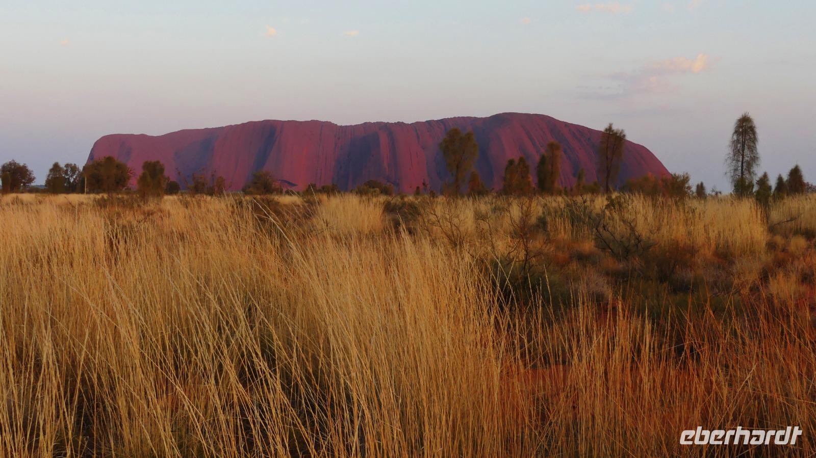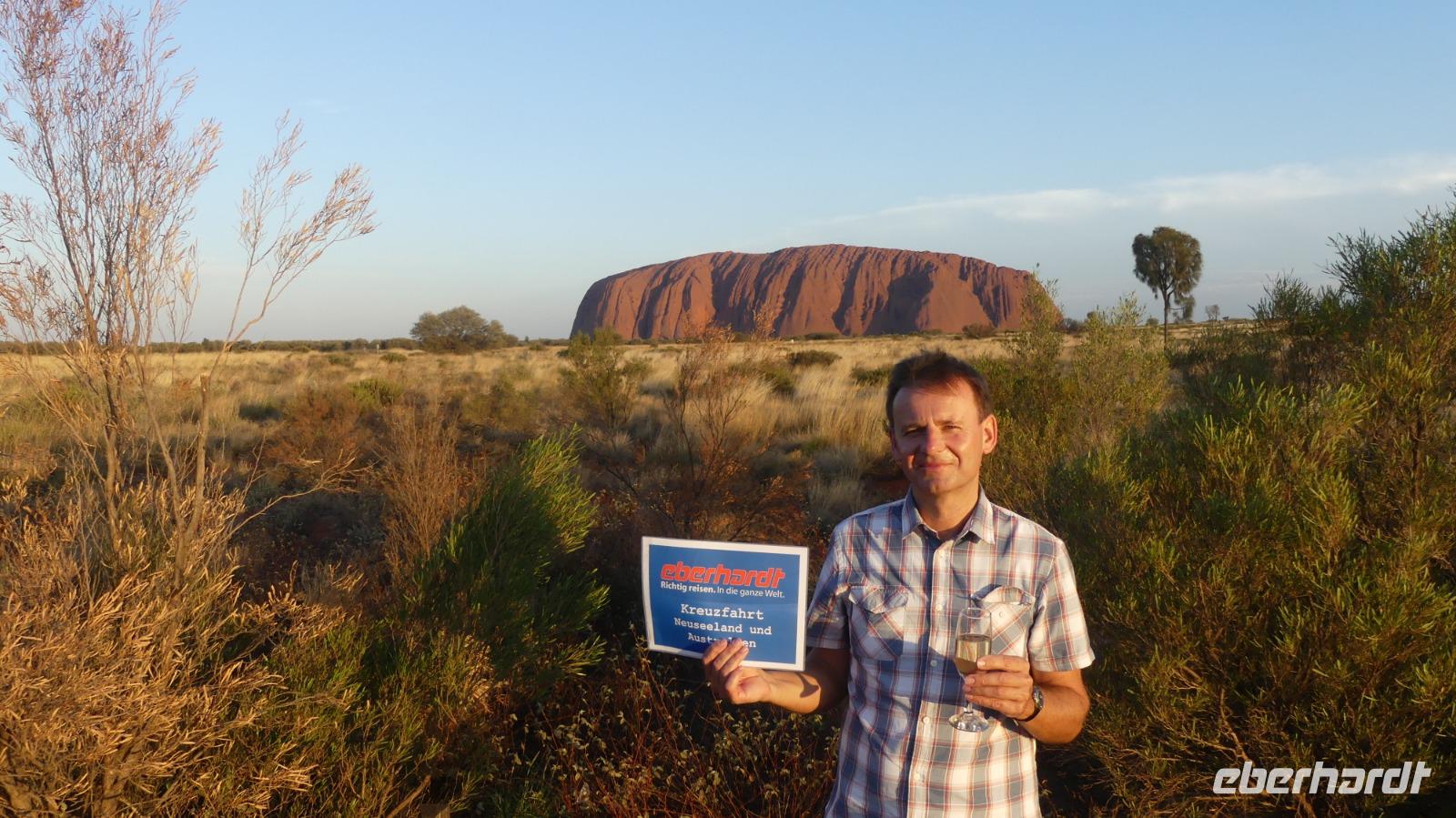 Nach verschiedenen Fotostopps kommen wir am frühen Nachmittag zum Hotel und ruhen uns erstmal aus, denn am Abend wollen wir ja noch zum Sonnenuntergang am Uluru. Diesen genießen wir dann bei einem Glas Sekt und einem kleinen Imbiss - ein schönes Naturschauspiel und wir haben Glück, dass uns Wolken nicht dieses Erlebnis nehmen.