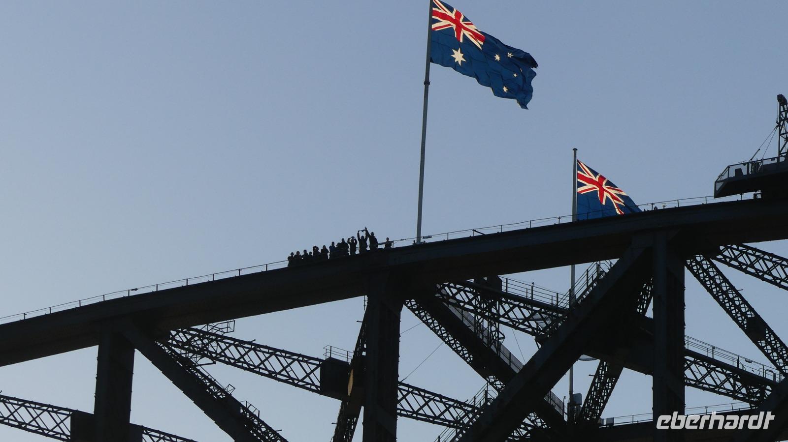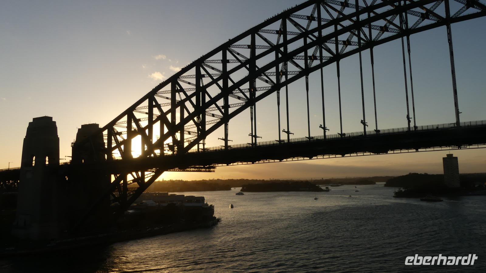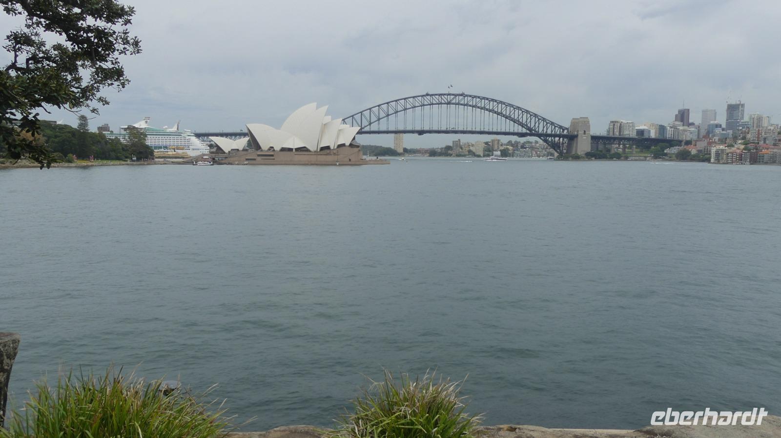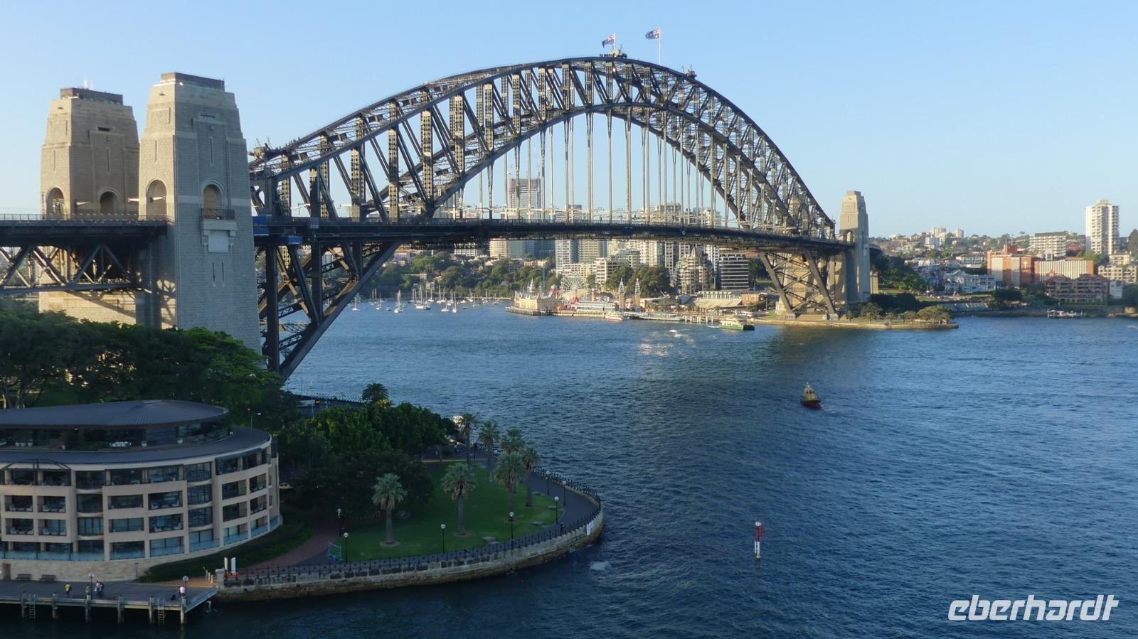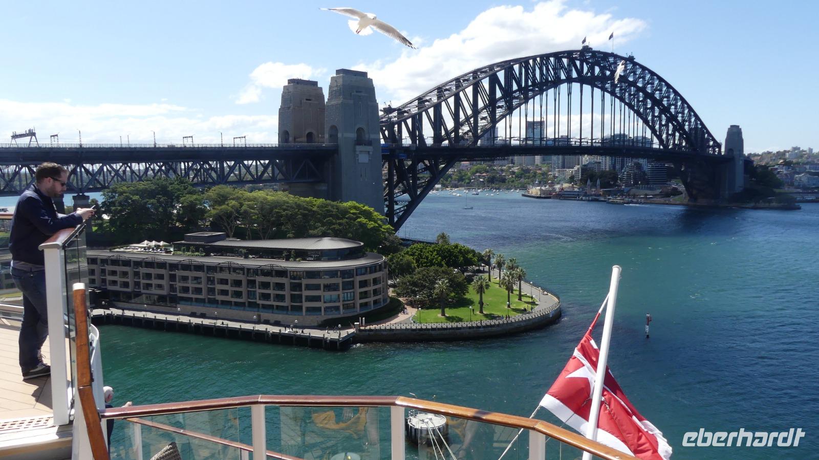 Wir beginnen den Tag ruhig. Bevor es an Bord geht, unternehmen wir am Vormittag einen Spaziergang auf die Harbour Bridge. Die Brücke wird von 6 Millionen Nieten zusammengehalten und wurde in nur 8 Jahren Bauzeit errichtet (für die Oper hat man 14 Jahre gebraucht). Nach der Fertigstellung wurde sie mit 96 Lokmotiven auf ihre Standfestigkeit getestet. Von der Brücke aus haben wir einen fantastischen Ausblick auf das berühmte Opernhaus, die Skyline und auf unser Kreuzfahrtschiff, welches am „schönsten Liegeplatz der Welt" (Reiseleiterin Uli zitiert) liegt.