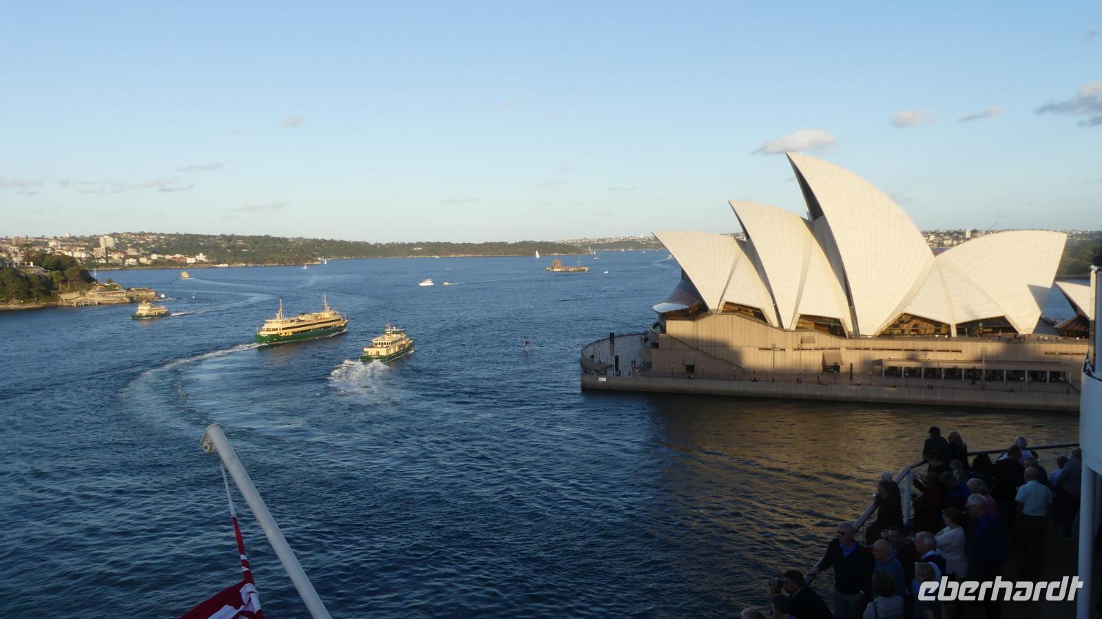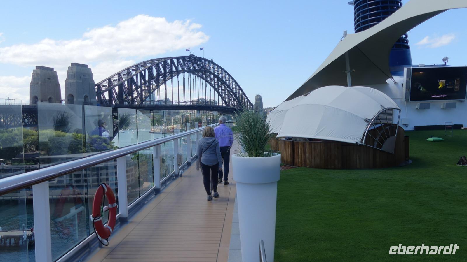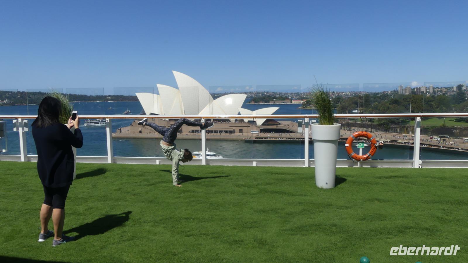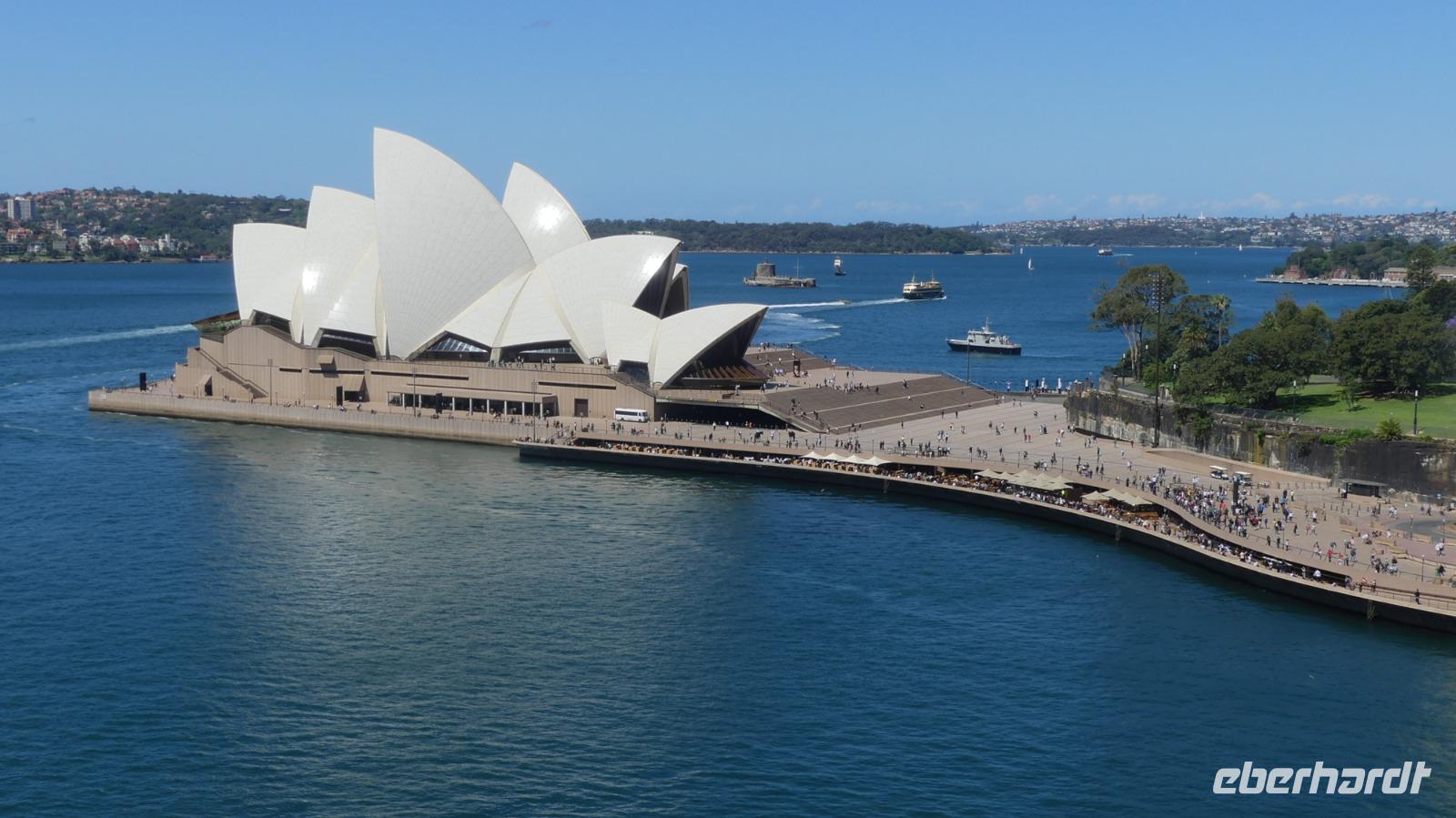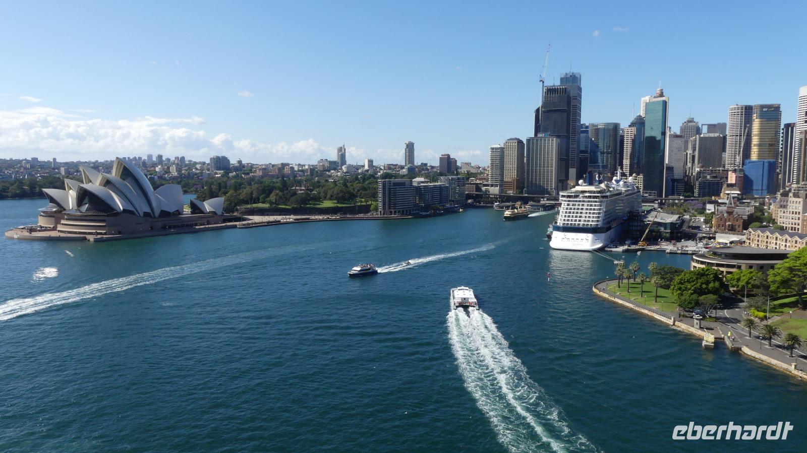 Wir beginnen den Tag ruhig. Bevor es an Bord geht, unternehmen wir am Vormittag einen Spaziergang auf die Harbour Bridge. Die Brücke wird von 6 Millionen Nieten zusammengehalten und wurde in nur 8 Jahren Bauzeit errichtet (für die Oper hat man 14 Jahre gebraucht). Nach der Fertigstellung wurde sie mit 96 Lokmotiven auf ihre Standfestigkeit getestet. Von der Brücke aus haben wir einen fantastischen Ausblick auf das berühmte Opernhaus, die Skyline und auf unser Kreuzfahrtschiff, welches am „schönsten Liegeplatz der Welt" (Reiseleiterin Uli zitiert) liegt.
