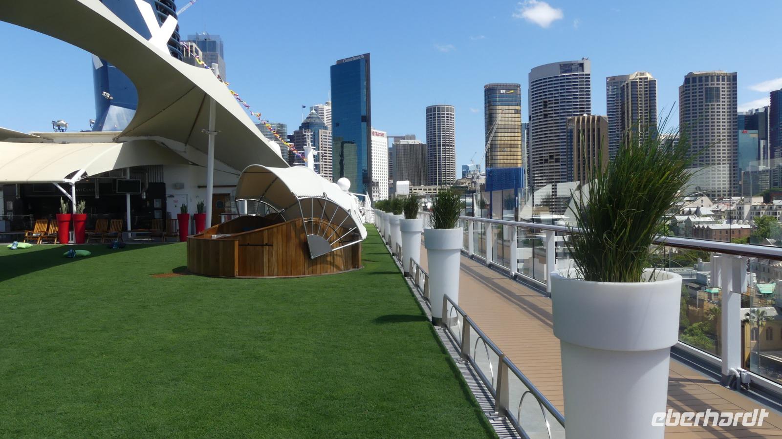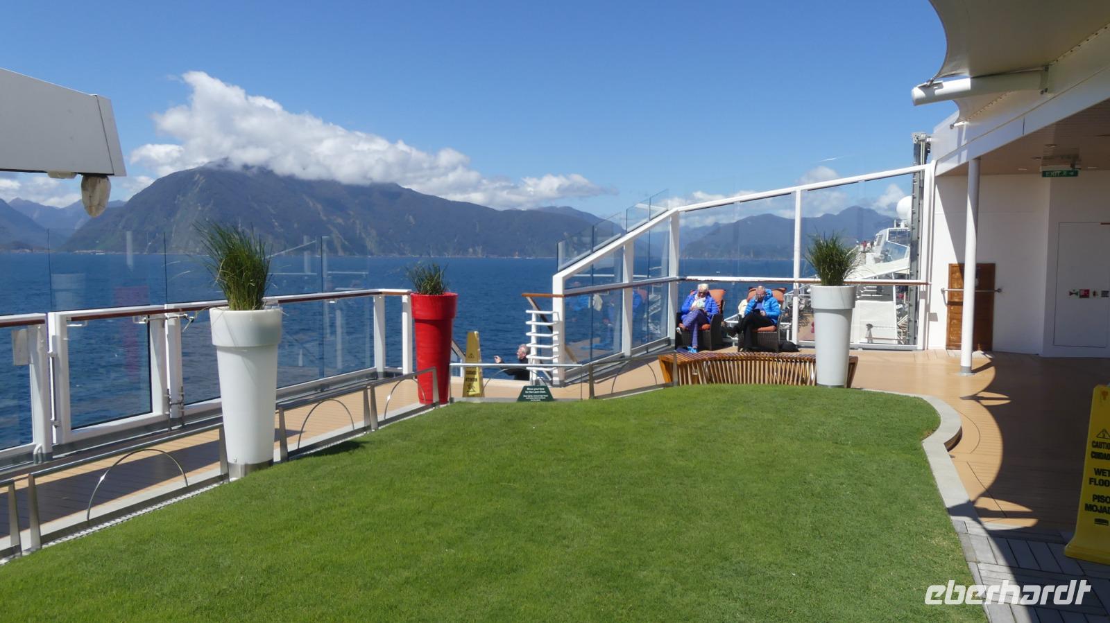 An Bord steht uns eine riesige Auswahl an Angeboten zur Verfügung, neben Innen- und Außenpools, Fitnessraum, Massage, diverse Kurse, Bibliothek, Unterhaltung im Theater und den Außendecks, Boggia auf 2.000 Quadratmeter Naturrasen. Aber ein Luxus, den ich sehr schätze (insbesondere wenn man andere Kreuzfahrtschiffe dieser Größe kennt) ist der Platz auf diesem Schiff - es gibt kaum Engpässe, kein Gedränge um Sitzplätze, Liegen oder Schlangen beim Essen, sehr angenehm!