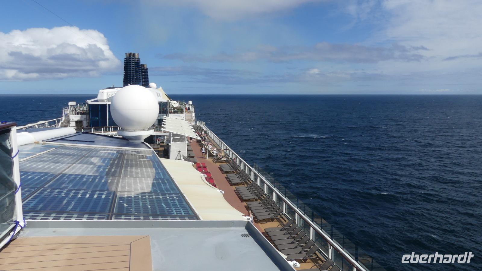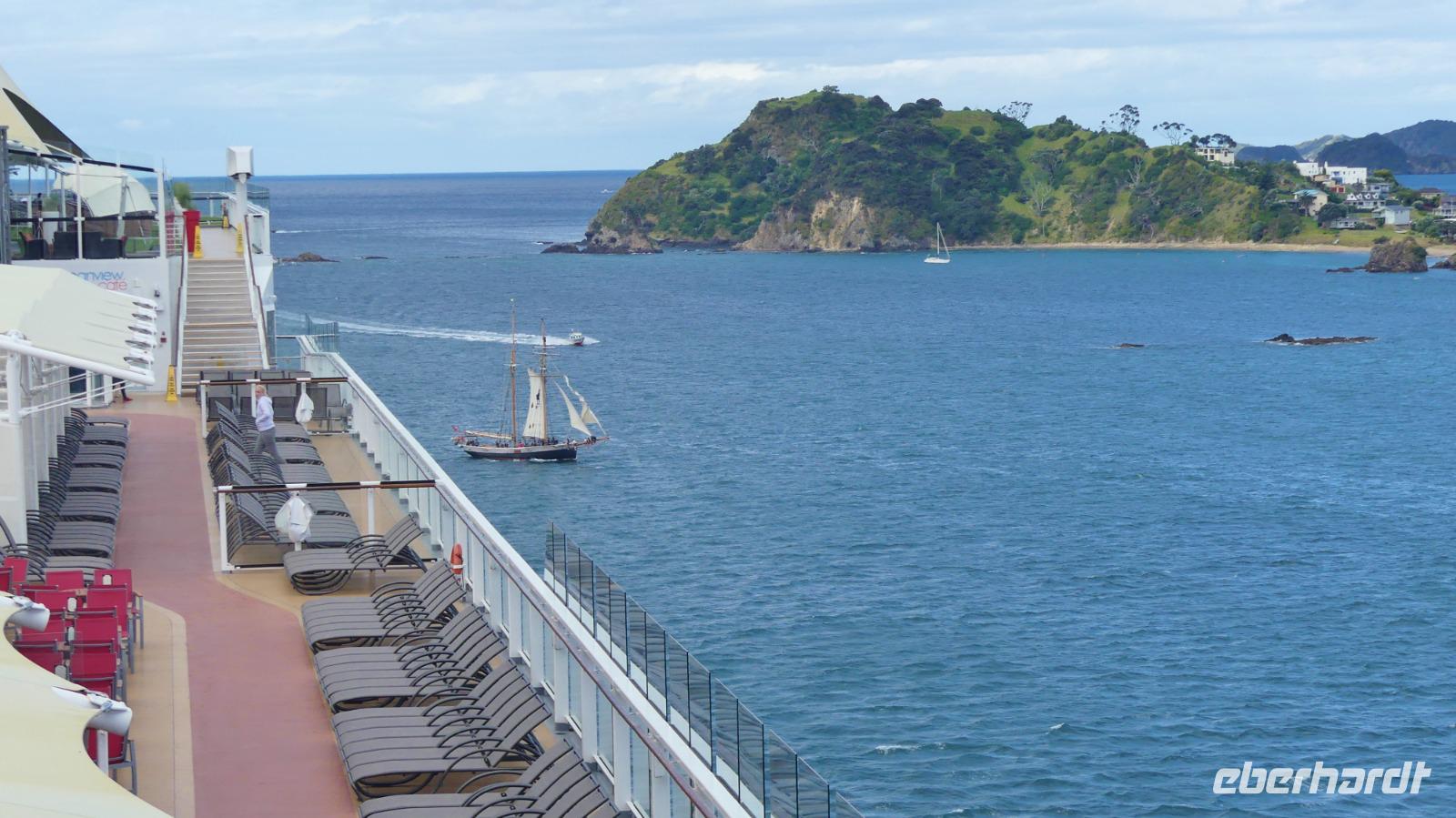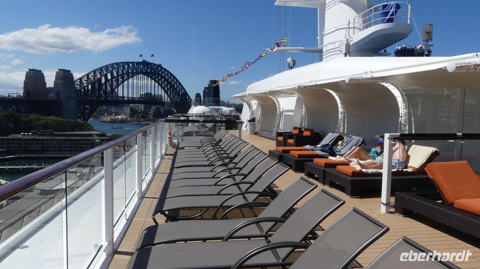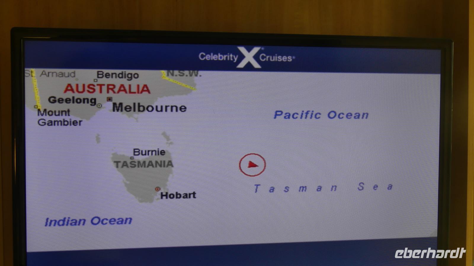 Die oft als rau beschriebene Tasmanische See zeigt sich am Sonntag von ihrer sanften Seite, 2,5 Meter Wellenhöhe ist harmlos, trotzdem meint der Kapitän, dass er die Stabilisatoren noch etwas weiter ausfährt. Dazu scheint die Sonne bei angenehmen Temperaturen. Bei den zahlreichen Angeboten kommt keine lange Weile auf. Es ist eher schwierig, außerhalb seiner Kabine einen ruhigen Ort zu finden. Gut dran ist, wer eine Balkonkabine hat.