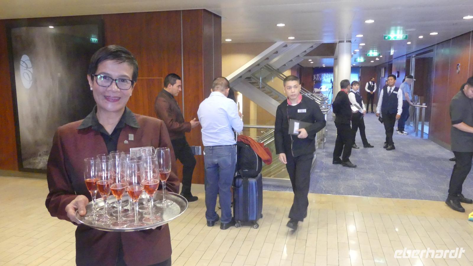 Dann ist es soweit. Auf Deck 5 werden wir mit einem freundlichen „Welcome" und einem Glas Sekt herzlich empfangen. Es geht gleich weiter auf Deck 14 zum Mittagsbuffet. Nach gefühlten 10 Minuten habe ich das Buffet abgelaufen und am Ende schon wieder vergessen, was es am Anfang gab, aber im Prinzip kann man sich kulinarisch durch die ganze Welt essen, vom deutschen Sauerkraut über Pizza und Pasta, asiatischer Küche usw. Nach dem Essen sind auch unsere Kabinen fertig und die Koffer angeliefert. Wir sind also ganz entspannt an Bord angekommen, aus meiner Sicht verlief alles viel einfacher als gedacht. Nun heißt es für uns, das Schiff zu erkunden, sich zu orientieren, ankommen. Es wird nicht lang dauern, dann kennen wir uns hier super aus und jeder hat sich eingerichtet.