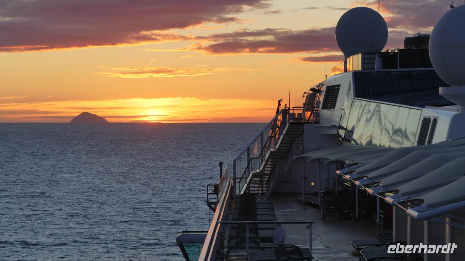 Zum Sonnenuntergang gehe ich nochmal an Deck. Ein Albatros dreht seine Runden dicht über dem Meer. Richtung Süden ist Stewart Island zu sehen. In einigen Minuten werden wir den südlichsten Punkt Neuseelands (Südspitze der Südinsel) passieren. Ein wunderschöner Tag geht zu Ende.