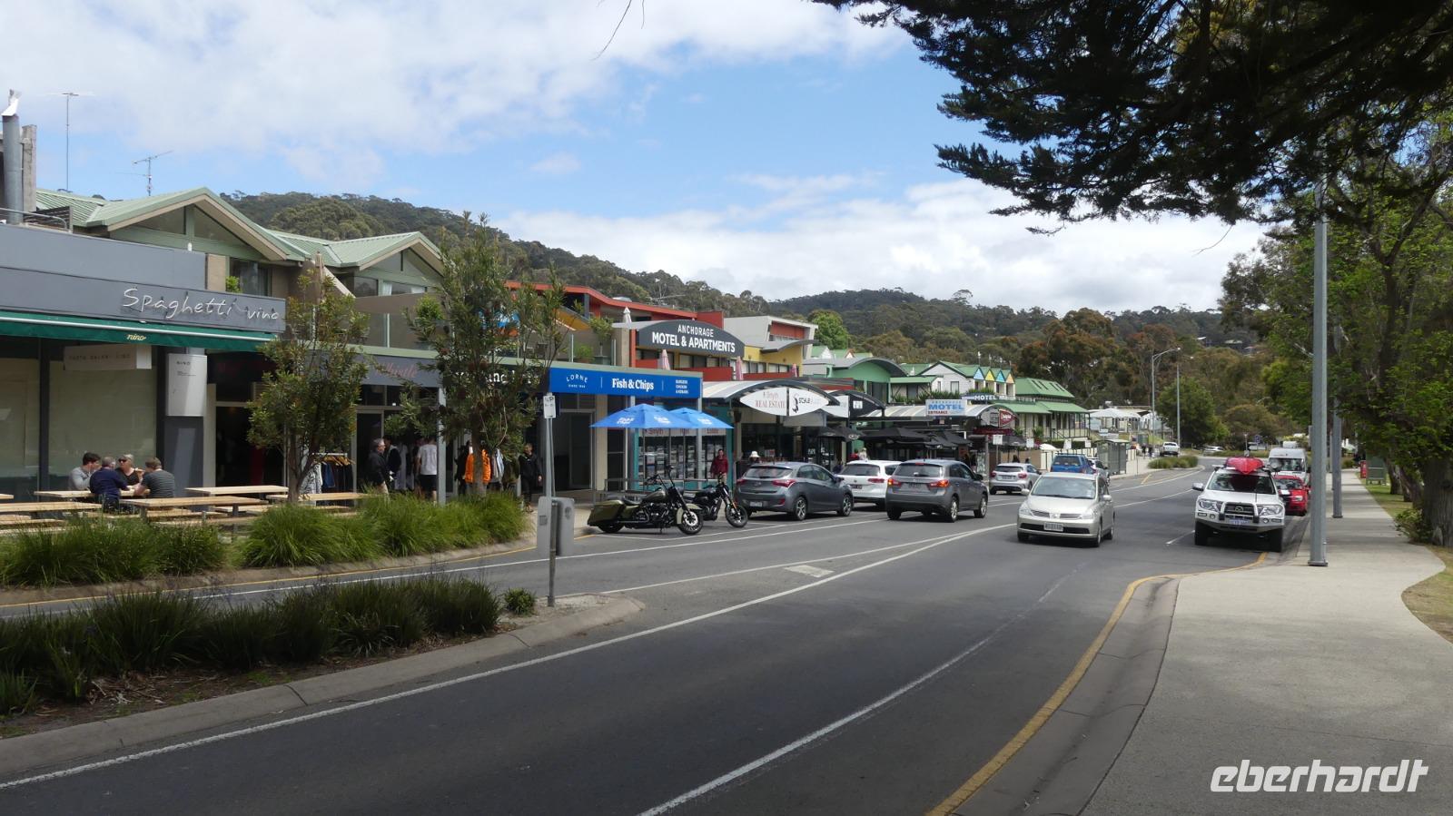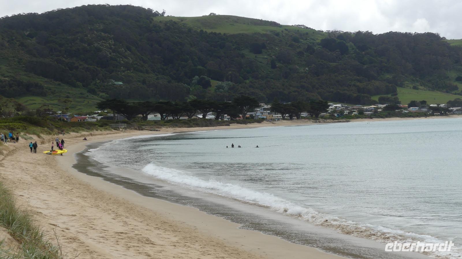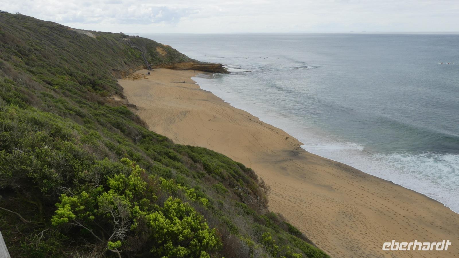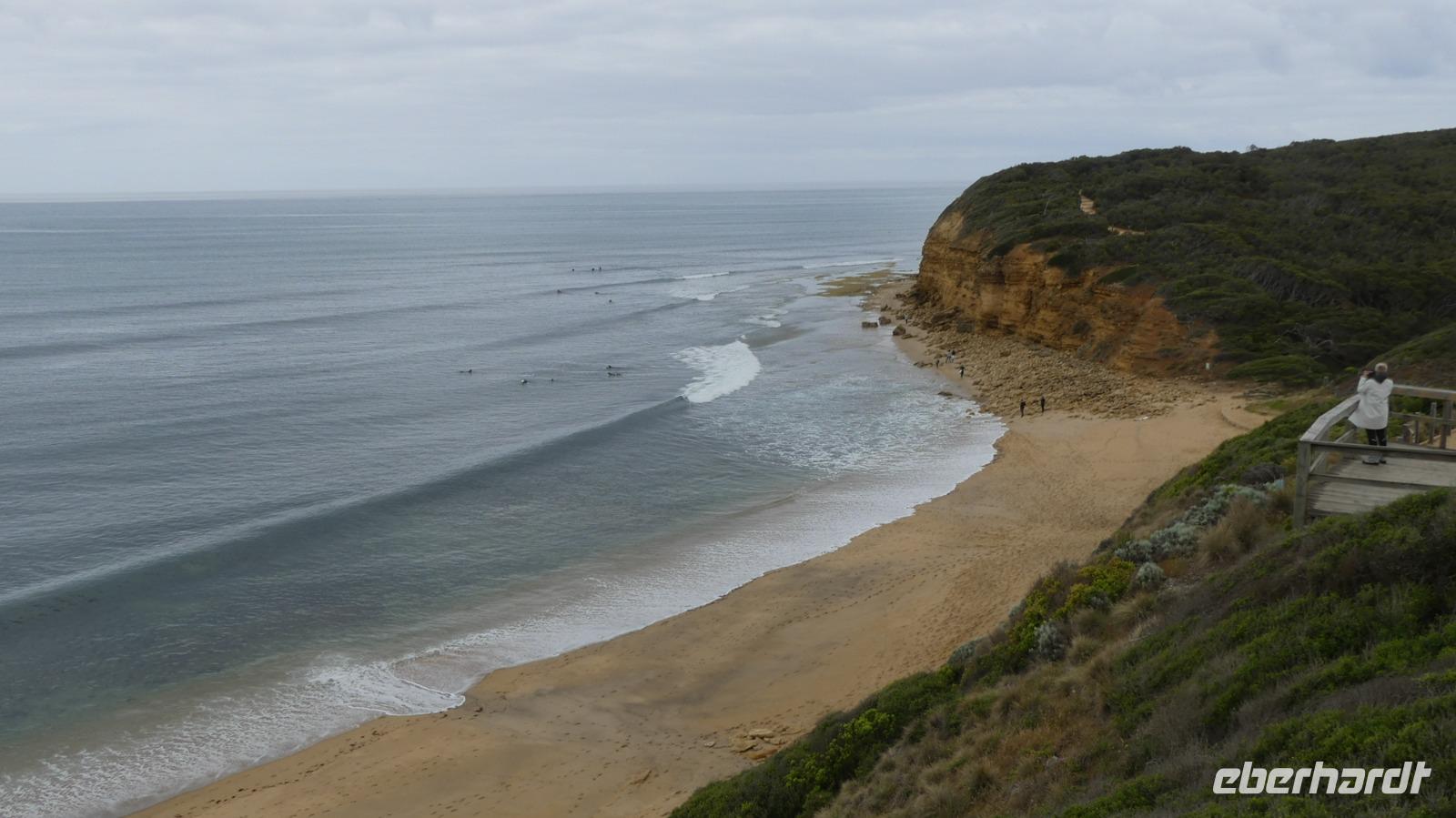 Bis zur eigentlichen Great Ocean Road, welche in Torquay beginnt, benötigen wir fast zwei Stunden. Torquay ist als beliebtes Surfrevier bekannt (wir würden es als Wellenreiten bezeichnen) und Ausrichter von internationalen Wettkämpfen. Nach einem Halt an der Steilküste von Torquay folgen wir der berühmten kurvenreichen Küstenstraße weiter Richtung Westen. Inzwischen habe ich auch die Möglichkeit, Lauriens Erläuterungen für uns zu übersetzen. Oft berichtet Laurien von Buschbränden, die um die Weihnachtsfeiertage der letzten Jahre, also in der absoluten Hochsaison für Chaos und Zerstörung gesorgt haben. An der Küste passieren wir verschiedene hübsche Küstenorte wie Anglesea oder Lorne. Lorne ist auch unser nächster Halt. Gleichzeitig eine gute Möglichkeit, kostenfreies WLAN zu nutzen und ein paar Nachrichten abzuschicken. Schließlich erreichen wir Apollo Bay, wo wir im Strandpark unser Mittagspicknick haben.