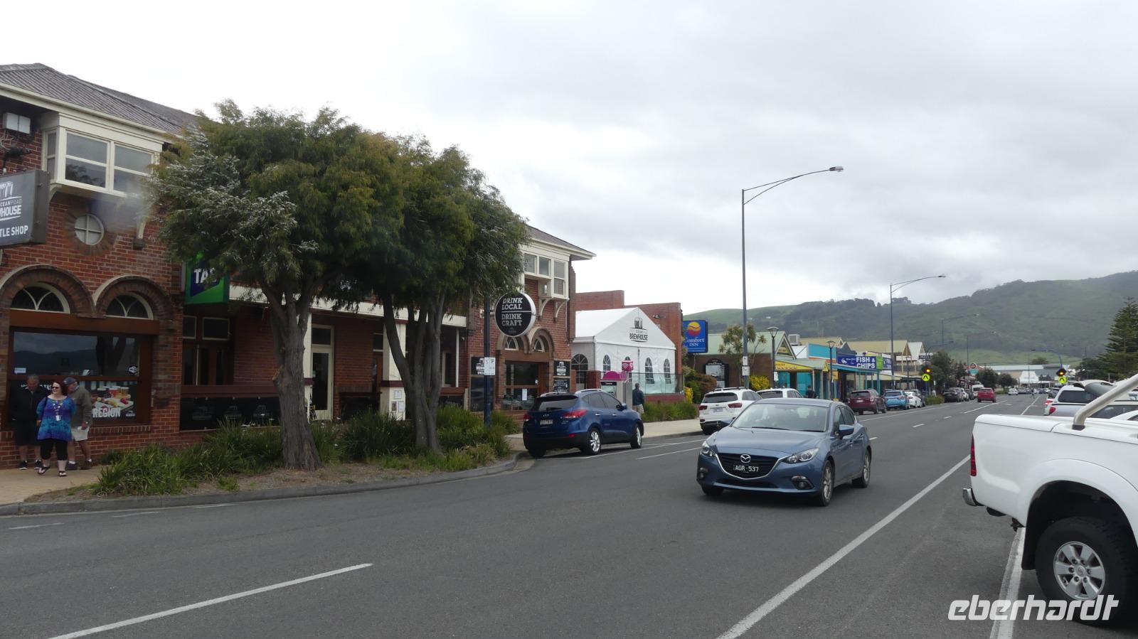In Dunedin fahren wir durch die Innenstadt und kommen am zentralen Platz, dem Octagon vorbei. Wie der Name andeutet, ist der Grundriss des Platzes in Form eines Achteckes angelegt.