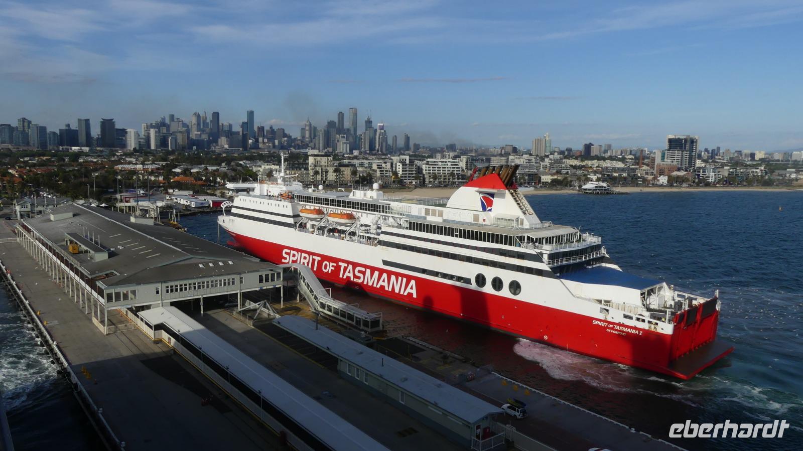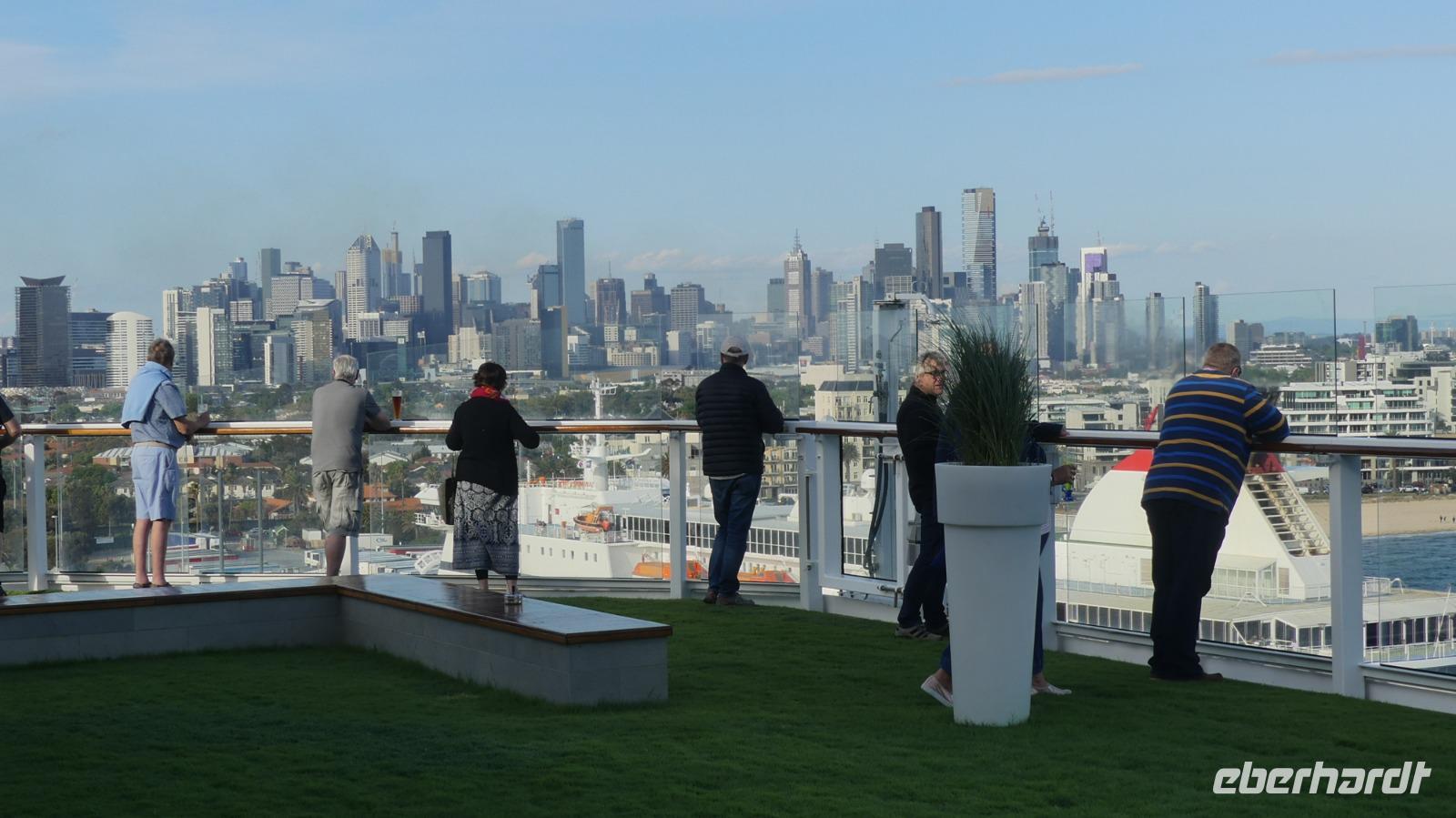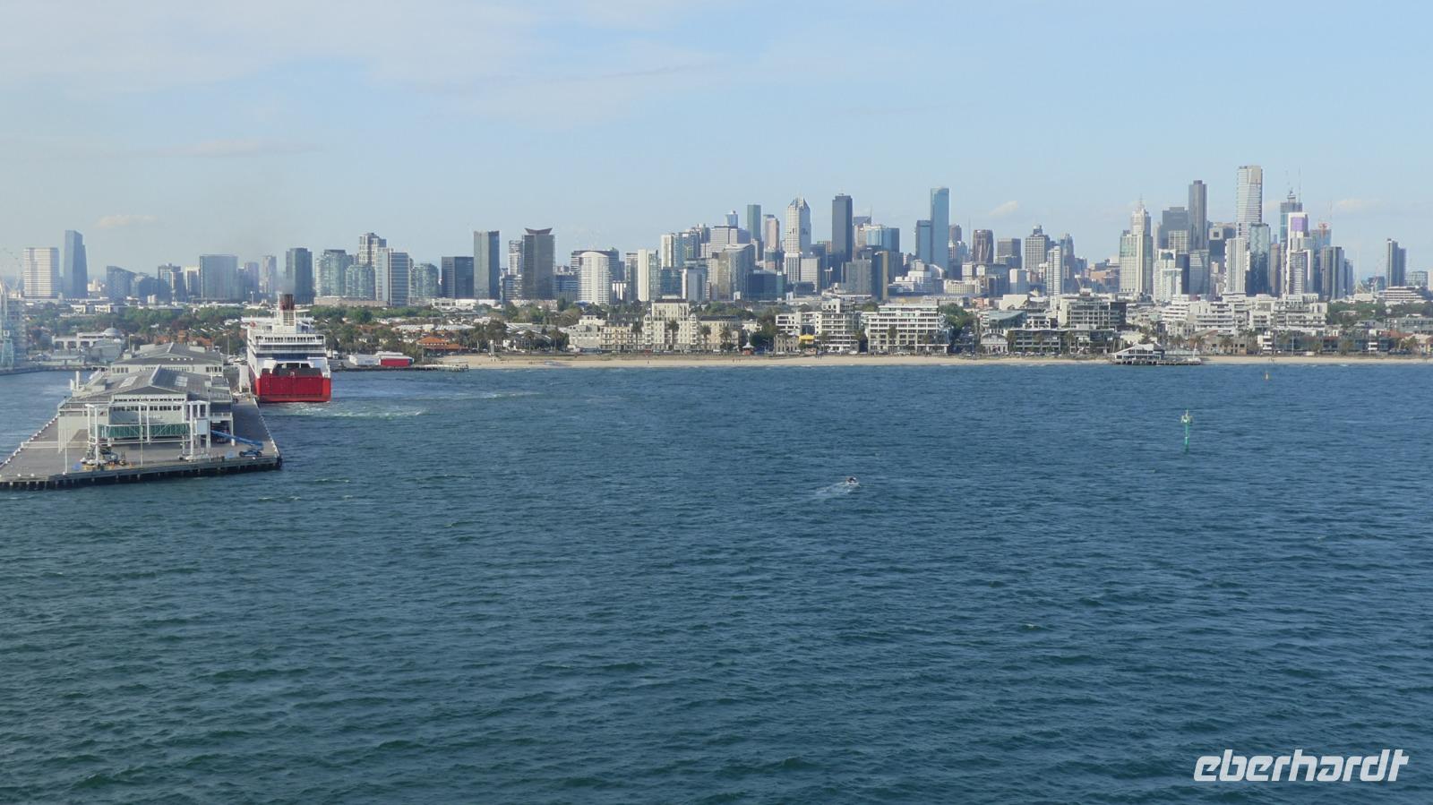 Pünktlich um 17.30 Uhr erreichen wir unser Schiff. Doch die Crew ist schon ganz aufgeregt, weil wir 18.00 Uhr ablegen wollen und unser Bus der letzte ist. Während der Ausfahrt strahlt die Sonne, die uns tagsüber gefehlt hat. Noch ein letzter Blick auf die Skyline von Melbourne, dann ruft das Abendbuffet. Damit endet unser Besuch in Australien, was uns heute noch gar nicht so richtig bewusst ist. In Vorbereitung auf die nächste Zeitzone werden die Uhren in der kommenden Nacht um eine weitere Stunde auf 11 Stunden vor Deutschland gestellt.