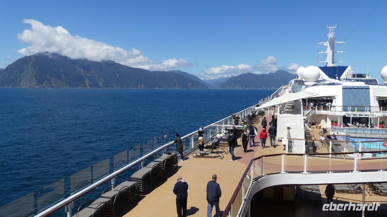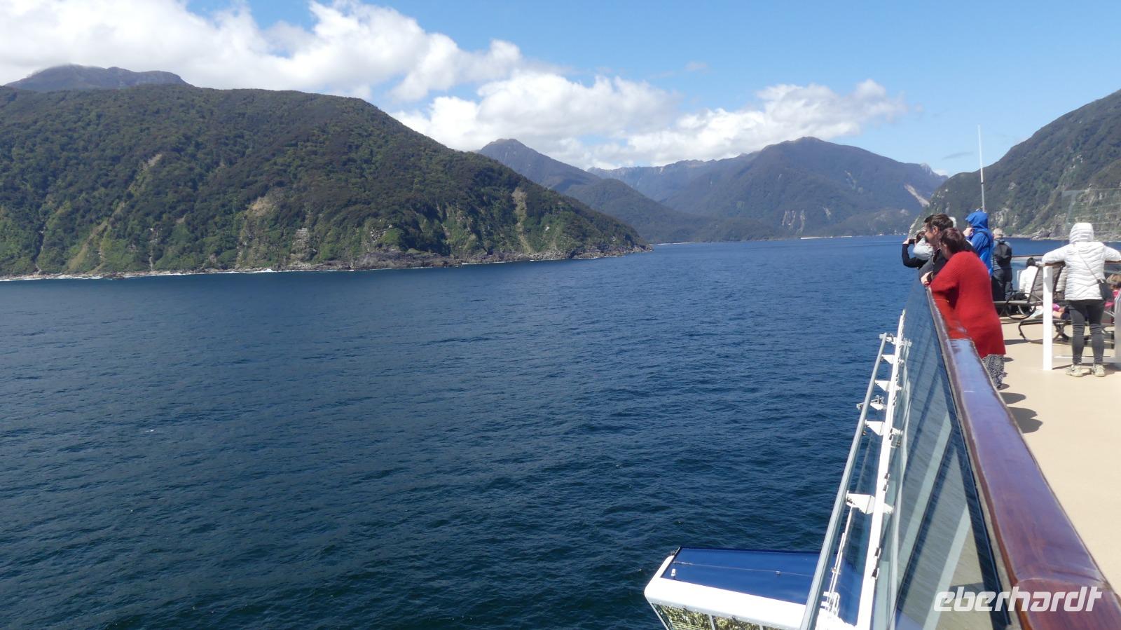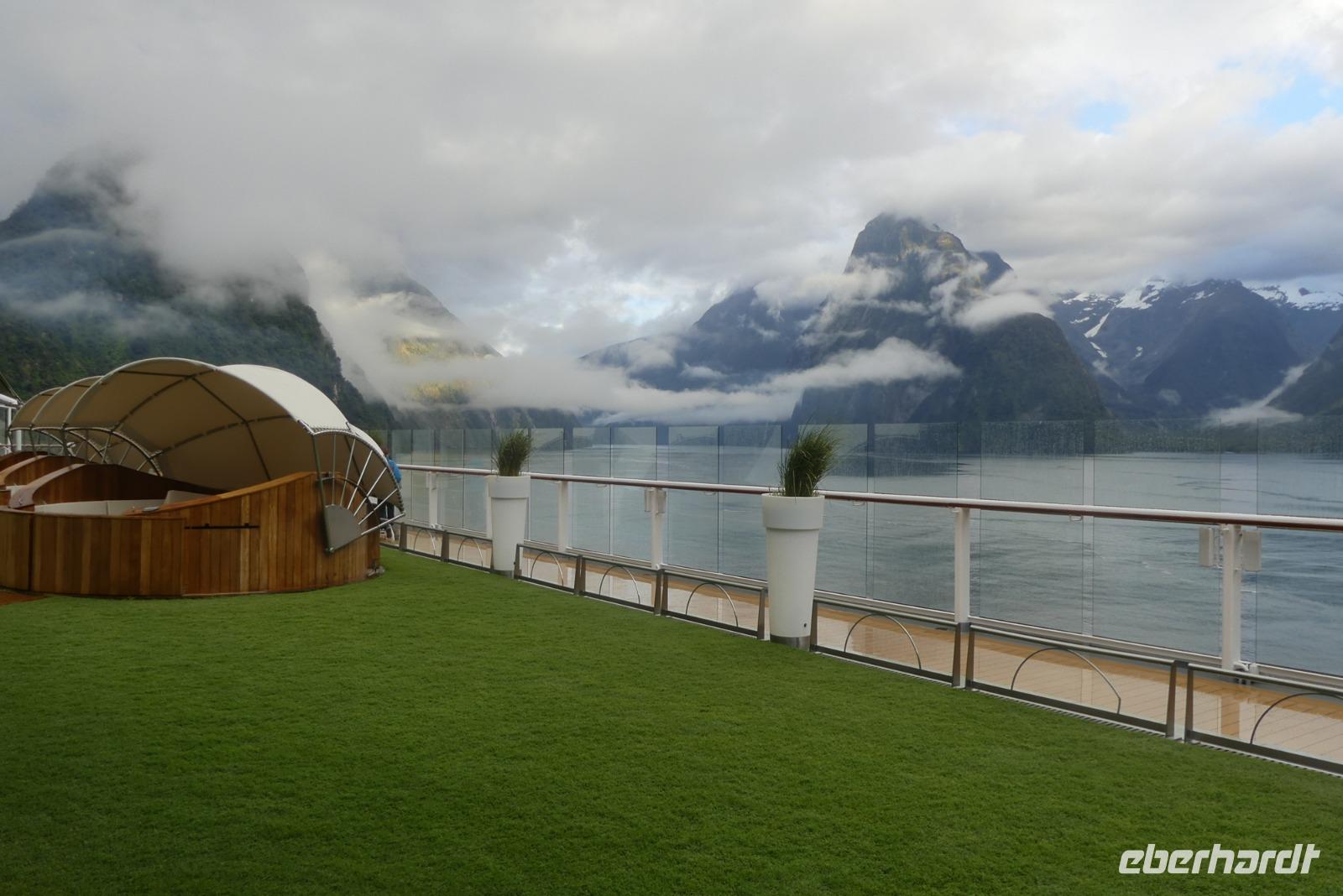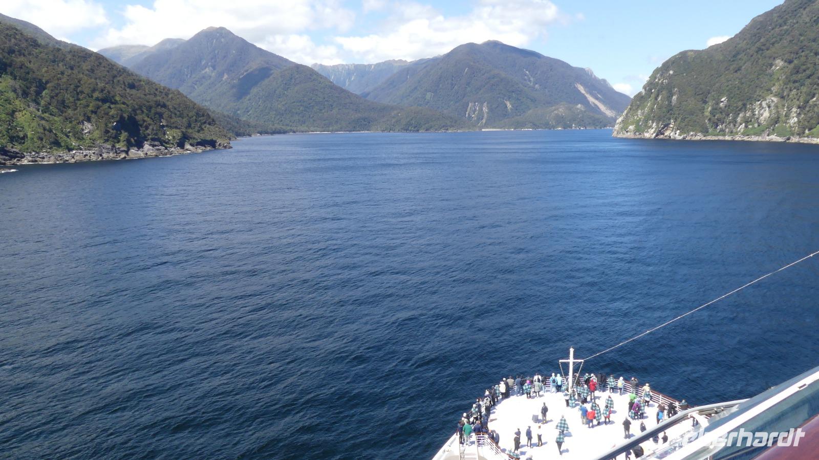 Inzwischen haben wir den mit 15 Kilometer eher kleinen Milford Sound verlassen und ich sitze gerade auf Deck 14 in der Sky Lounge. Ein paar Dekorationswolken zieren die grünen Küstenberge. Eine Landschaft wie im Film, ich denke da an Avatar oder Jurassic Park, die hier zum Teil gedreht wurden. Das schwer zugängliche Küstenland mit dichten Wäldern und hohen Bergen ist zu großen Teilen unerschlossen und weitgehend nur auf dem Seeweg zugänglich. Über Stunden keine Spuren, die Menschen hinterlassen haben, keine Straße, kein Haus, kein Funkmast, kein Windrad, keine Siedlung, über Stunden nicht einmal ein anderes Schiff. So eine Region bereisen zu können ist schon etwas ganz Besonderes und deshalb betrachte ich diesen Kreuzfahrttag als ganz großes Glück.