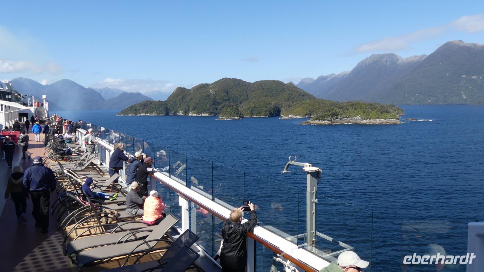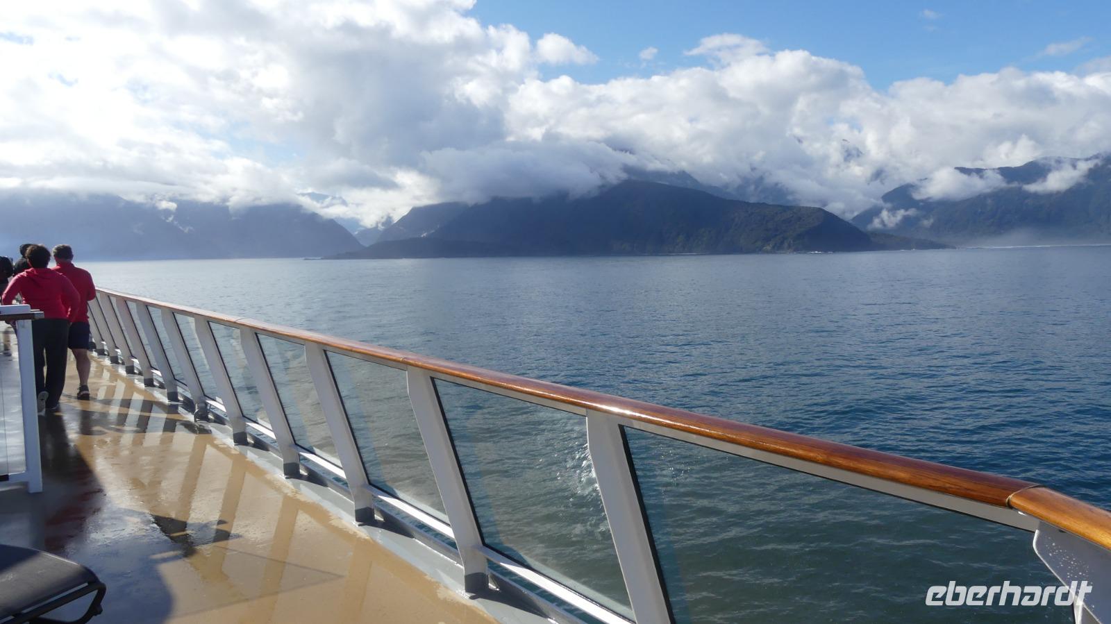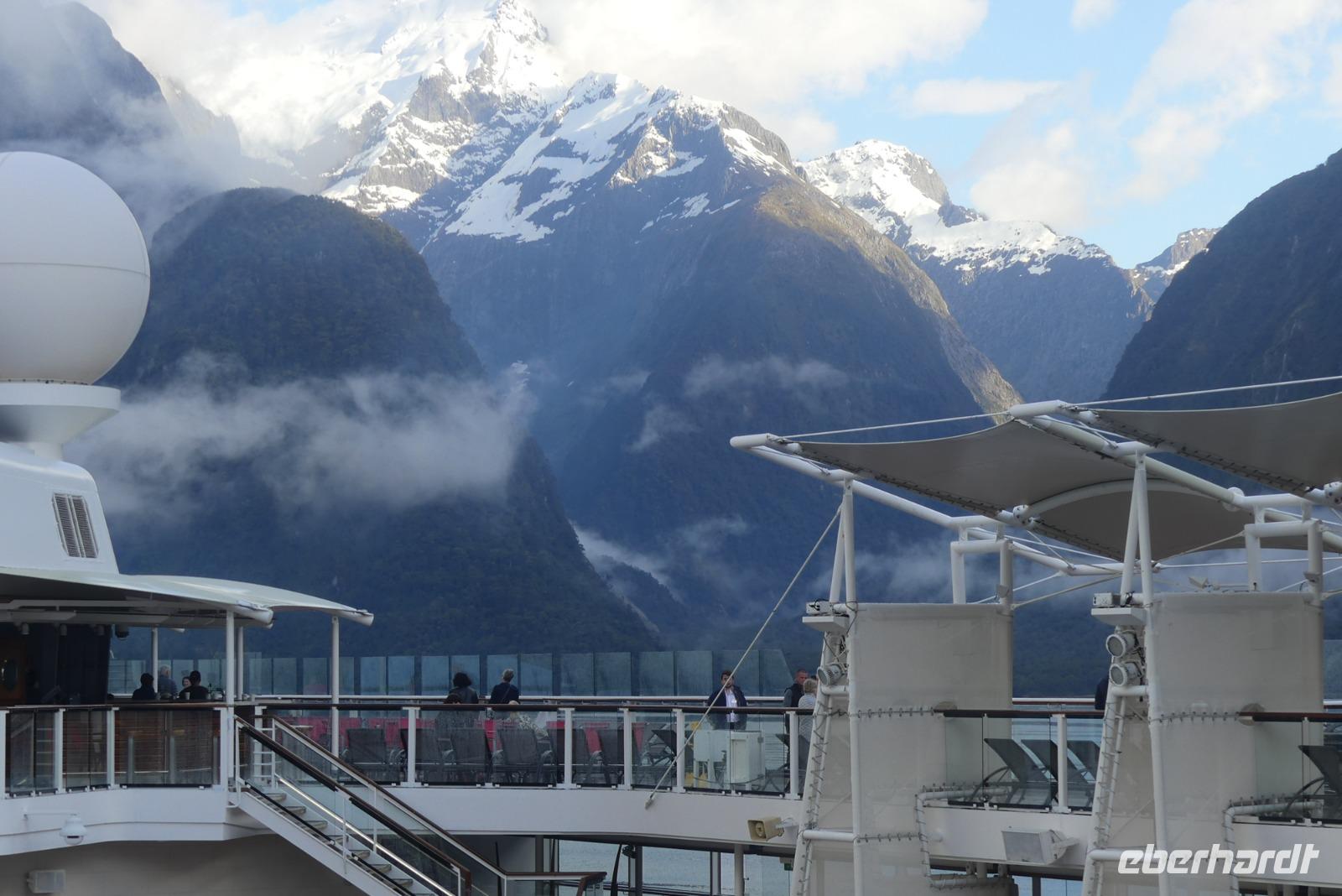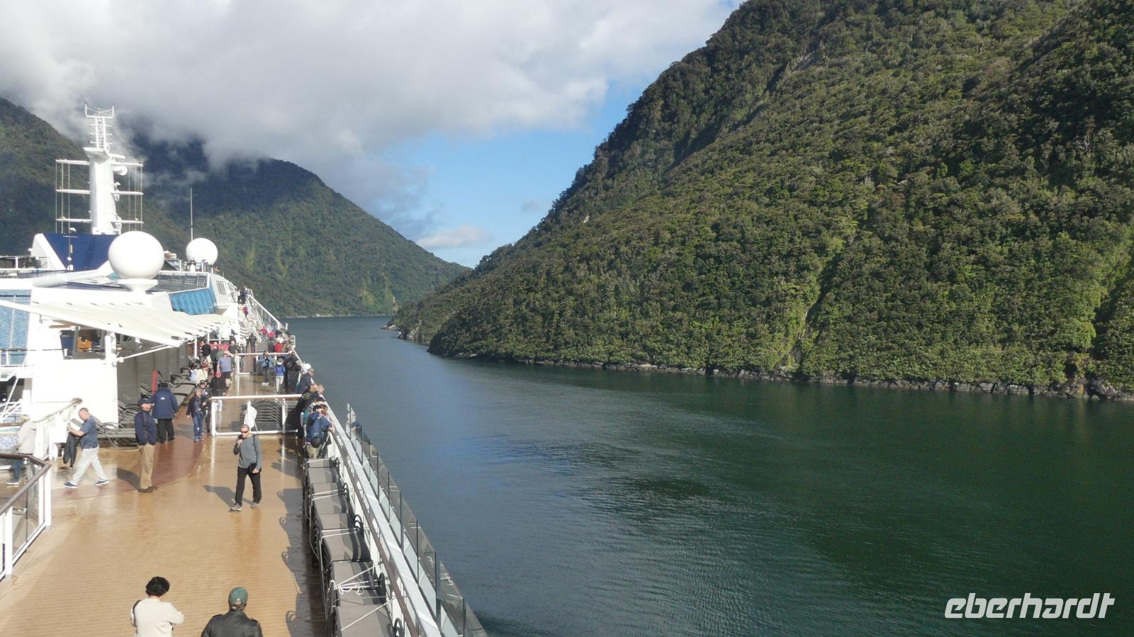 Inzwischen haben wir den mit 15 Kilometer eher kleinen Milford Sound verlassen und ich sitze gerade auf Deck 14 in der Sky Lounge. Ein paar Dekorationswolken zieren die grünen Küstenberge. Eine Landschaft wie im Film, ich denke da an Avatar oder Jurassic Park, die hier zum Teil gedreht wurden. Das schwer zugängliche Küstenland mit dichten Wäldern und hohen Bergen ist zu großen Teilen unerschlossen und weitgehend nur auf dem Seeweg zugänglich. Über Stunden keine Spuren, die Menschen hinterlassen haben, keine Straße, kein Haus, kein Funkmast, kein Windrad, keine Siedlung, über Stunden nicht einmal ein anderes Schiff. So eine Region bereisen zu können ist schon etwas ganz Besonderes und deshalb betrachte ich diesen Kreuzfahrttag als ganz großes Glück.