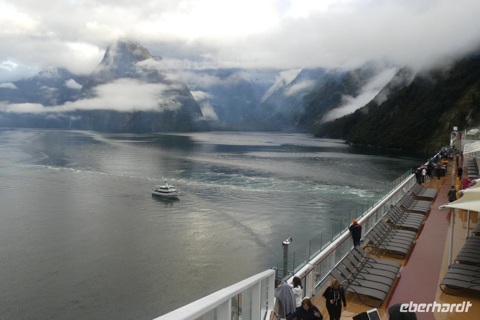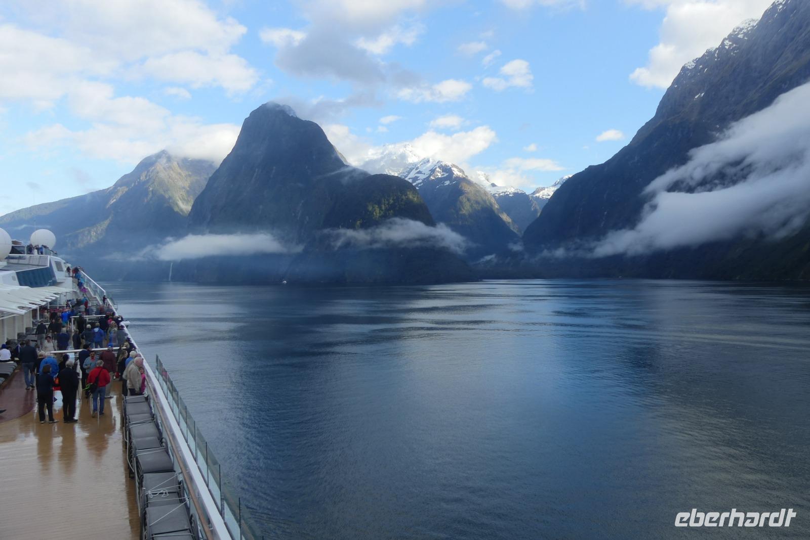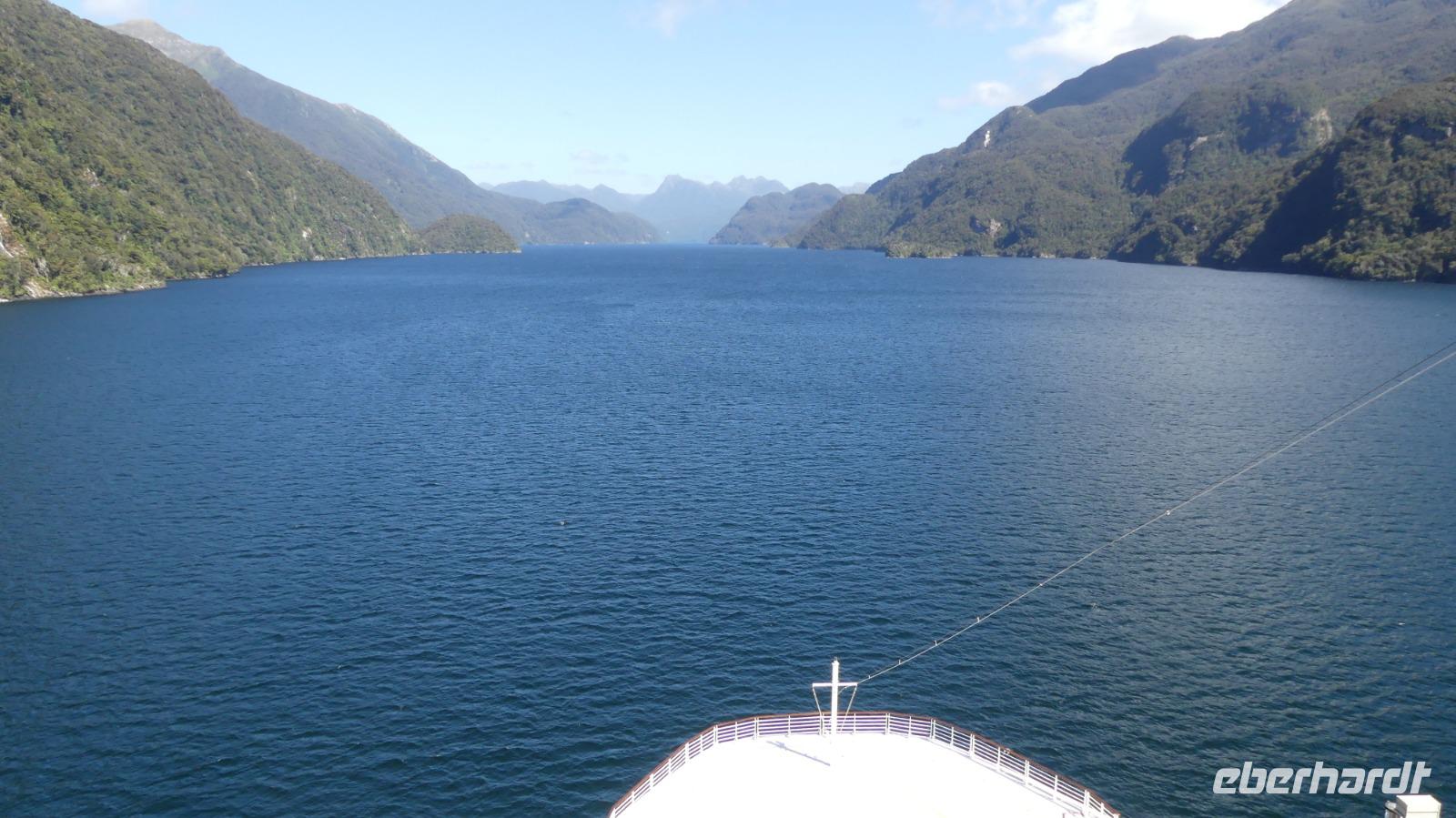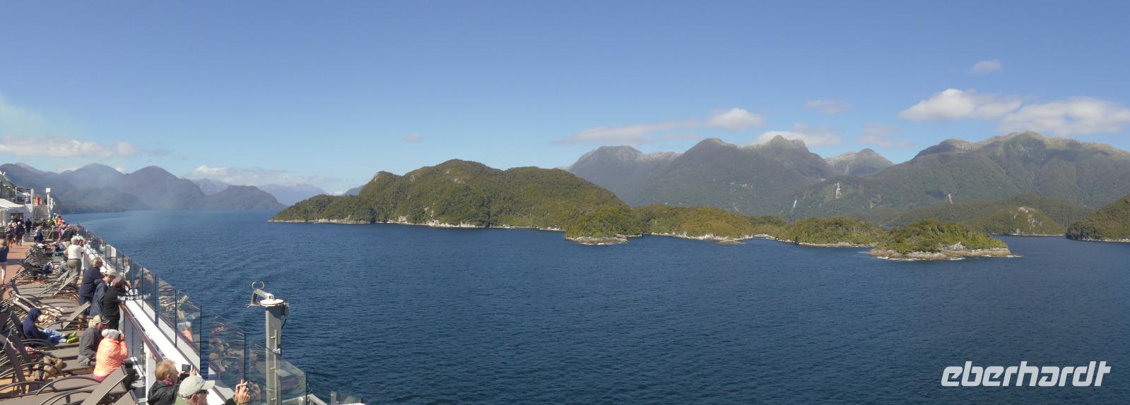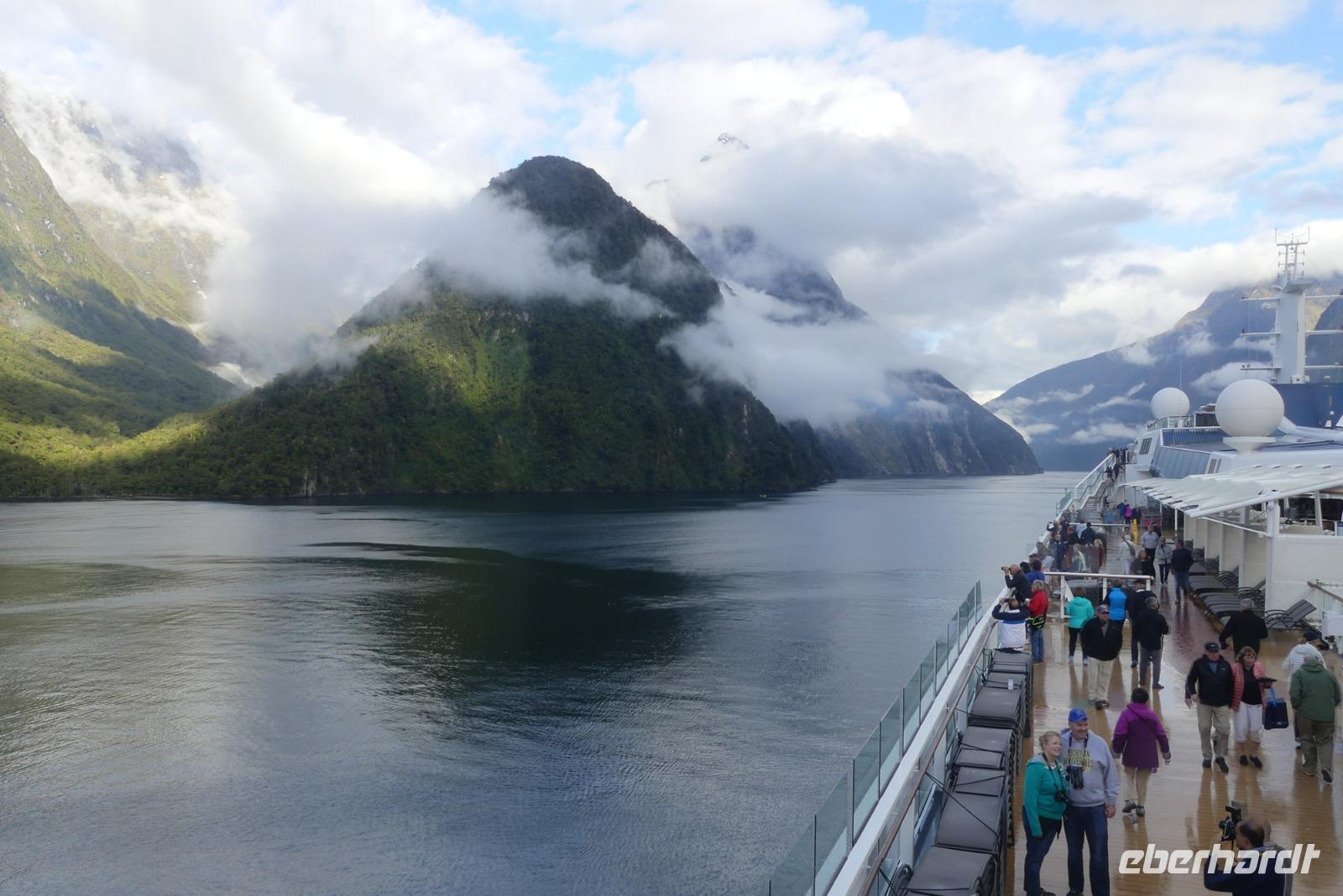 Inzwischen haben wir den mit 15 Kilometer eher kleinen Milford Sound verlassen und ich sitze gerade auf Deck 14 in der Sky Lounge. Ein paar Dekorationswolken zieren die grünen Küstenberge. Eine Landschaft wie im Film, ich denke da an Avatar oder Jurassic Park, die hier zum Teil gedreht wurden. Das schwer zugängliche Küstenland mit dichten Wäldern und hohen Bergen ist zu großen Teilen unerschlossen und weitgehend nur auf dem Seeweg zugänglich. Über Stunden keine Spuren, die Menschen hinterlassen haben, keine Straße, kein Haus, kein Funkmast, kein Windrad, keine Siedlung, über Stunden nicht einmal ein anderes Schiff. So eine Region bereisen zu können ist schon etwas ganz Besonderes und deshalb betrachte ich diesen Kreuzfahrttag als ganz großes Glück.