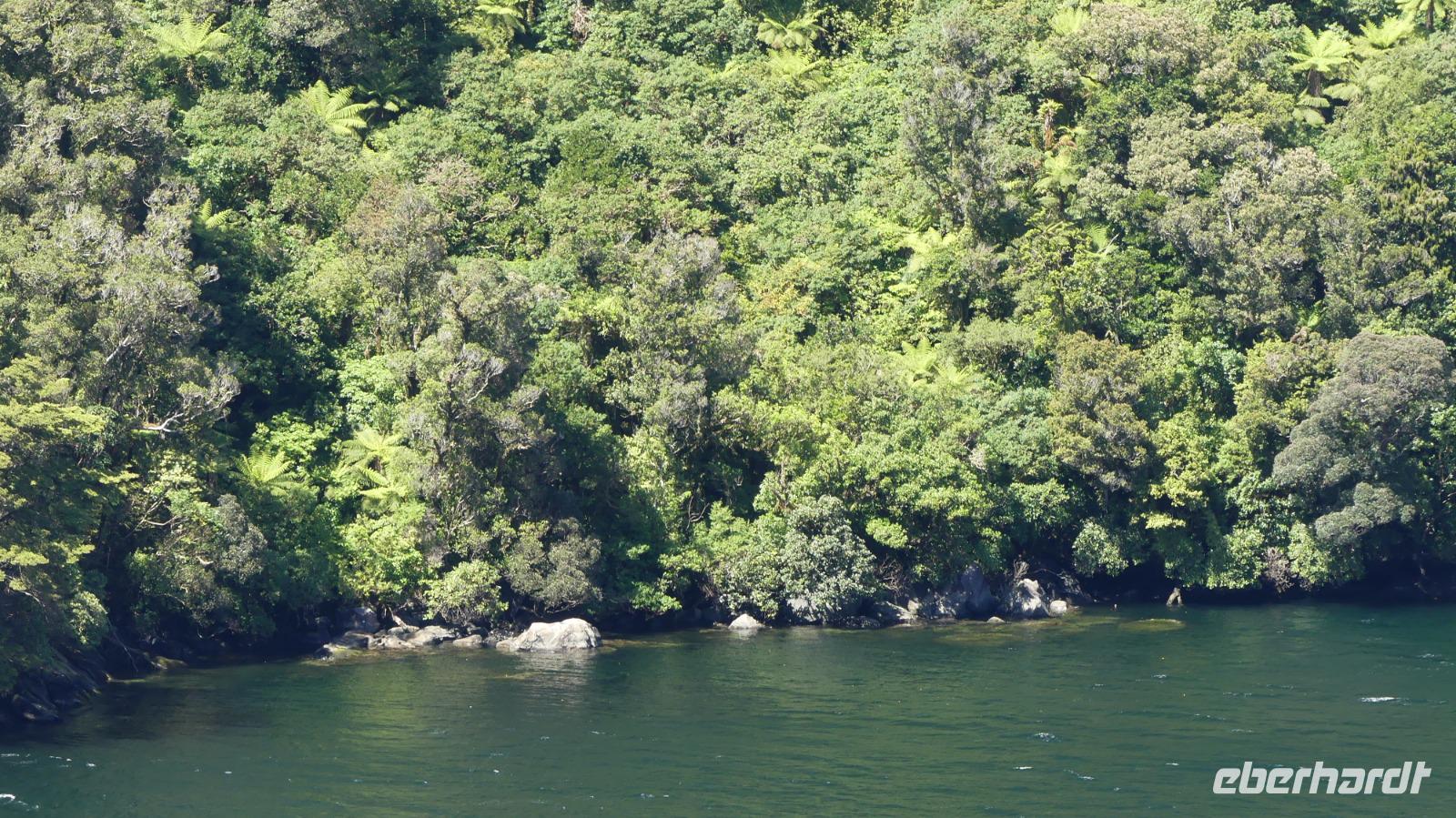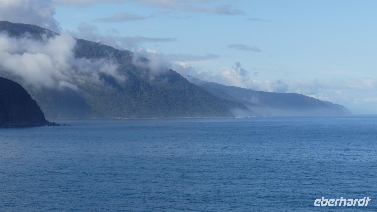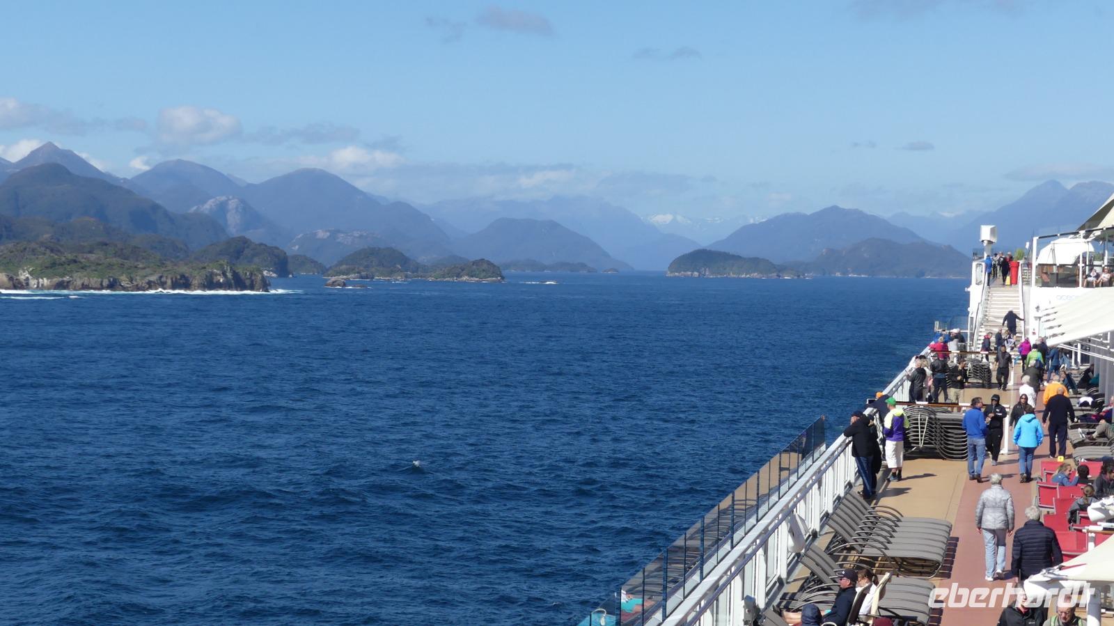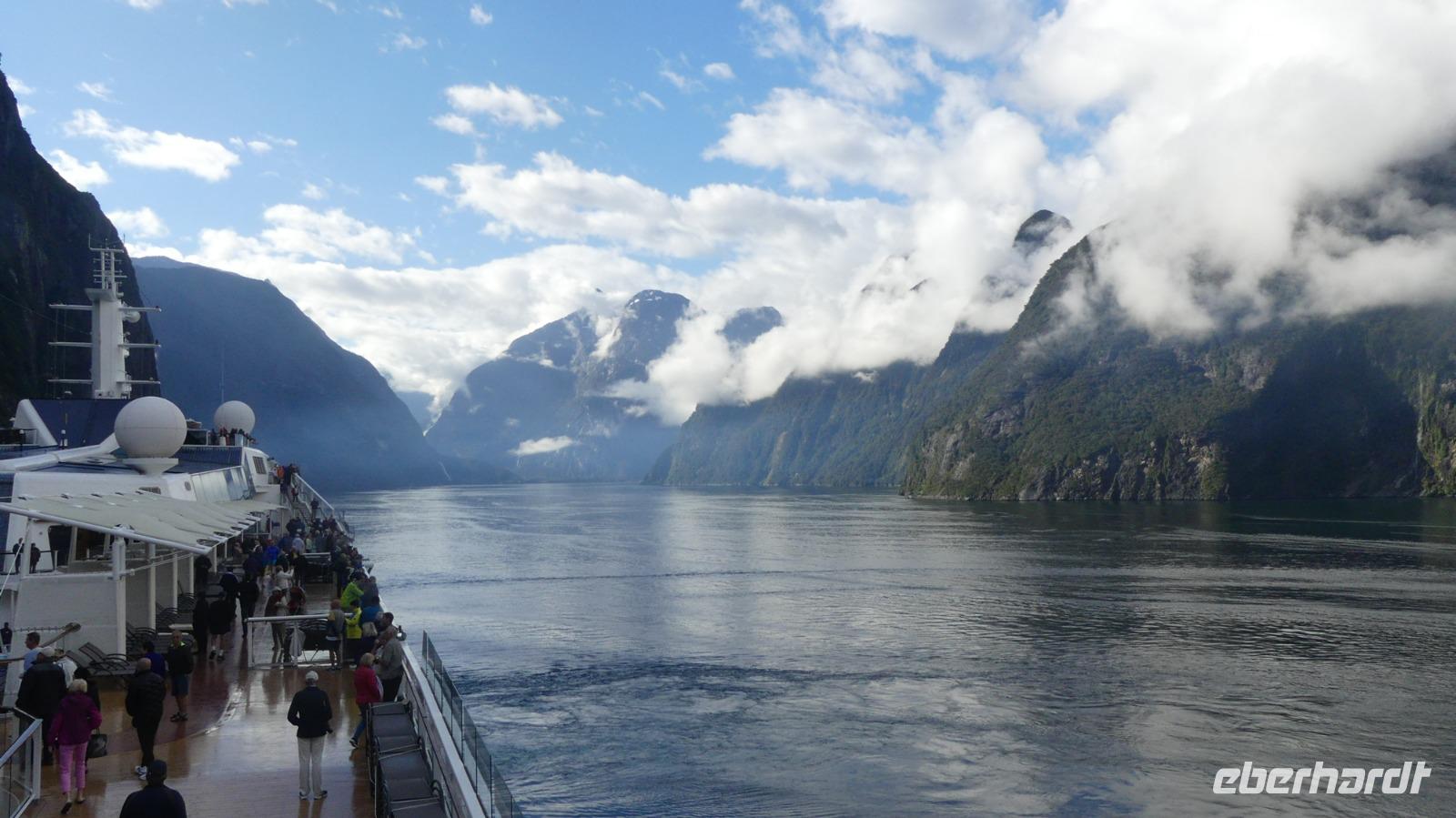 Inzwischen haben wir den mit 15 Kilometer eher kleinen Milford Sound verlassen und ich sitze gerade auf Deck 14 in der Sky Lounge. Ein paar Dekorationswolken zieren die grünen Küstenberge. Eine Landschaft wie im Film, ich denke da an Avatar oder Jurassic Park, die hier zum Teil gedreht wurden. Das schwer zugängliche Küstenland mit dichten Wäldern und hohen Bergen ist zu großen Teilen unerschlossen und weitgehend nur auf dem Seeweg zugänglich. Über Stunden keine Spuren, die Menschen hinterlassen haben, keine Straße, kein Haus, kein Funkmast, kein Windrad, keine Siedlung, über Stunden nicht einmal ein anderes Schiff. So eine Region bereisen zu können ist schon etwas ganz Besonderes und deshalb betrachte ich diesen Kreuzfahrttag als ganz großes Glück.