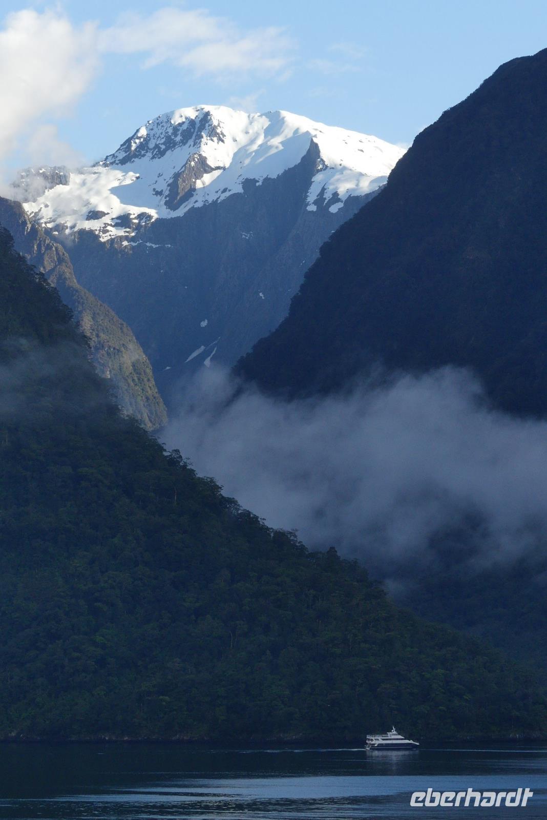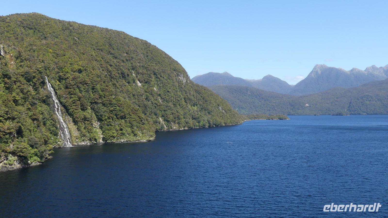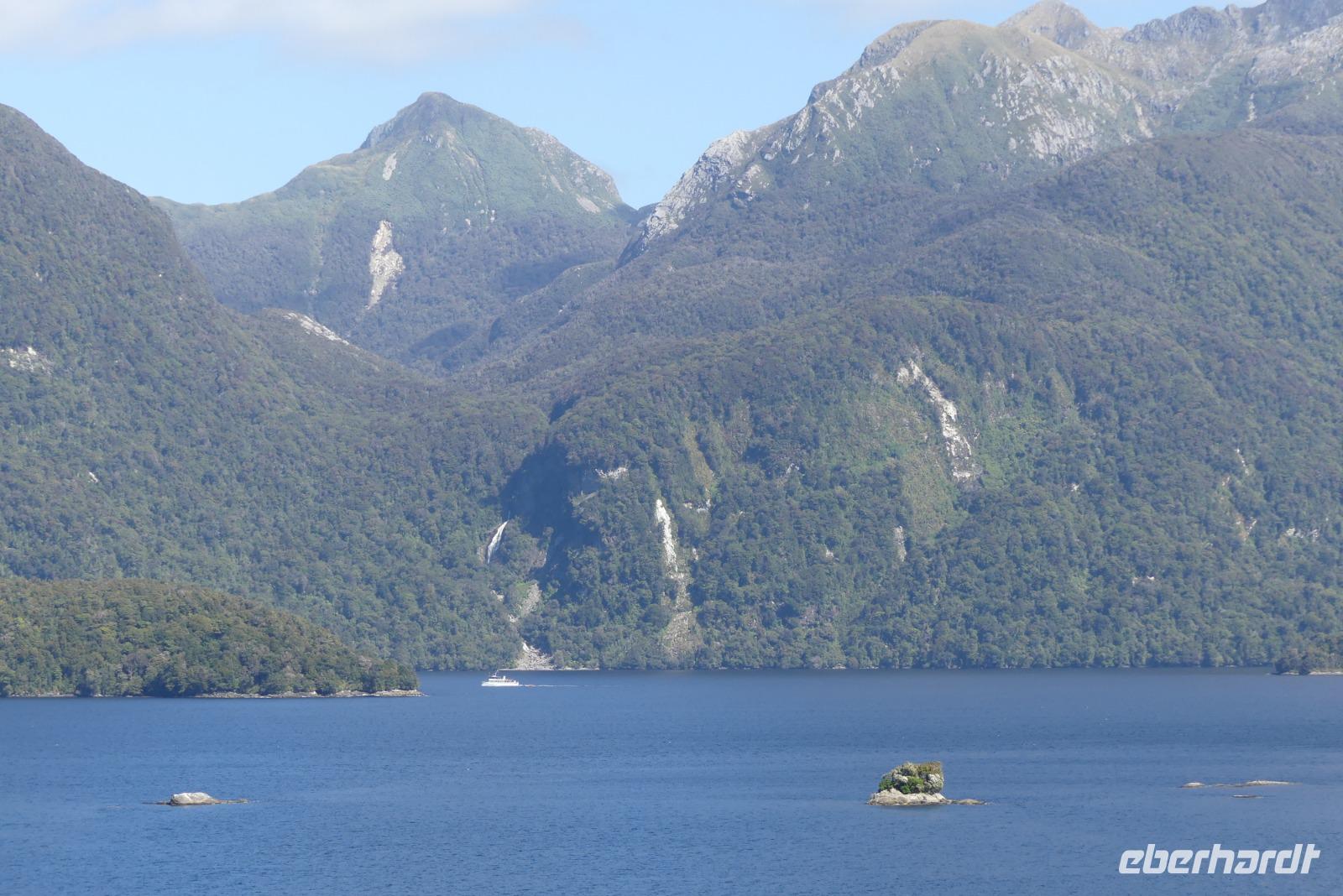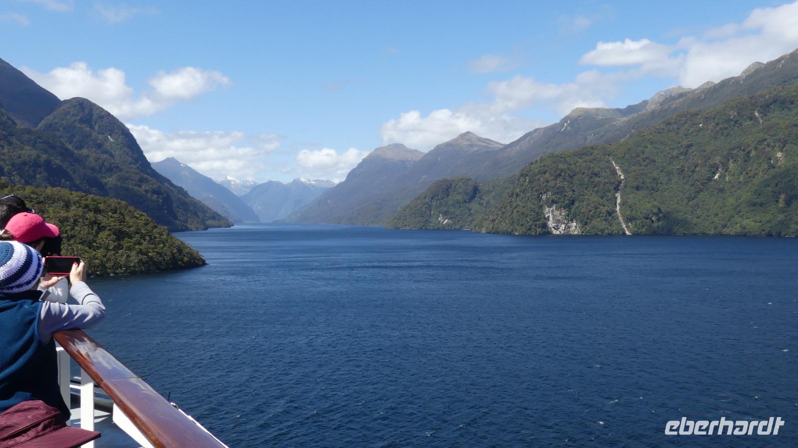 Mittag zieht es uns wieder auf das Außendeck. Die Einfahrt in Fjord Nummer 2, den Doubtful Sound steht an. Dieser ist deutlich länger und breiter. Offensichtlich wirkt der Fjord wie ein Trichter der die Winde verstärkt, denn zeitweise sind wir heftigen Böen ausgesetzt. Mit etwas Glück kann man heute Delphine, Robben, Pinguine oder Albatrosse beobachten. Ich kann bisher Robben und einen Hai verbuchen. Bei der Einfahrt in den dritten, den „düsteren Fjord", also Dusky Sound, begrüßt uns dann eine Schule von Delphinen. Im Dusky Sound sehen wir bei schönstem Wetter wieder das volle Programm: Wasserfälle, zahlreiche Inseln, üppiger Küstenregenwald und hohe Berge, zum Teil sogar schneebedeckt.