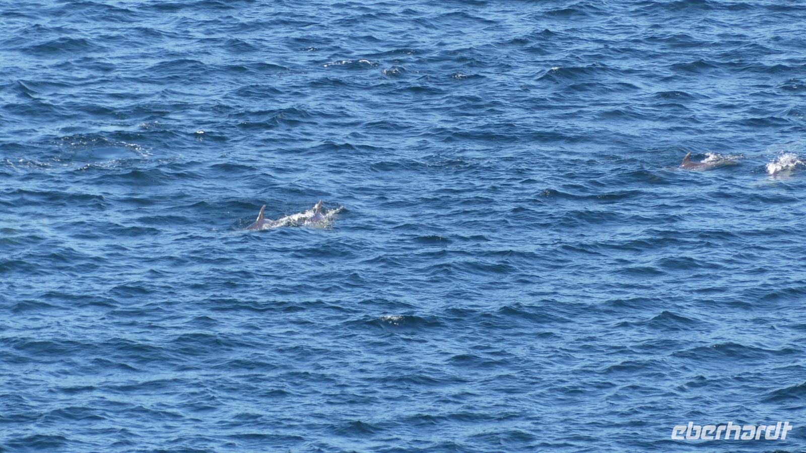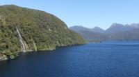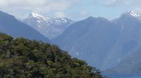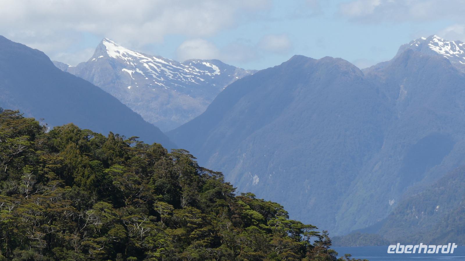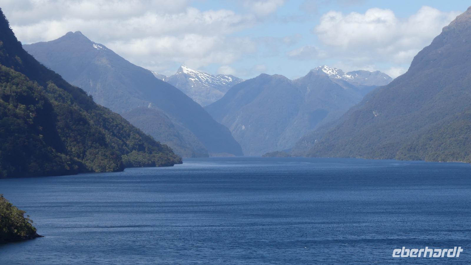 Mittag zieht es uns wieder auf das Außendeck. Die Einfahrt in Fjord Nummer 2, den Doubtful Sound steht an. Dieser ist deutlich länger und breiter. Offensichtlich wirkt der Fjord wie ein Trichter der die Winde verstärkt, denn zeitweise sind wir heftigen Böen ausgesetzt. Mit etwas Glück kann man heute Delphine, Robben, Pinguine oder Albatrosse beobachten. Ich kann bisher Robben und einen Hai verbuchen. Bei der Einfahrt in den dritten, den „düsteren Fjord", also Dusky Sound, begrüßt uns dann eine Schule von Delphinen. Im Dusky Sound sehen wir bei schönstem Wetter wieder das volle Programm: Wasserfälle, zahlreiche Inseln, üppiger Küstenregenwald und hohe Berge, zum Teil sogar schneebedeckt.