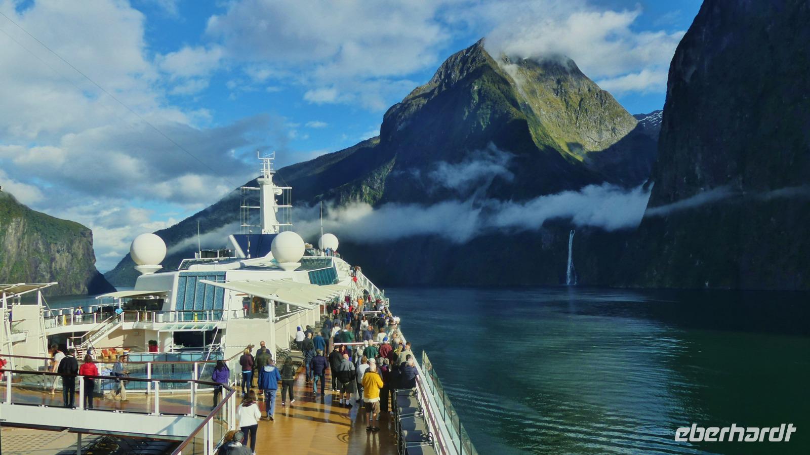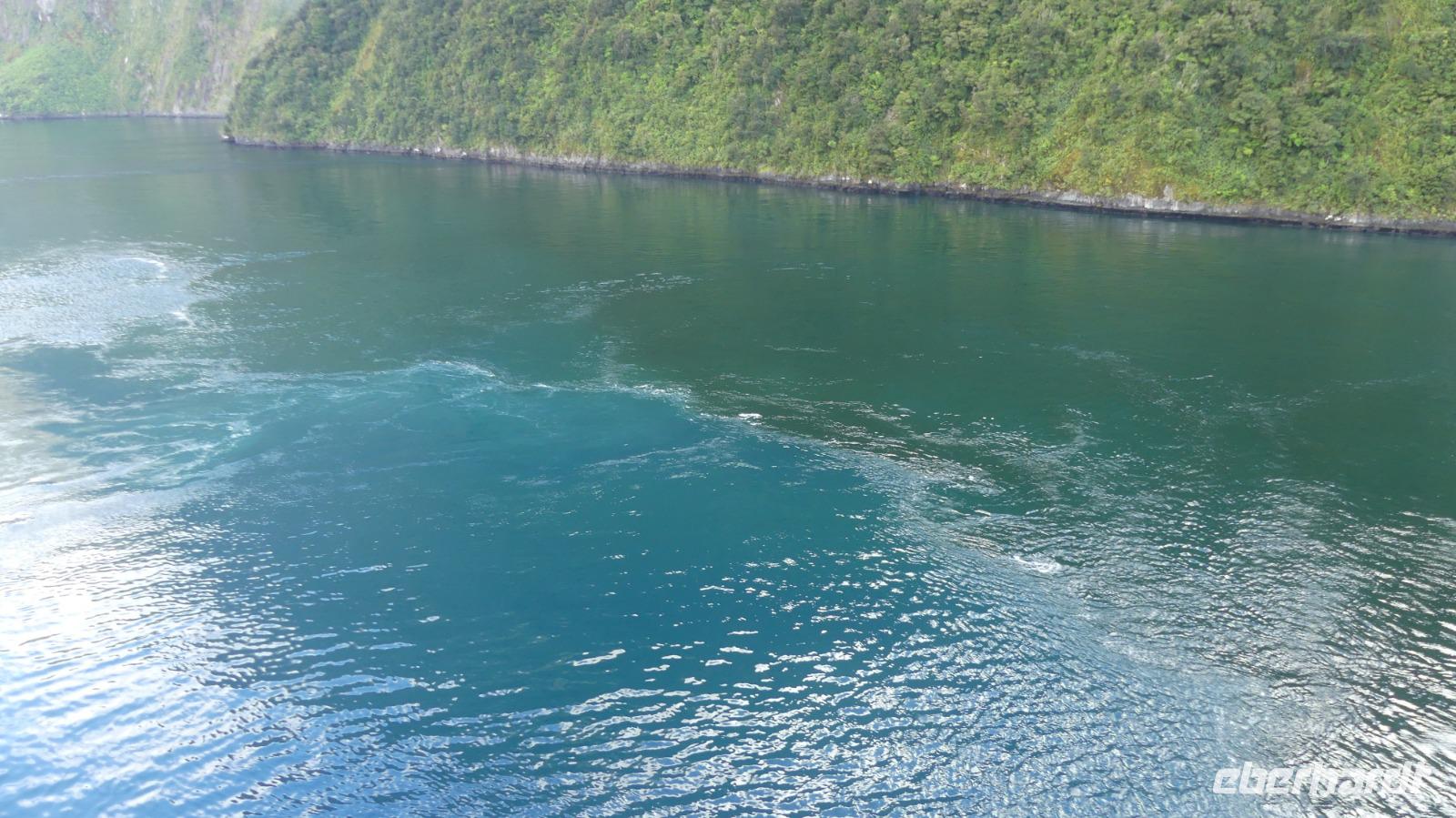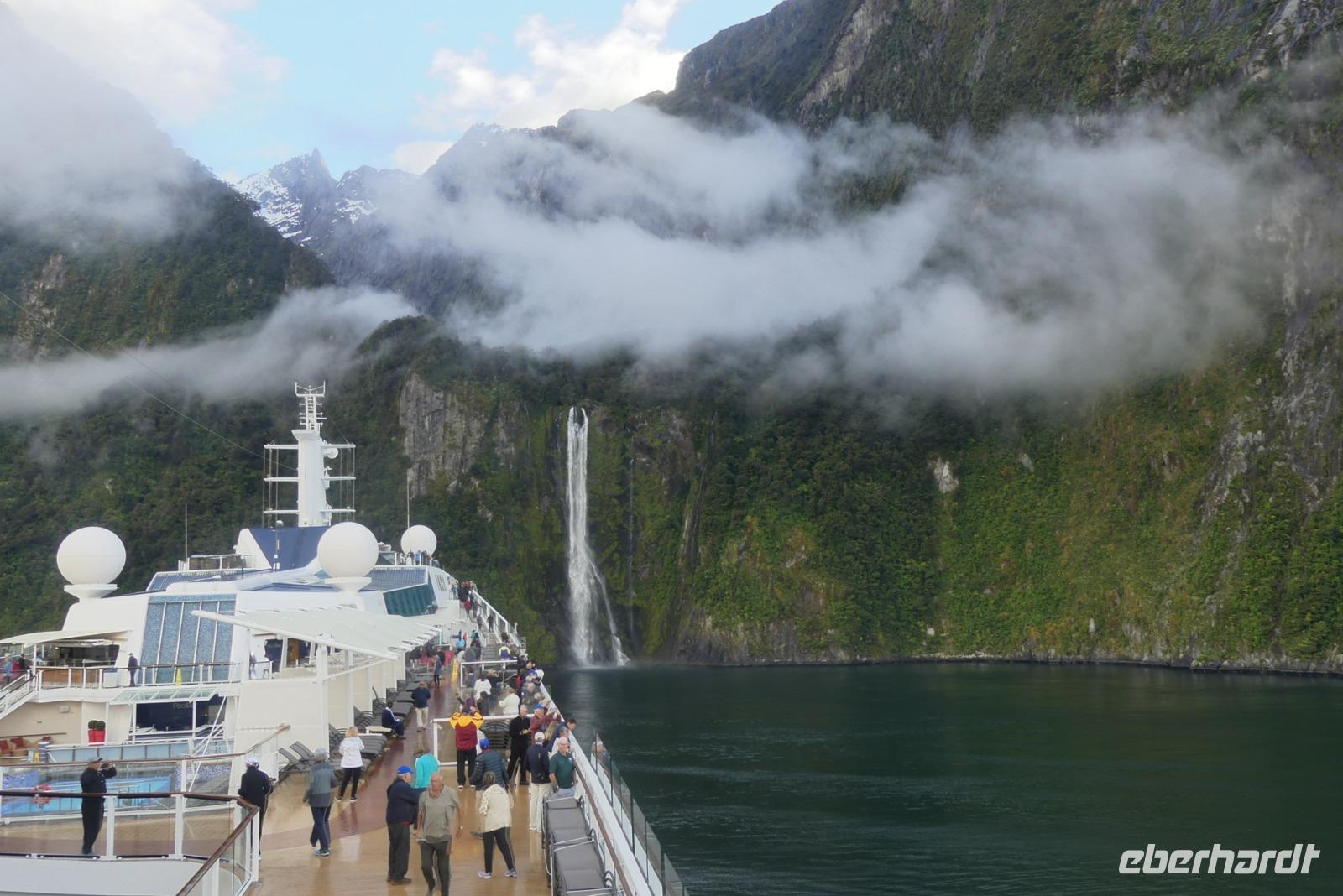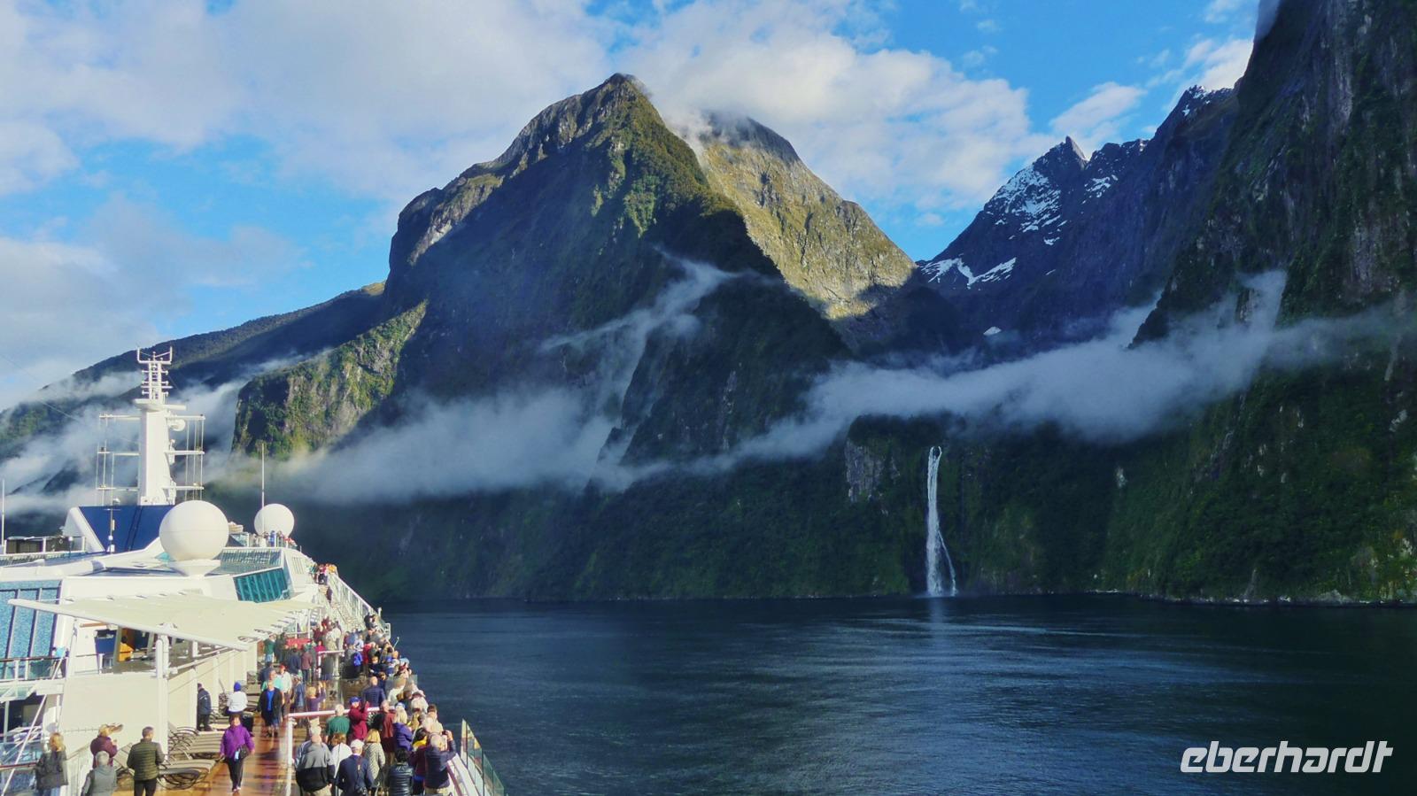 Dicke Wolken und Regen das ist das Typische Wetter hier und so sieht es früh am Morgen auch aus, als wir die neuseeländische Küste erreichen. Doch schon kurz nach der Einfahrt in den Milford Sound klart es rasch auf und die Sonne kommt immer öfter durch die größer werdenden Wolkenlücken. Sonne im Milford Sound, wo es 8 Meter Regen im Jahr gibt, das ist ein seltenes Ereignis, wir haben sehr sehr großes Glück! Der Fjord ist meist weniger als ein Kilometer breit, so dass wir die nahezu senkrecht abfallenden Felswände und verschiedene Wasserfälle ganz aus der Nähe sehen können. Der Kapitän dreht die Celebrity am 155 Meter hohen Wasserfall Stirling Fall 360 Grad um die eigene Achse. Eigentlich eine schöne Sache mit wunderschönen Motiven, allerdings stimmt mich ein Blick auf unseren Schornstein auch nachdenklich, denn unsere Abgase passen so gar nicht in die intakte Natur des Nationalparks und UNESCO-Weltnaturerbes.... Aber zurück zu dieser grandiosen Landschaft. Diese ist voller Kontraste: Licht und Schatten, Sonne und Wolken, üppig grüner Küstenregenwald und schneebedeckte Berge sowie Salz- und Süßwasser. Das viele Regenwasser, welches in den Fjord strömt, überlagert das Meerwasser und gibt der Wasseroberfläche ein dunkles Antlitz. Bei unserer 360 Grad Drehung verdrängt die Celebrity das Süßwasser und hellblaues Salzwasser gelangt an die Oberfläche.