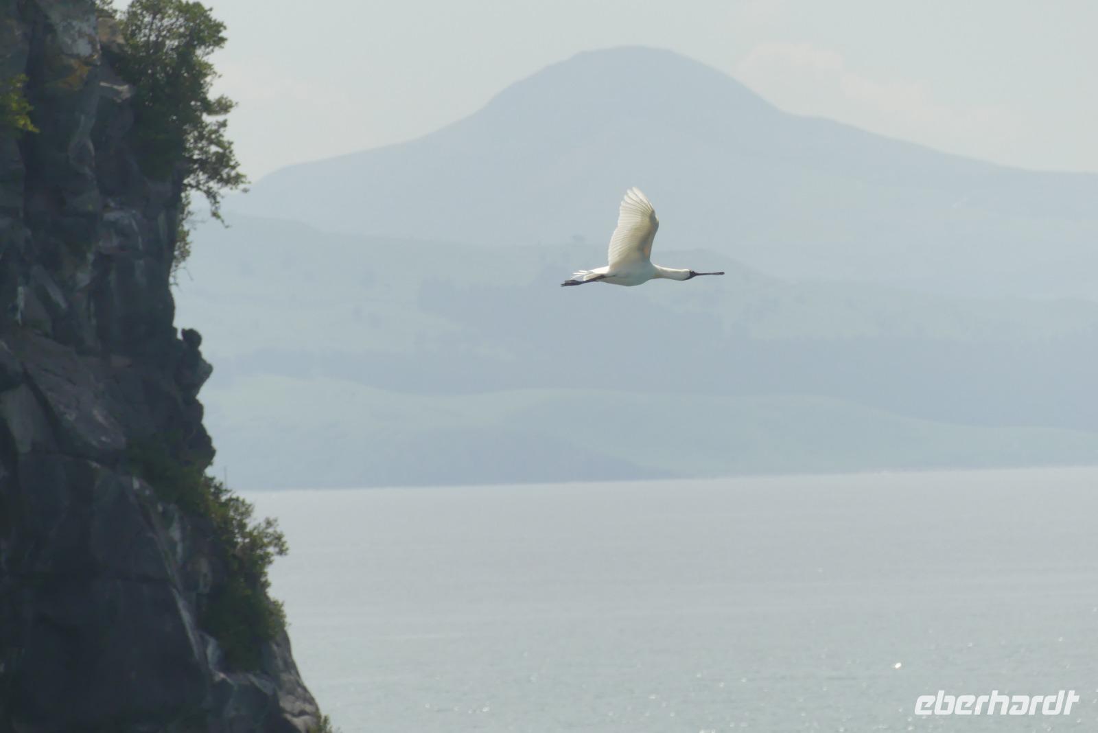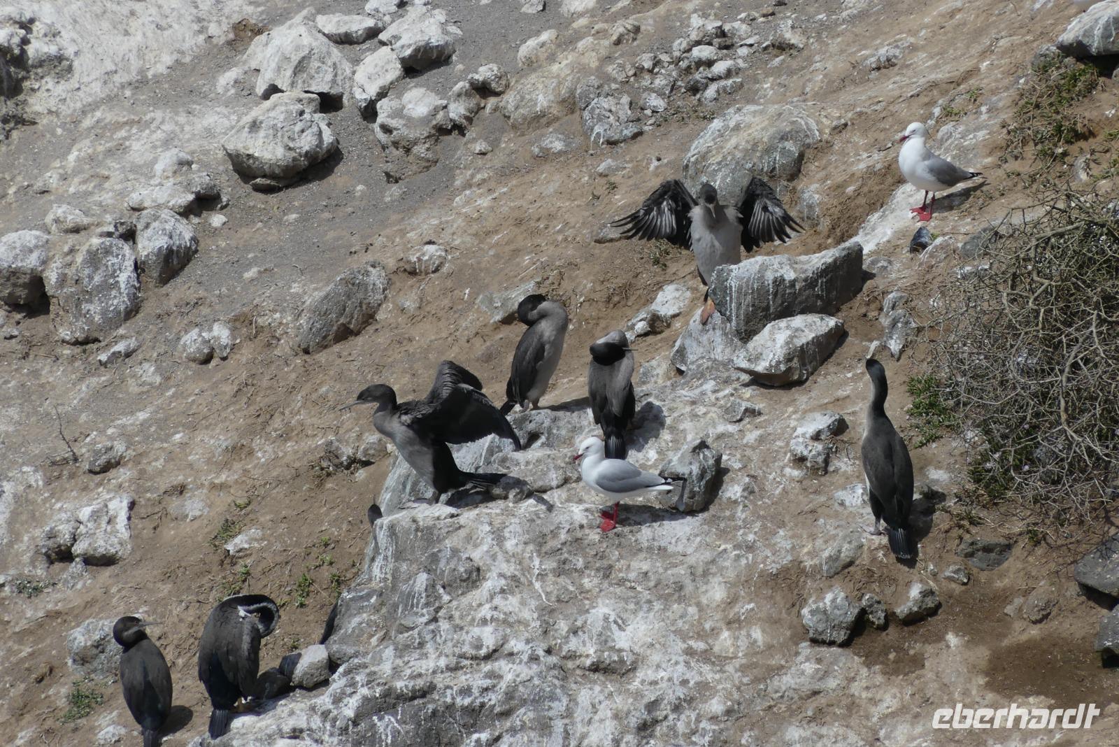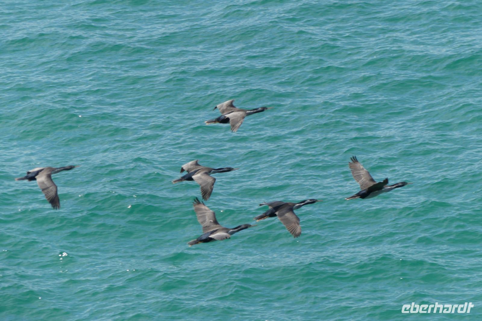 Kurz vor 18.00 Uhr erreichen wir pünktlich unser Schiff. Bei der Ausfahrt passieren wir die Albatross Kolonie. Dabei bestätigt sich was uns Hildegard gesagt hat: am Abend frischt der Wind auf, den die Albatrosse so mögen und so können wir zum Abschied die Albatrosse beim Fliegen beobachten.