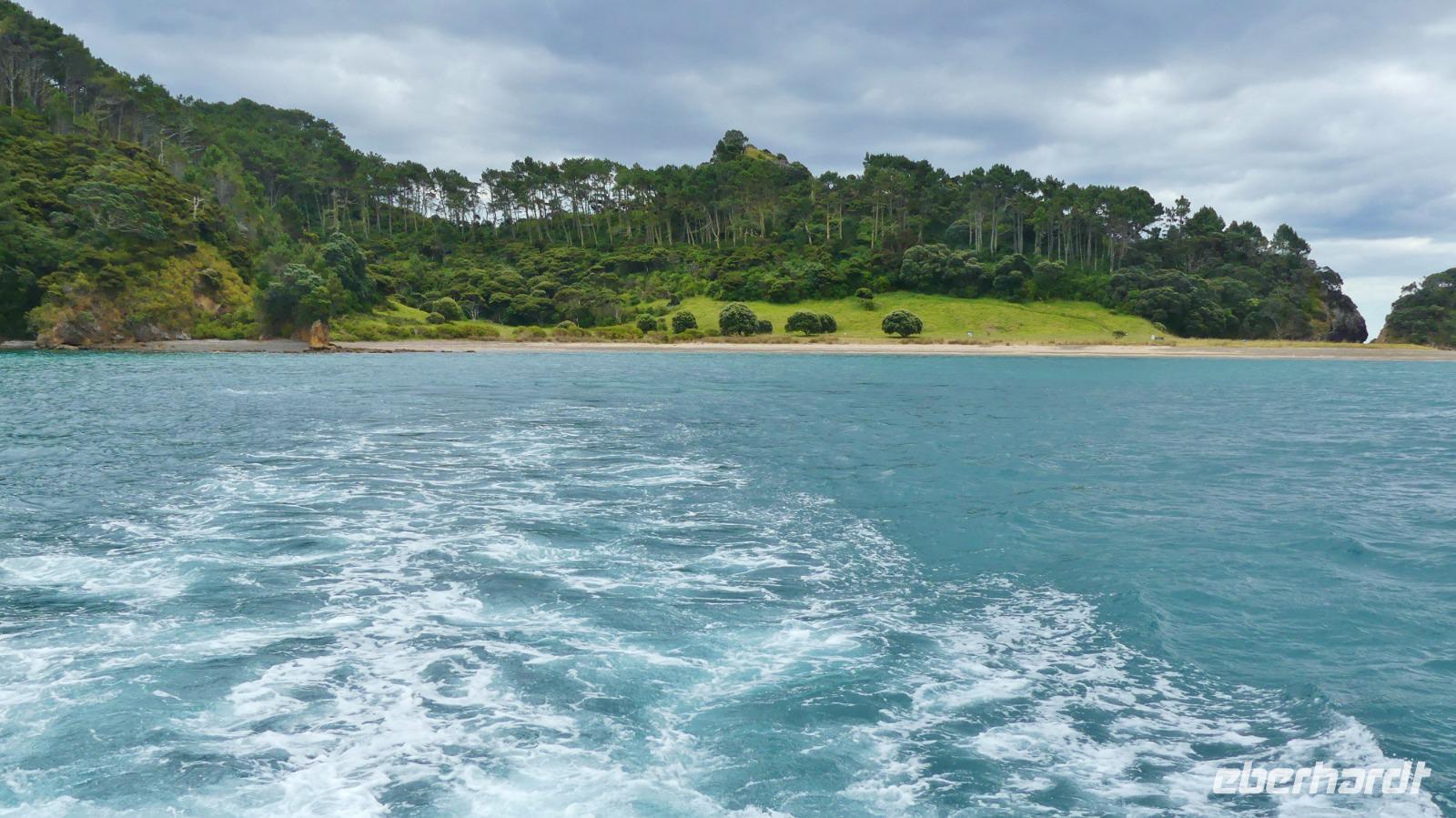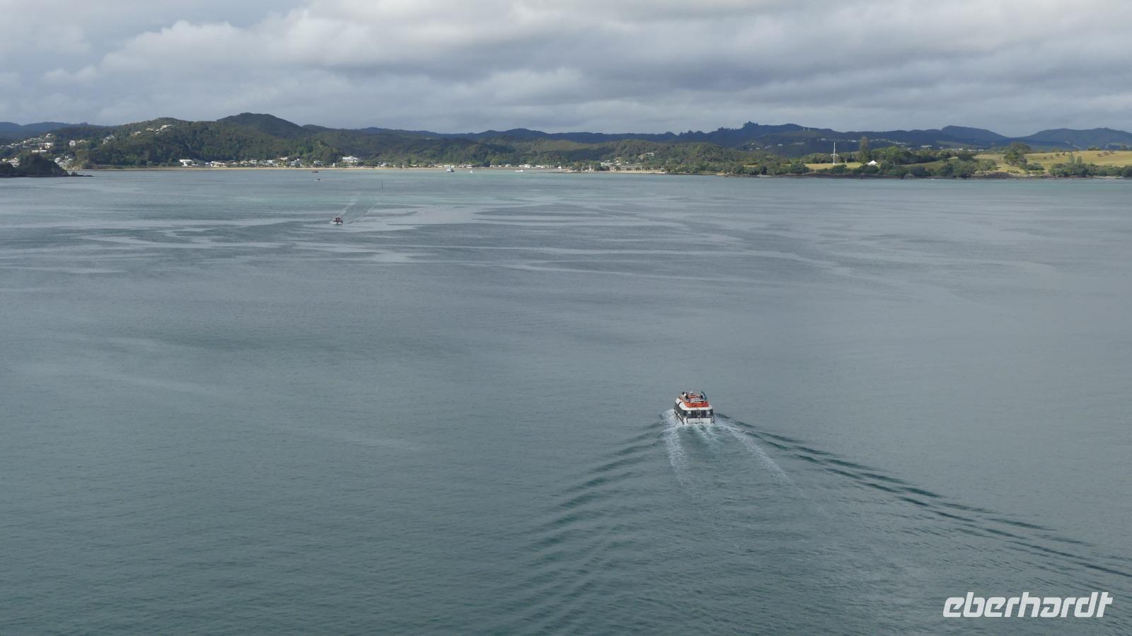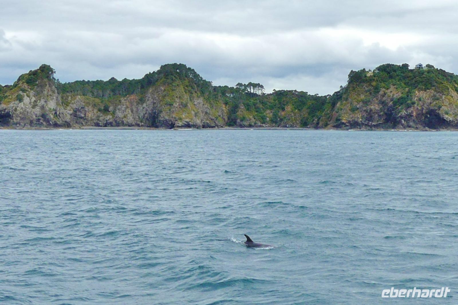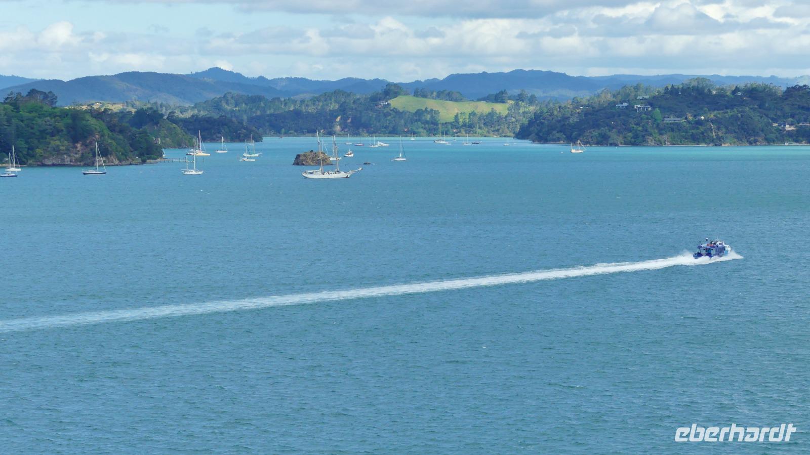 Mit der Bay of Islands erreichen wir den nördlichsten Punkt unserer Kreuzfahrt, ca. 100 Kilometer von der Nordspitze Neuseelands entfernt. Bay of Islands, die Bucht der Inseln, über 140 sind es. Wir verteilen uns heute auf verschiedene Ausflüge: Zwei unternehmen eine Radtour, drei Gäste sind mit dem Kanu zum Waitangi Wasserfall unterwegs und ich begleite sechs Gäste mit dem Tenderboot nach Waitangi. Dort spazieren wir zum historischen Treaty House (der Ort wo 1840 der Vertrag zwischen den Maori und der britischen Krone geschlossen wurde) und weiter nach Paihia entlang der schönen Bucht. Mit einer Fähre setzen wir nach Russel über, ein hübscher kleiner Ort der mal kurze Zeit Hauptstadt Neuseelands war. In Russel besteigen wir ein Ausflugsboot zur Delphinbeobachtung und zur Felseninsel „Hole in the Rock". Das mit den Delphinen hat ganz gut geklappt, wir konnten einige Tiere beobachten. Von einem anderen Ausflugsboot nebenan versuchen einige mit den Delphinen zu schwimmen. An einige der schönsten Inseln fahren wir dichter heran. Es ist eine wunderschöne Landschaft mit Traumbuchten. In einer dieser Buchten landete 1769 James Cook. Zum Abschluss des Ausfluges kommt das Loch im Felsen, dass wir tatsächlich mit dem Boot durchfahren.