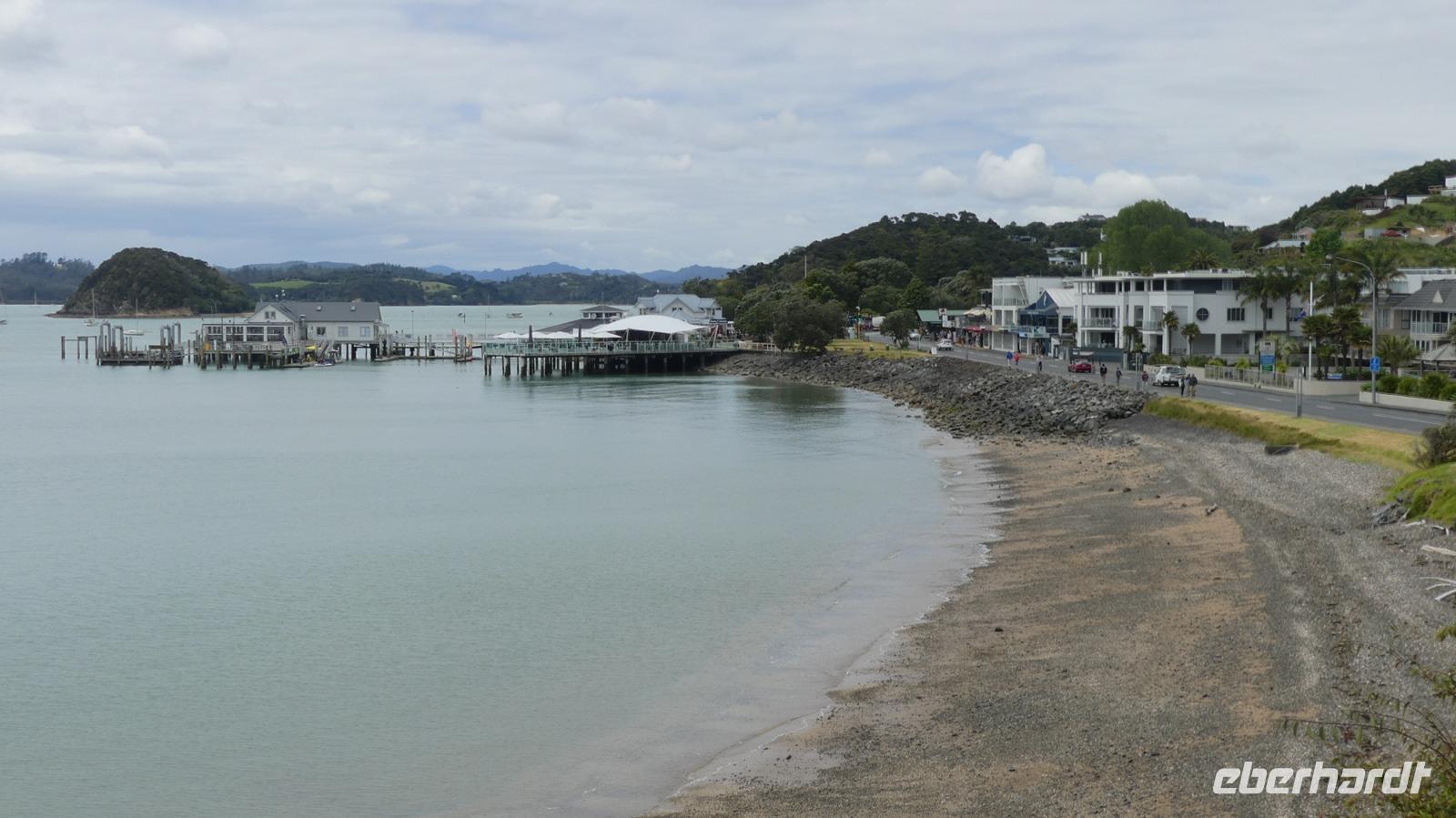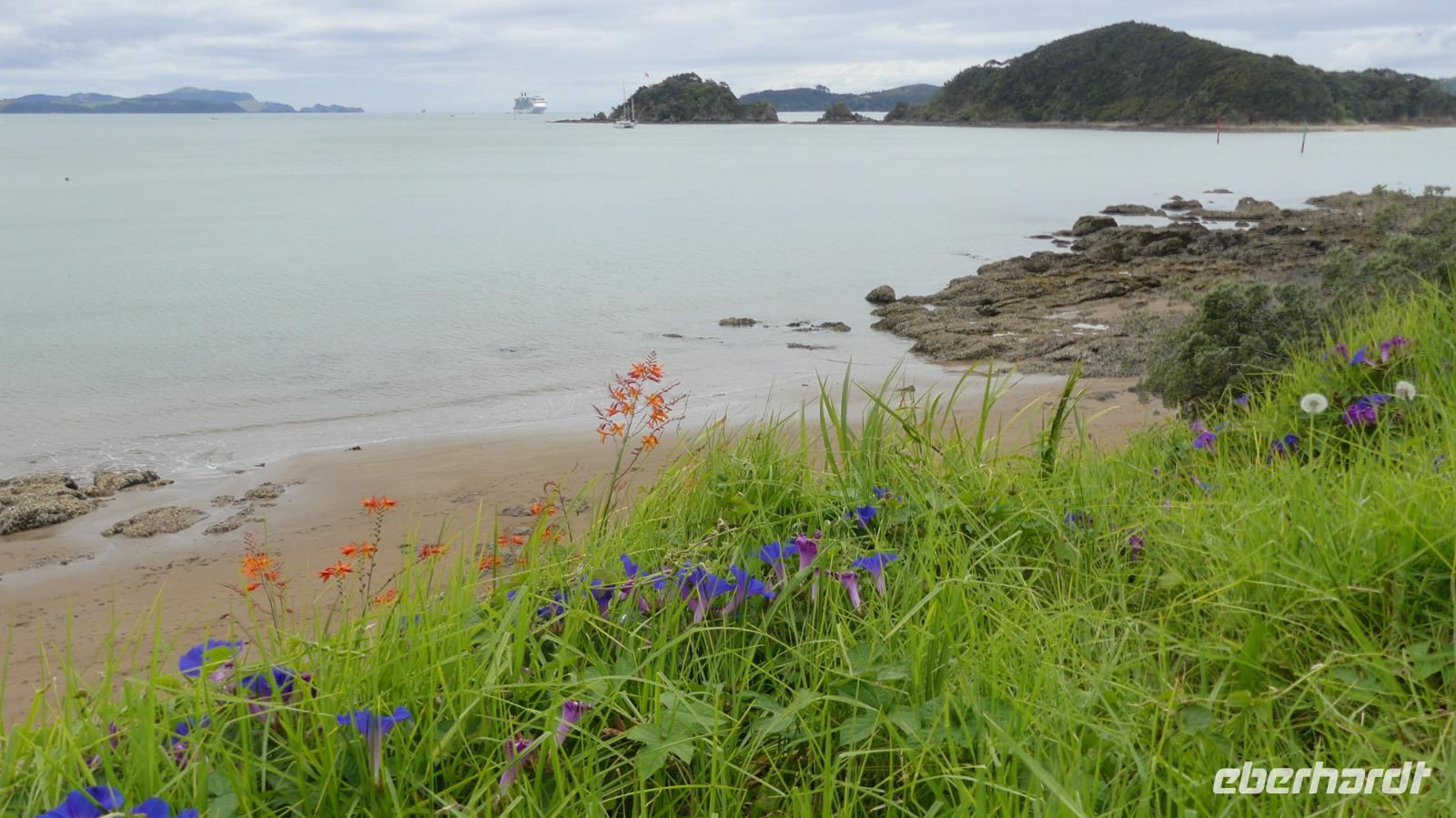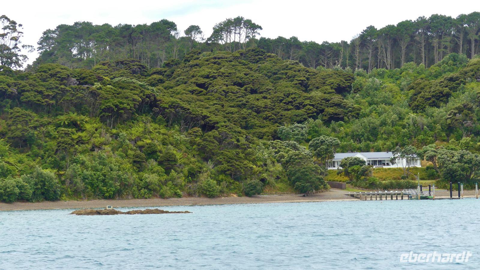 Mit der Bay of Islands erreichen wir den nördlichsten Punkt unserer Kreuzfahrt, ca. 100 Kilometer von der Nordspitze Neuseelands entfernt. Bay of Islands, die Bucht der Inseln, über 140 sind es. Wir verteilen uns heute auf verschiedene Ausflüge: Zwei unternehmen eine Radtour, drei Gäste sind mit dem Kanu zum Waitangi Wasserfall unterwegs und ich begleite sechs Gäste mit dem Tenderboot nach Waitangi. Dort spazieren wir zum historischen Treaty House (der Ort wo 1840 der Vertrag zwischen den Maori und der britischen Krone geschlossen wurde) und weiter nach Paihia entlang der schönen Bucht. Mit einer Fähre setzen wir nach Russel über, ein hübscher kleiner Ort der mal kurze Zeit Hauptstadt Neuseelands war. In Russel besteigen wir ein Ausflugsboot zur Delphinbeobachtung und zur Felseninsel „Hole in the Rock". Das mit den Delphinen hat ganz gut geklappt, wir konnten einige Tiere beobachten. Von einem anderen Ausflugsboot nebenan versuchen einige mit den Delphinen zu schwimmen. An einige der schönsten Inseln fahren wir dichter heran. Es ist eine wunderschöne Landschaft mit Traumbuchten. In einer dieser Buchten landete 1769 James Cook. Zum Abschluss des Ausfluges kommt das Loch im Felsen, dass wir tatsächlich mit dem Boot durchfahren.