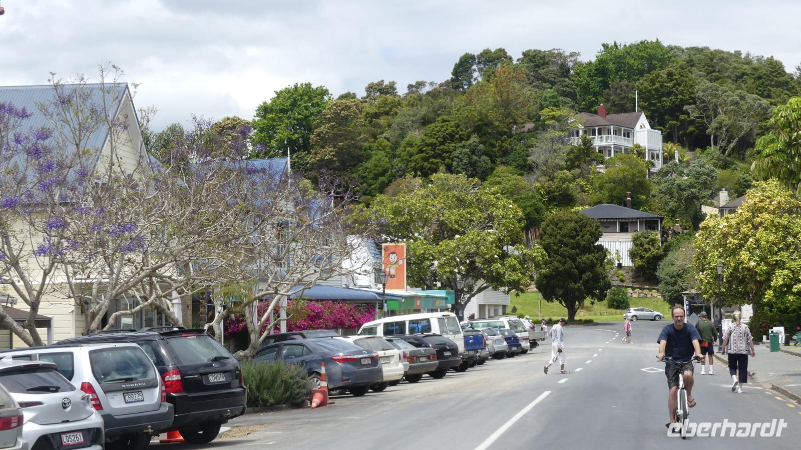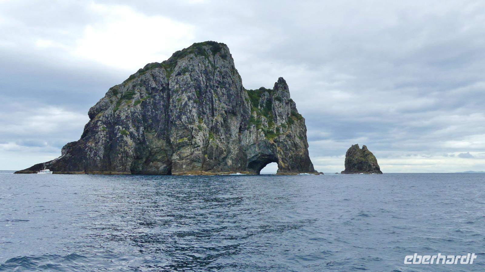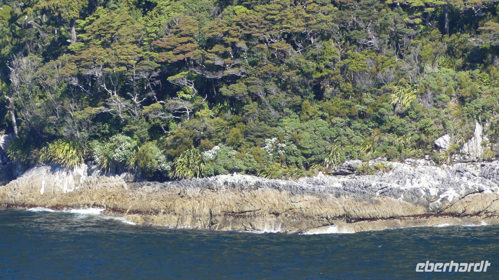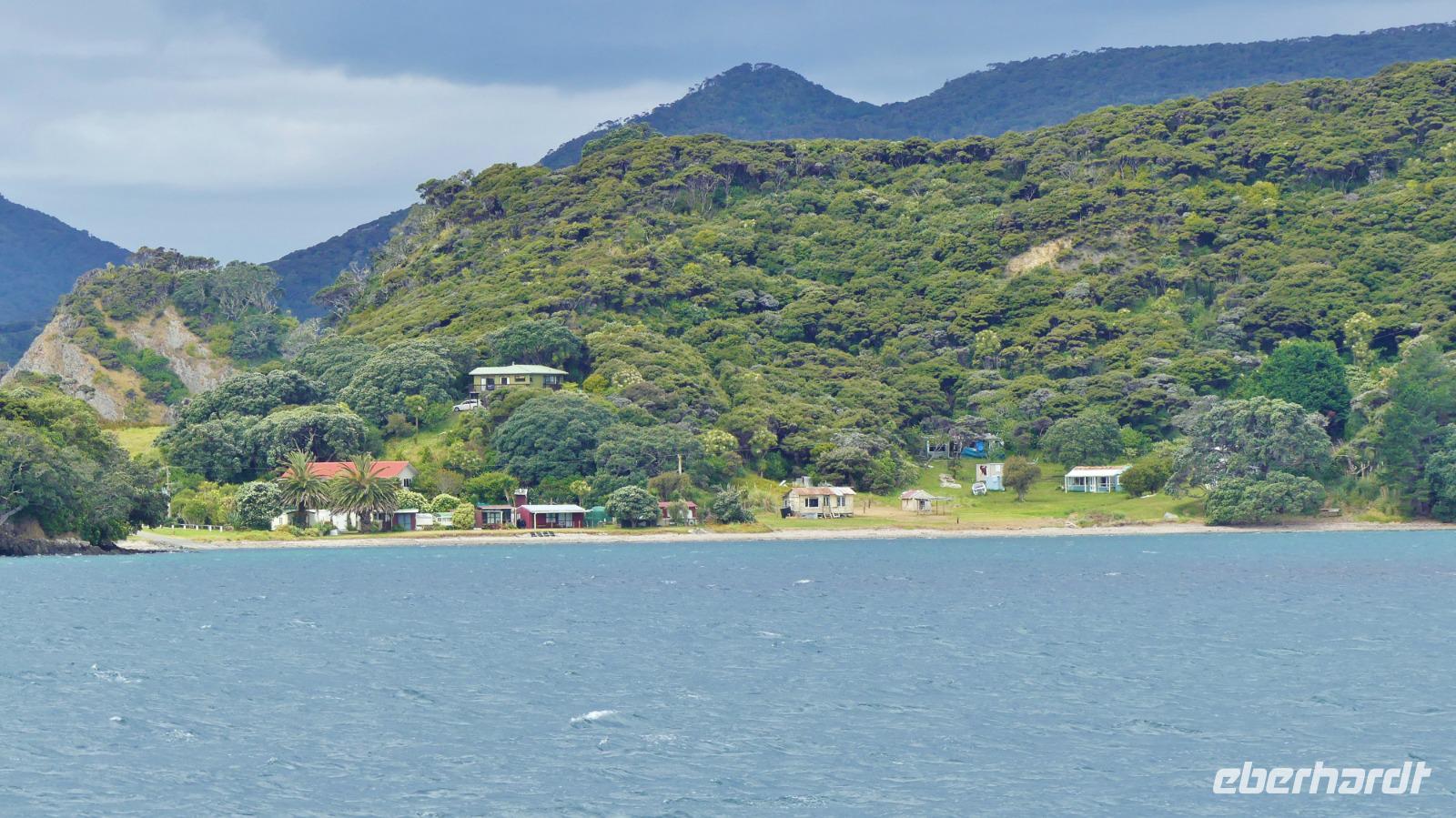 Mit der Bay of Islands erreichen wir den nördlichsten Punkt unserer Kreuzfahrt, ca. 100 Kilometer von der Nordspitze Neuseelands entfernt. Bay of Islands, die Bucht der Inseln, über 140 sind es. Wir verteilen uns heute auf verschiedene Ausflüge: Zwei unternehmen eine Radtour, drei Gäste sind mit dem Kanu zum Waitangi Wasserfall unterwegs und ich begleite sechs Gäste mit dem Tenderboot nach Waitangi. Dort spazieren wir zum historischen Treaty House (der Ort wo 1840 der Vertrag zwischen den Maori und der britischen Krone geschlossen wurde) und weiter nach Paihia entlang der schönen Bucht. Mit einer Fähre setzen wir nach Russel über, ein hübscher kleiner Ort der mal kurze Zeit Hauptstadt Neuseelands war. In Russel besteigen wir ein Ausflugsboot zur Delphinbeobachtung und zur Felseninsel „Hole in the Rock". Das mit den Delphinen hat ganz gut geklappt, wir konnten einige Tiere beobachten. Von einem anderen Ausflugsboot nebenan versuchen einige mit den Delphinen zu schwimmen. An einige der schönsten Inseln fahren wir dichter heran. Es ist eine wunderschöne Landschaft mit Traumbuchten. In einer dieser Buchten landete 1769 James Cook. Zum Abschluss des Ausfluges kommt das Loch im Felsen, dass wir tatsächlich mit dem Boot durchfahren.