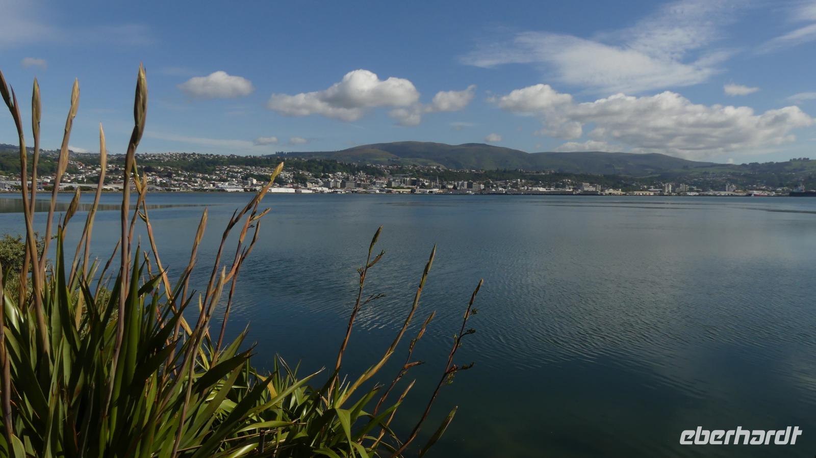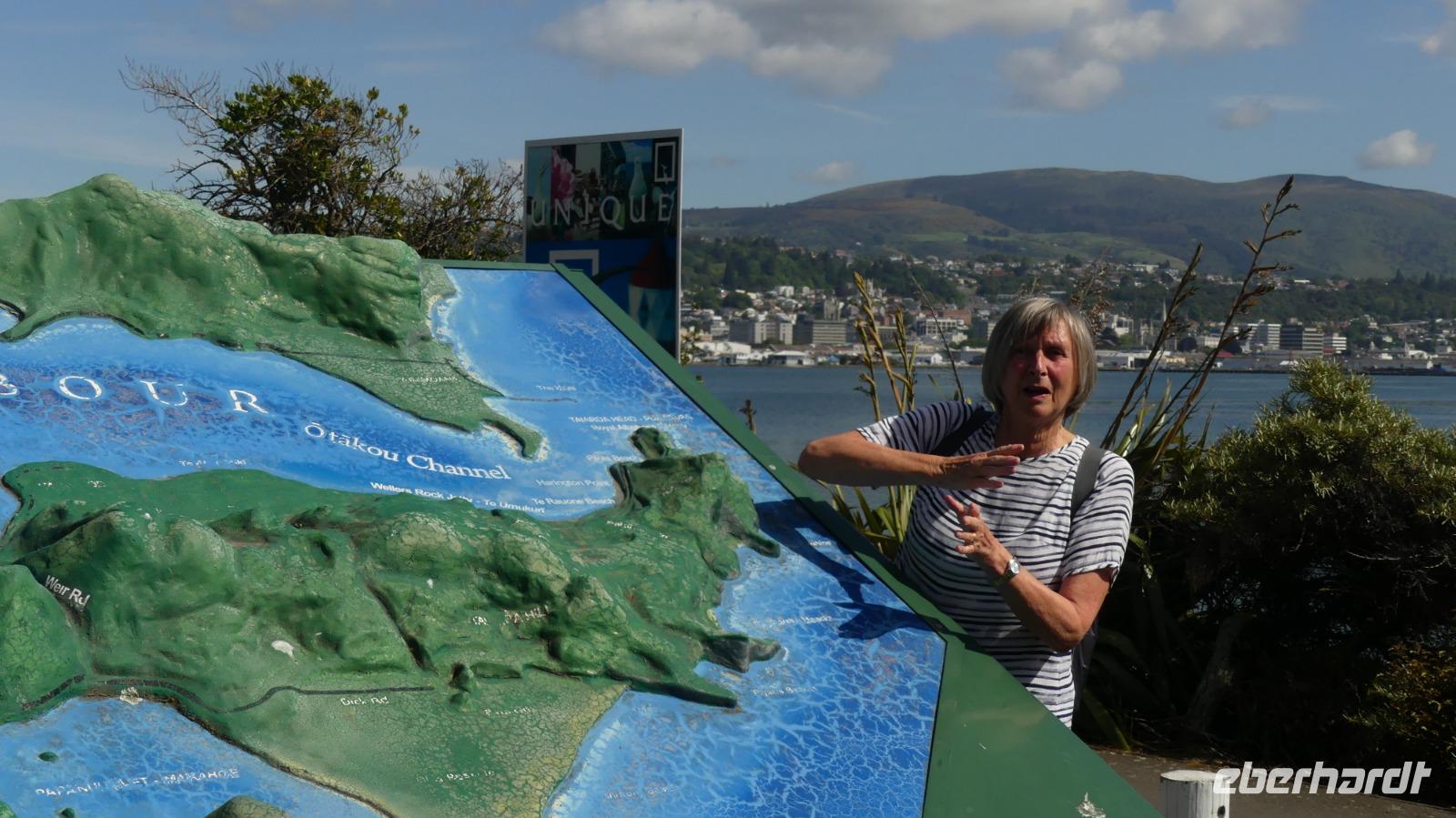 Bis zur Ankunft unseres Kleinbusses schauen wir uns in Port Chalmers um, suchen einen Internet Hotspot oder heben Geld vom Automaten ab. Schließlich fahren wir mit unserer lokaler Reiseleiterin Hildegard Richtung Dunedin und Otago Halbinsel. Ich darf auch mitfahren, es ist noch Platz neben dem Fahrer auf einem Klappsitz :-)