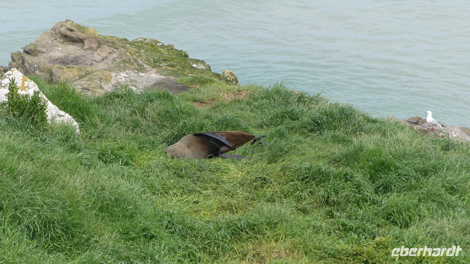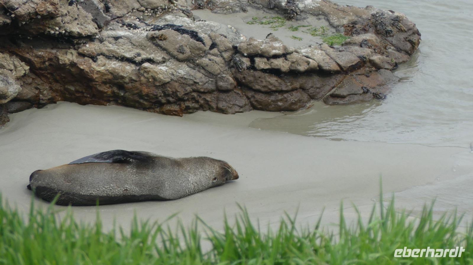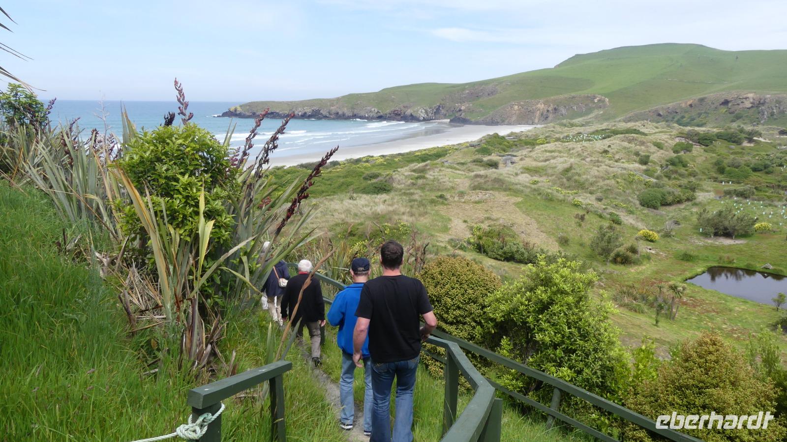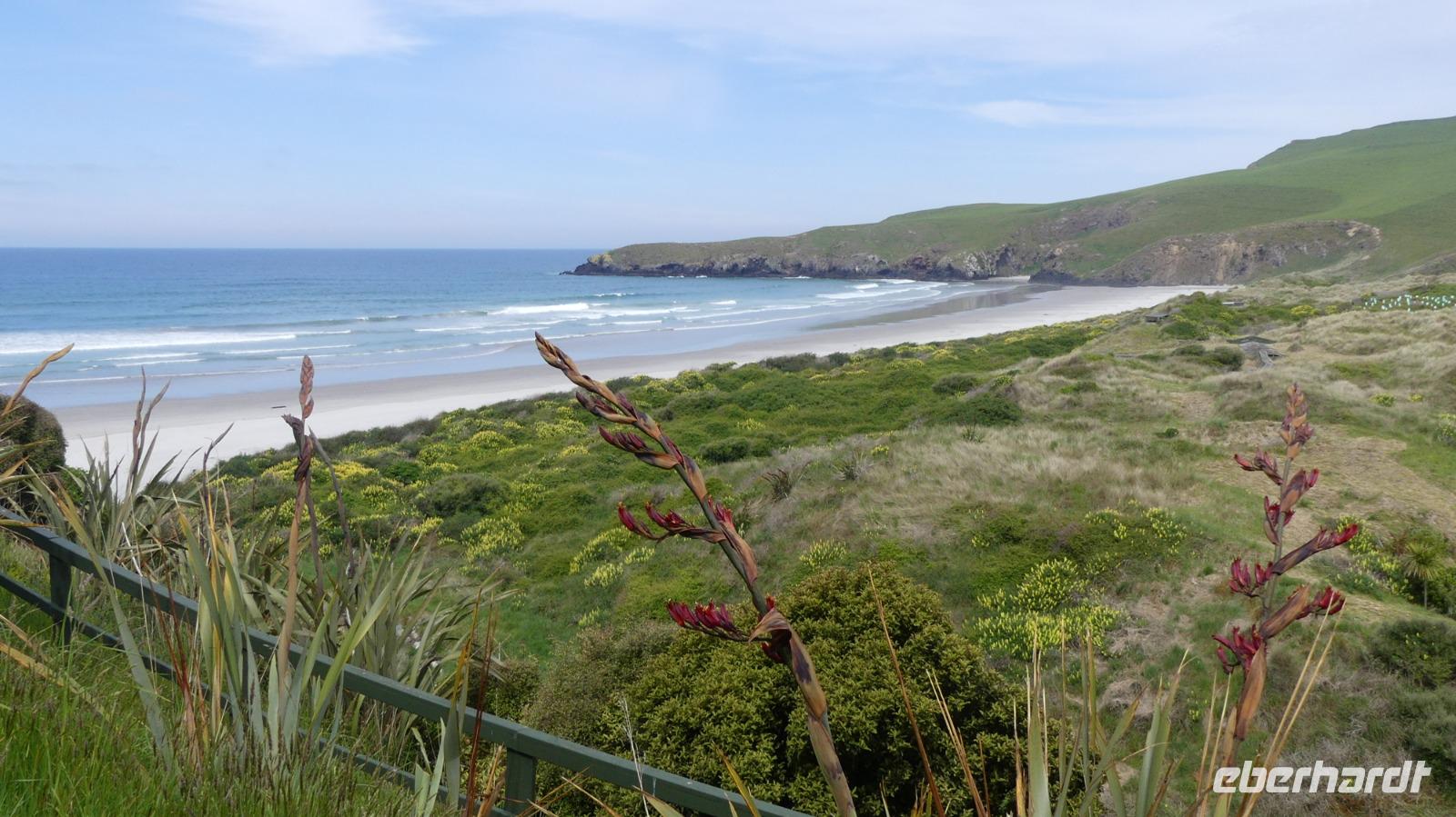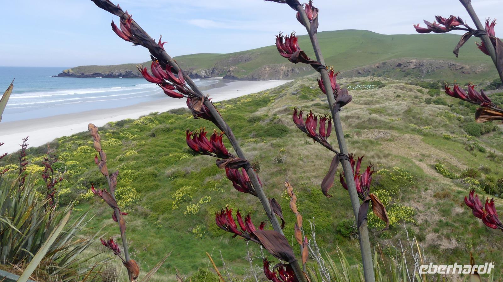 Inzwischen haben Hilde und ich geklärt, dass wir auch zum sogenannten Pinguin Place fahren können. Dort erhalten wir interessante Einblicke in das Leben der stark bedrohten Gelbaugenpinguine. Weltweit soll es nur noch 1.800 Exemplare geben, davon 700 auf der neuseeländischen Südinsel. Bei einem Spaziergang an der Küste stehen vorbereitende Brutkästen am Boden, abgeschirmt von den Artgenossen, denn sie mögen keine Nachbarn. 3 Brutplätze sind belegt und man kann darin einen brütenden Pinguin erahnen. Auch wenn hier der Gelbaugenpinguin im Mittelpunkt steht, die Natur hier ist wunderschön: ein toller Sandstrand eingerahmt von grüner Vegetation und Felsen. Auf den Felsen sind bei näherem Hinschauen Robben zu erkennen. Und die Flora hält für uns viele unbekannte Pflanzen bereit. Hilde lässt uns vom süßen Nektar der Flachsblüten probieren.