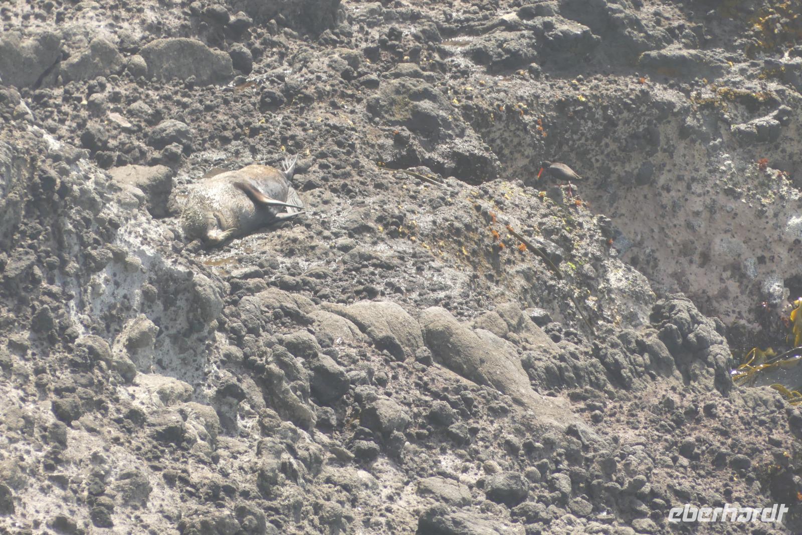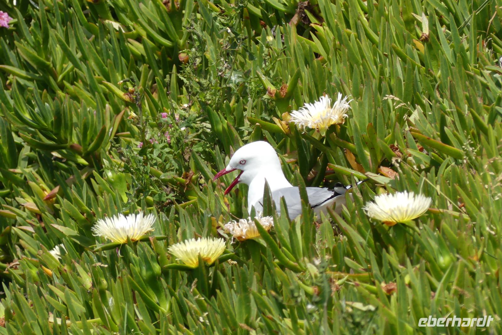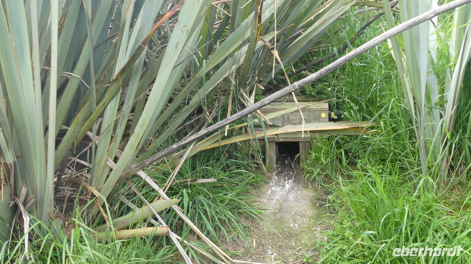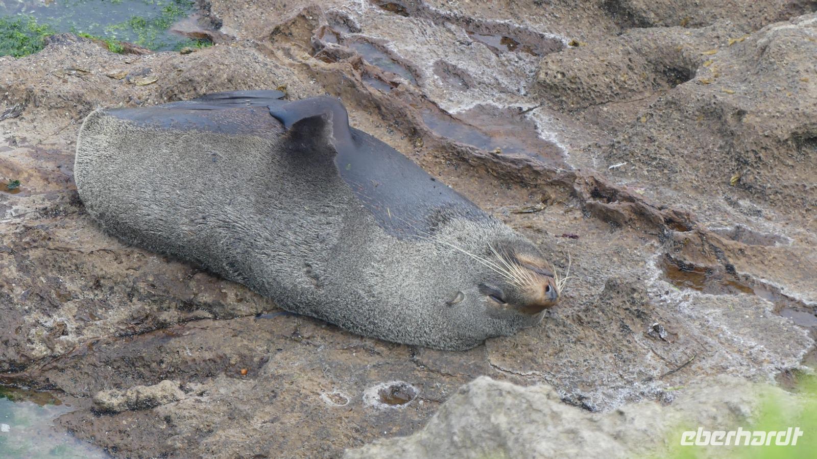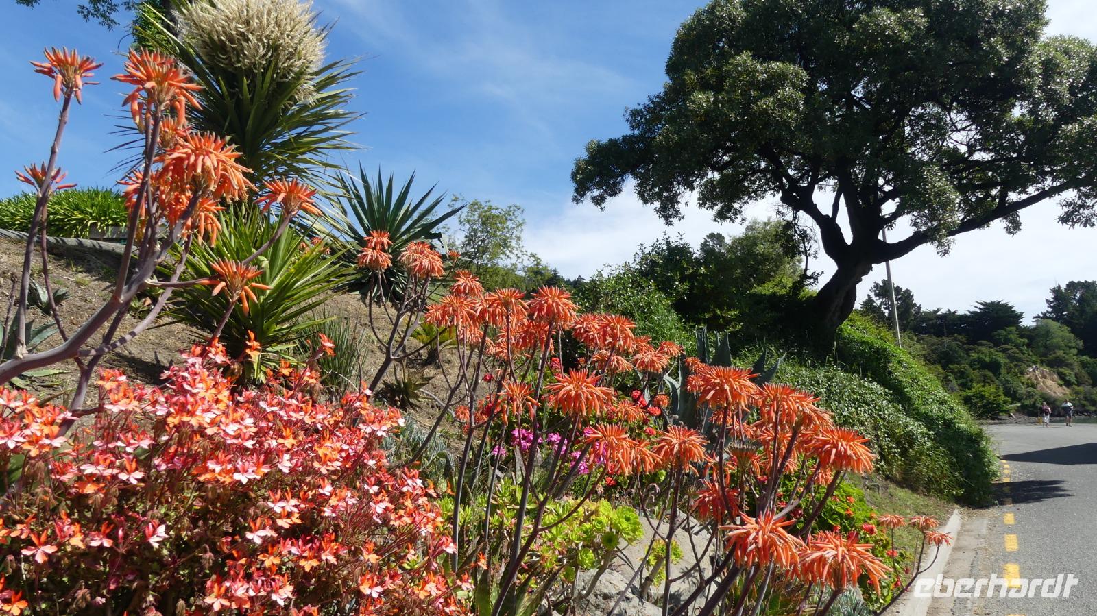 Inzwischen haben Hilde und ich geklärt, dass wir auch zum sogenannten Pinguin Place fahren können. Dort erhalten wir interessante Einblicke in das Leben der stark bedrohten Gelbaugenpinguine. Weltweit soll es nur noch 1.800 Exemplare geben, davon 700 auf der neuseeländischen Südinsel. Bei einem Spaziergang an der Küste stehen vorbereitende Brutkästen am Boden, abgeschirmt von den Artgenossen, denn sie mögen keine Nachbarn. 3 Brutplätze sind belegt und man kann darin einen brütenden Pinguin erahnen. Auch wenn hier der Gelbaugenpinguin im Mittelpunkt steht, die Natur hier ist wunderschön: ein toller Sandstrand eingerahmt von grüner Vegetation und Felsen. Auf den Felsen sind bei näherem Hinschauen Robben zu erkennen. Und die Flora hält für uns viele unbekannte Pflanzen bereit. Hilde lässt uns vom süßen Nektar der Flachsblüten probieren.