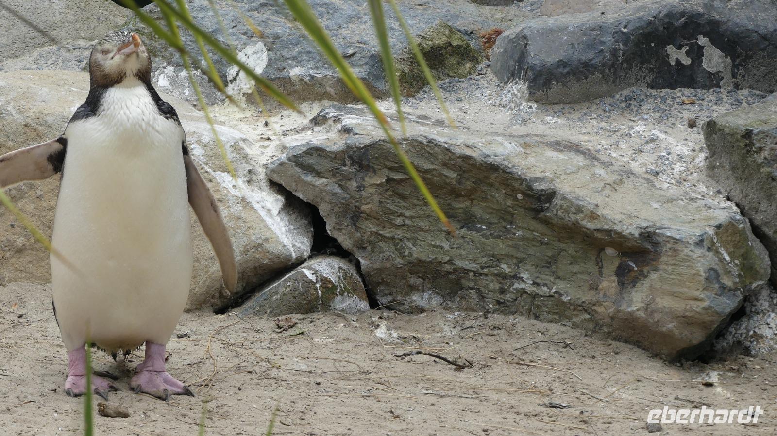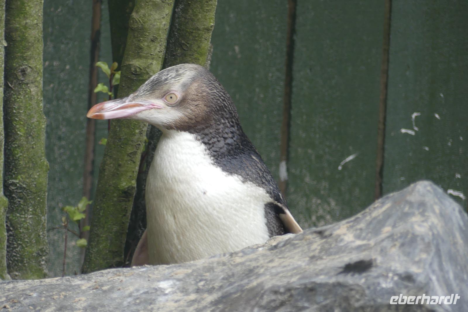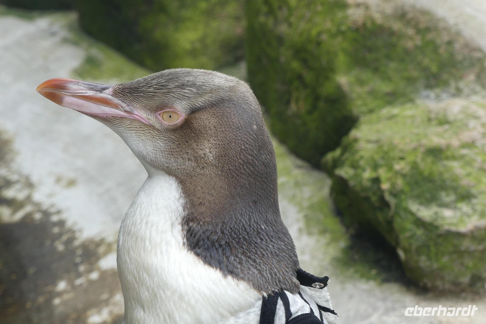 Zum Pinguin Place gehört noch ein Rehazentrum für verletzte Tiere. Derzeit werden hier 4 Gelbaugenpinguine gepflegt, welche wir ganz aus der Nähe beobachten können. Einer fällt aus der Reihe, er hat ein gestreiftes T-Shirt an, damit er sich nicht nachwachsende Federn rauszupft.