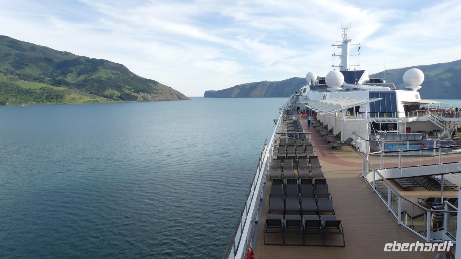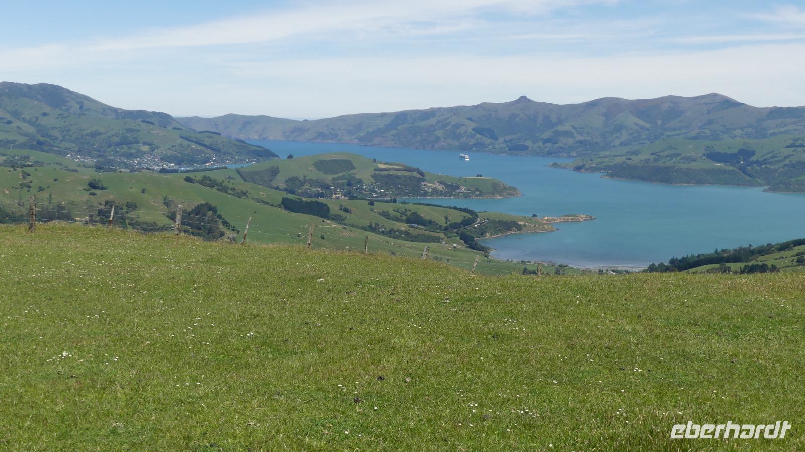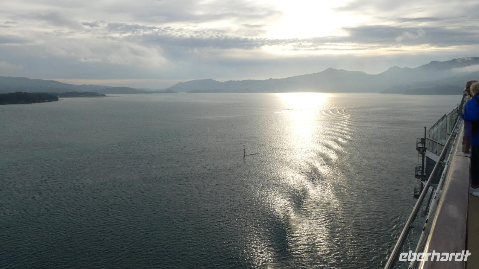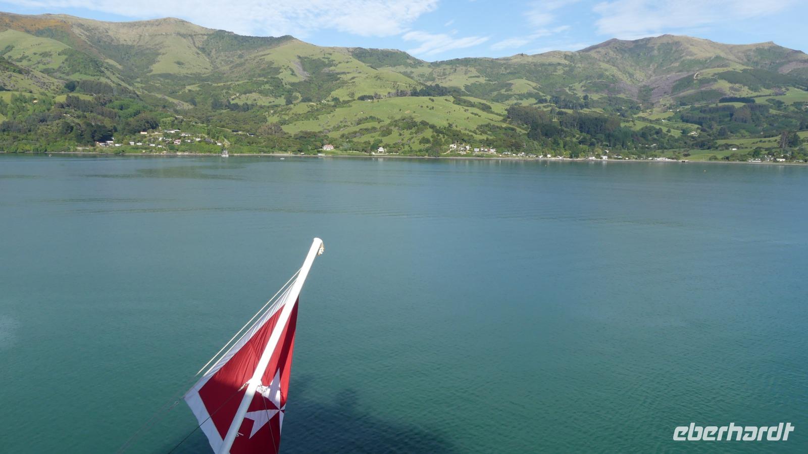 Wenn man so will, fahren wir heute mit dem Schiff in einen Vulkan. Okay, dieser ist schon lang erloschen, aber noch deutlich in seiner Form zu erkennen. Der Vulkan hat eine schmale Öffnung zum Pazifik, welche die Zufahrt auf dem Wasserweg ins Innere der Banks Halbinsel ermöglicht.