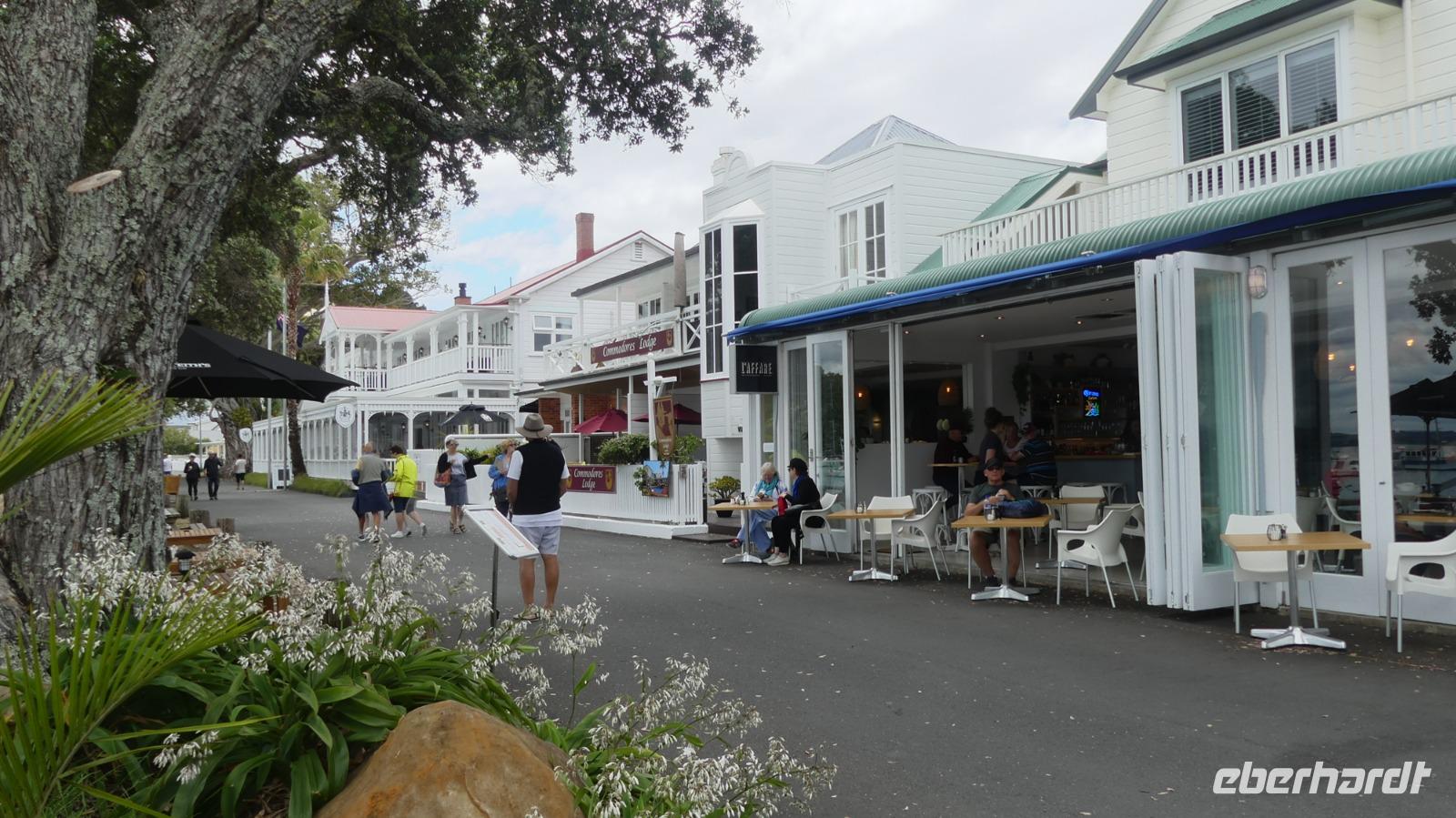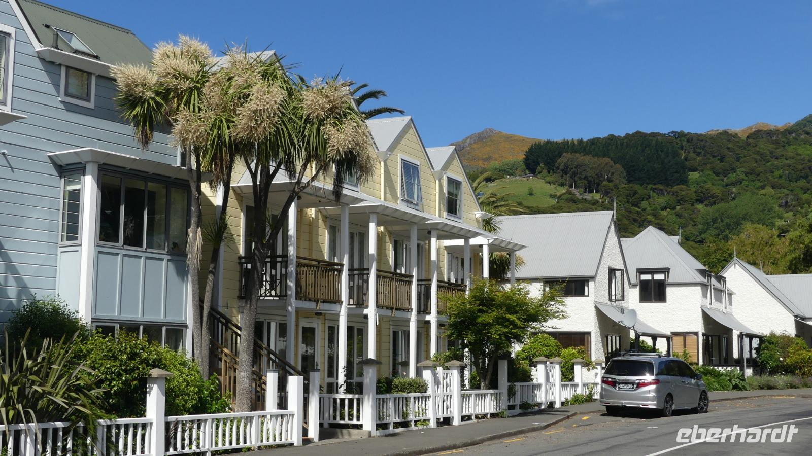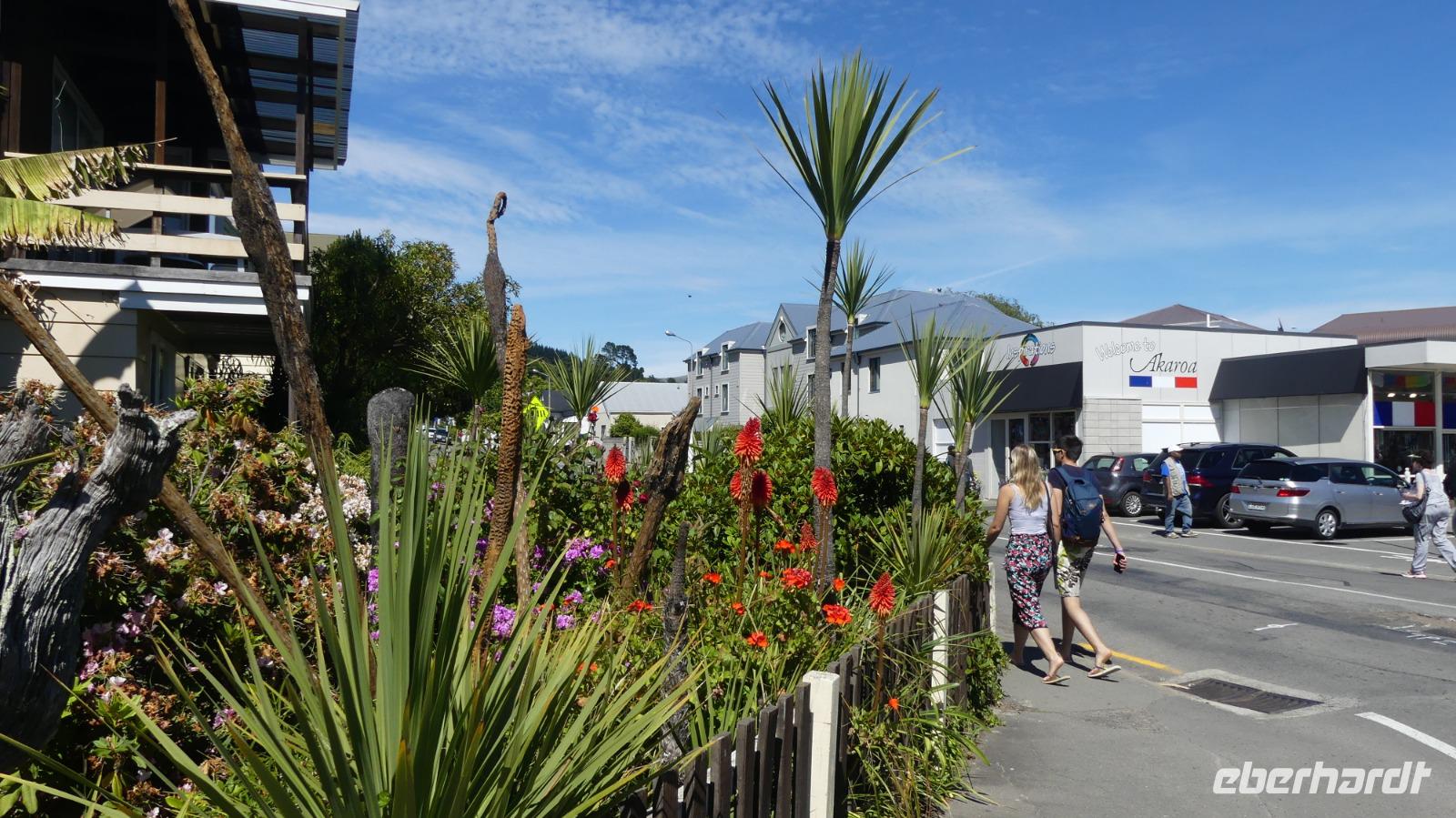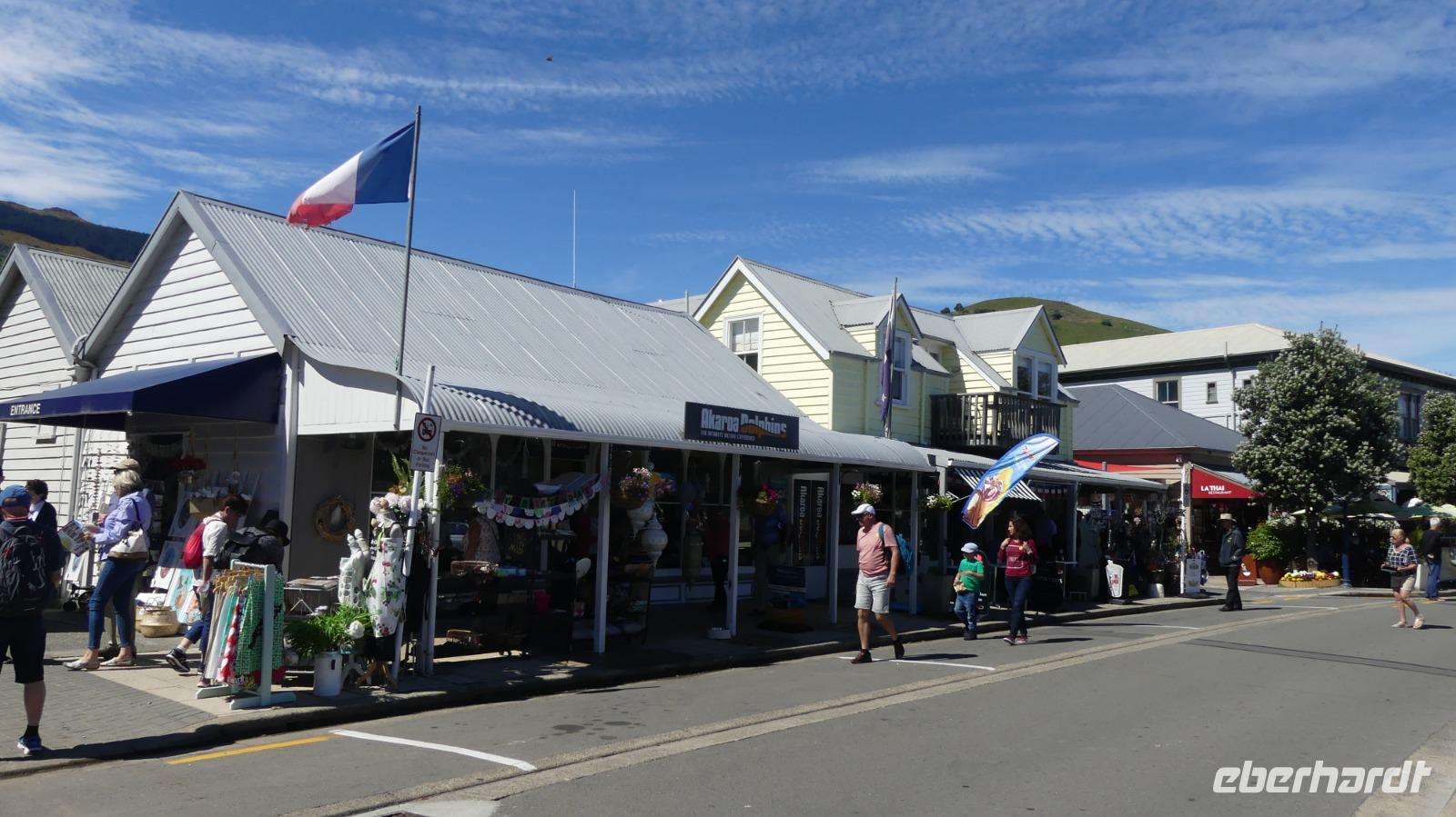 In Akaroa angekommen, erwartet uns ein schmucker kleiner Ort. Geprägt von den französischen Siedlern finden wir hier ein französisches Flair mit Straßencafés, französischen Straßennamen und den Farben der Trikolore vor. Viele nutzen die Freizeit im Ort, um eine Postkarte zu schreiben oder via Internet Verbindung mit der Heimat aufzunehmen.