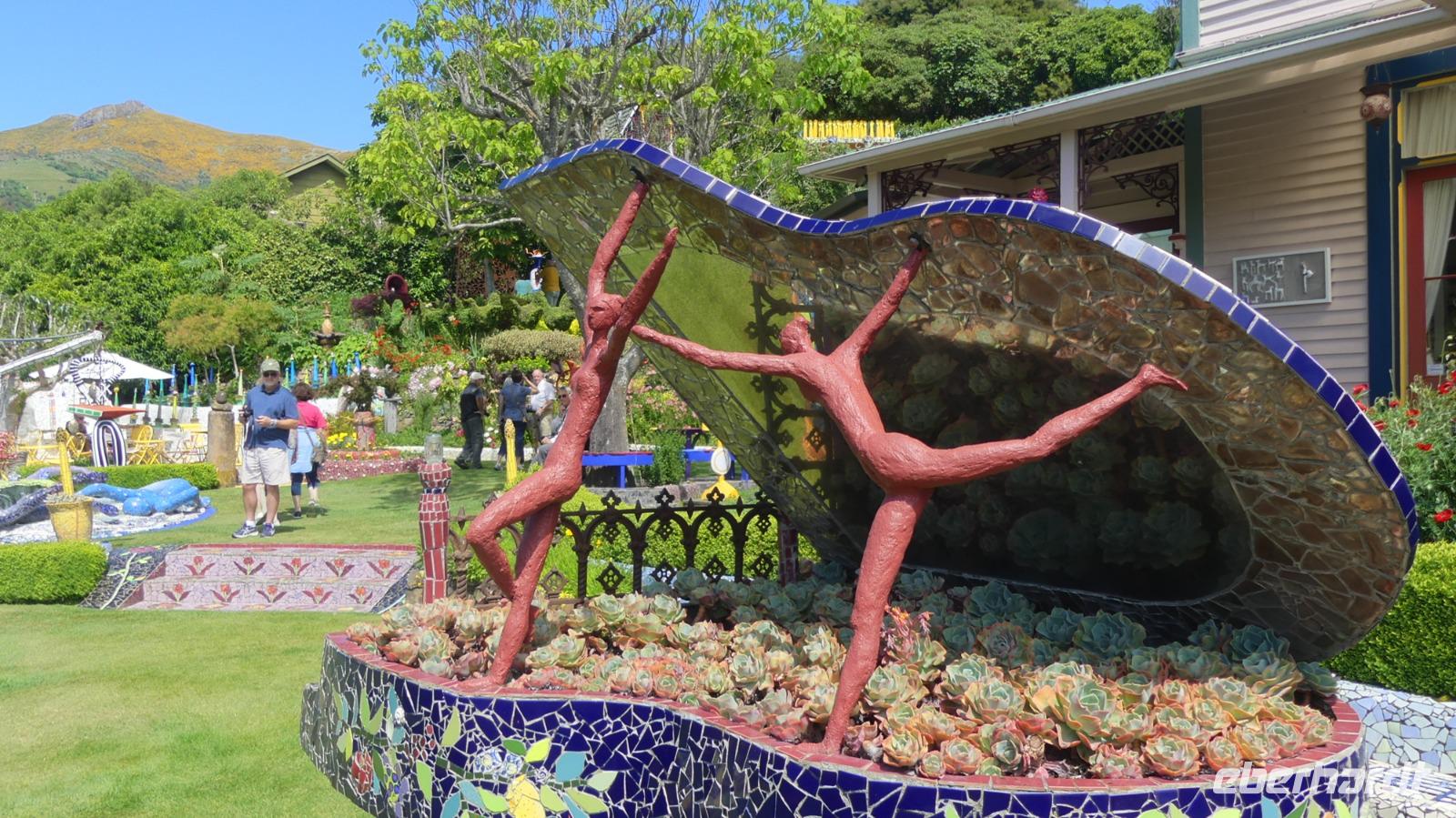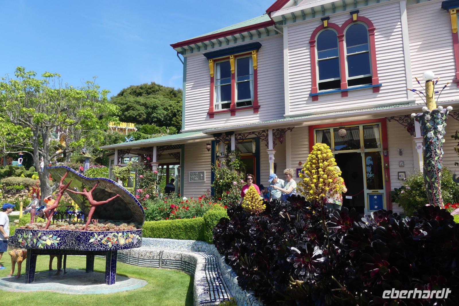 Unser 3-stündiger Ausflug beinhaltet eine Panoramafahrt und den Besuch des sogenannten Giant´s House. Dabei fahren wir bis hoch auf den Kraterrand, der über 500 Meter hoch liegt und tolle Ausblicke auf die Bucht von Akaroa und die Pazifikküste bietet. Wir erfahren, wie Vulkane und die Eiszeit diese grandiose Landschaft geformt haben und warum die zierlichen Opossums hier ein Plage sind. Das „Haus der Riesen - The Giant´s House" erweist sich als Künstlerhaus, Kunstgallerie, Skulpturenpark und Mosaikgarten. Einst blickte ein kleines Mädchen aus dem Tal hinauf auf das Haus und dabei erschien es ihr so riesig groß, das sie glaubte, da müssten Riesen drin wohnen. Und schon hatte das Haus seine Namen. Ihre heutige Bewohnerin Josie Martin hat daraus ein Kunstwerk entstehen lassen, das wirklich einen Besuch lohnt.