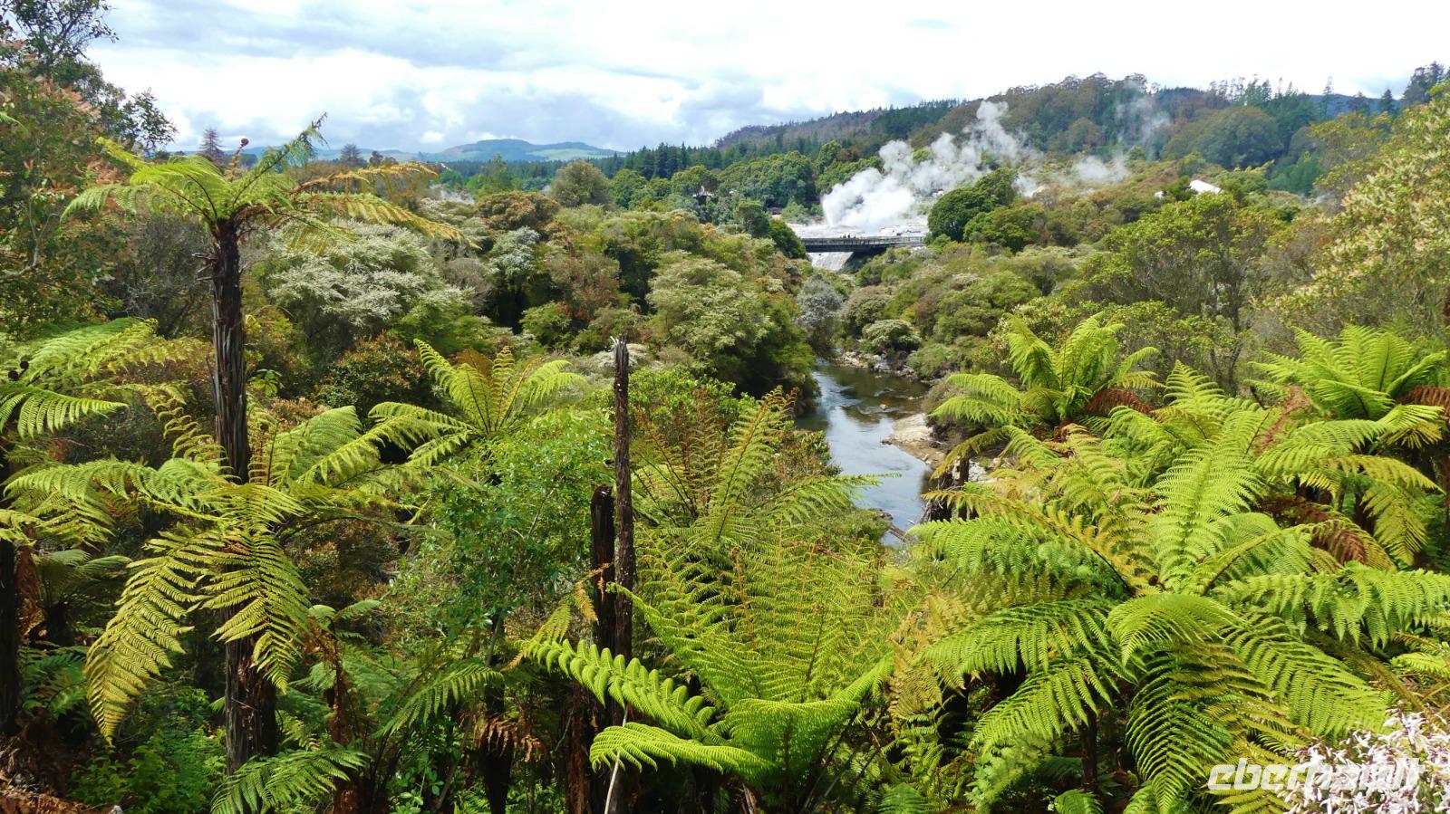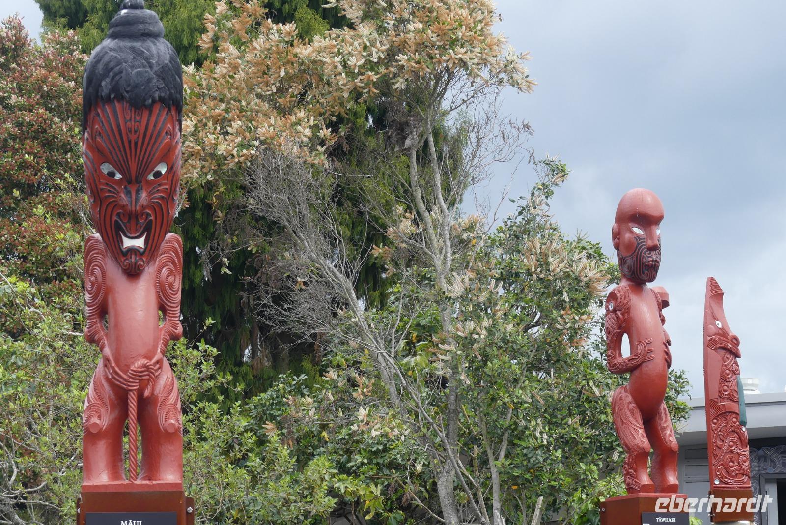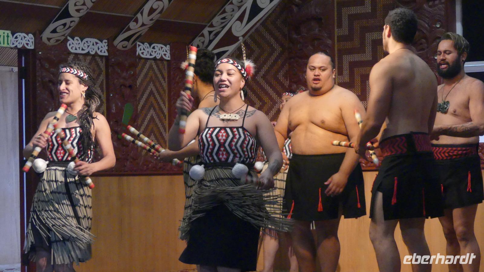 Die Thermalfelder von Whakarewarewa sind bekannt für Blasen werfende Schlammlöcher und den 30 m hohen Pohutu-Geysir, der mehrmals am Tag ausbrechen soll, nur eben nicht gerade zu unserer Besuchszeit. Die weitläufige Anlage beherbergt auch eine Station für die Aufzucht von Kiwivögeln. Hier werden Eier ausgebrütet und die Jungtiere aufgezogen, um ihre Überlebenschancen zu verbessern. Da sie nachtaktiv sind, können wir sie im abgedunkelten Raum allerdings nicht erkennen. Zum Abschluss besuchen wir im Maori-Museumsdorf eine Vorführung der Maori. Unverkennbar ist ihre polynesische Abstammung.