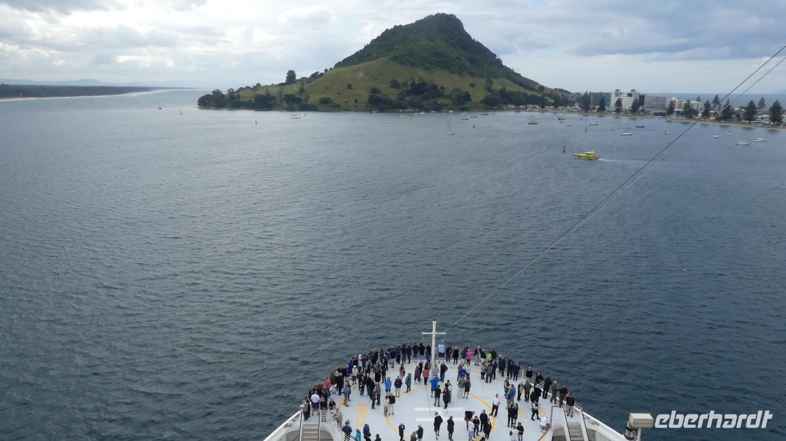 Pünktlich, 15 Minuten vor der letzten Frist erreichen wir unser Schiff in Tauranga. Wir liegen in einem sehr schönen Naturhafen. An dessen Zufahrt befindet sich direkt am Meer und dem Hauptstrand der Mount Maunganui, ein erloschener Vulkankegel.