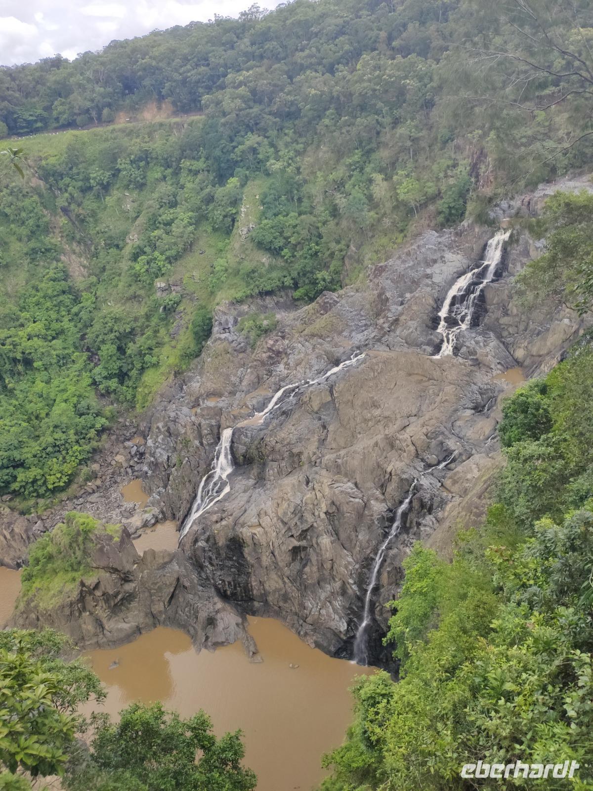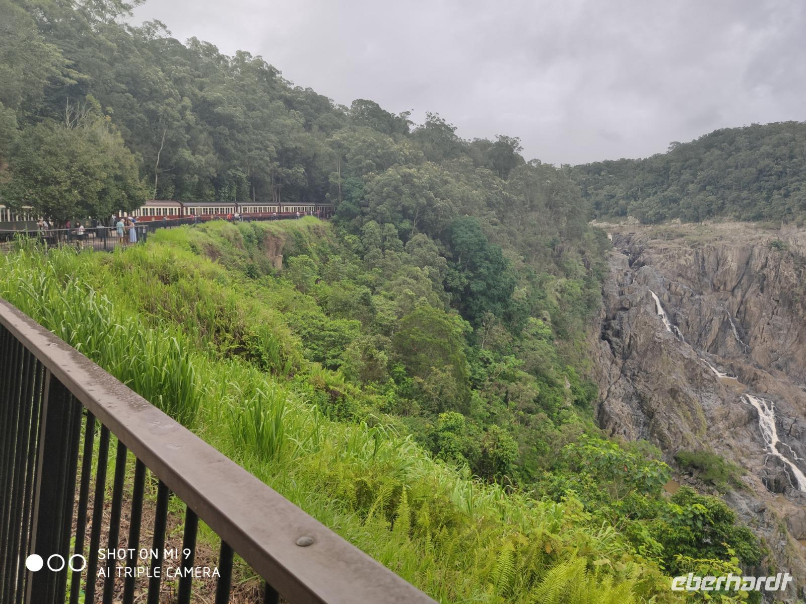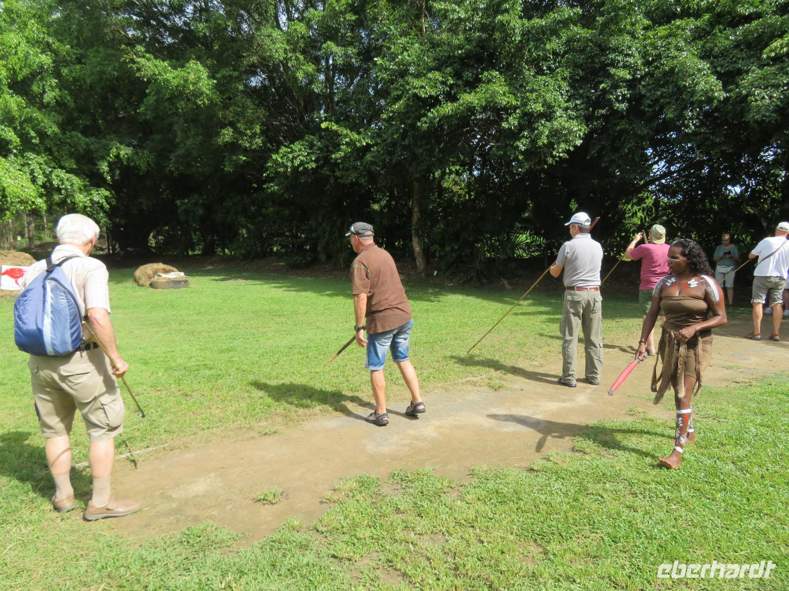 Am nächsten Morgen führte uns die Fahrt zuerst zum Tjapukai Cultural Center, wo uns die Sichtweise der Djabugay auf die Entstehung des Lebens nähergebracht werden sollte. Doch bevor es dazu kam, stand ein wenig Frühsport auf dem Programm. Um das Leben und die Kultur der Aboriginals zu verstehen, muss man es mit eigenen Augen gesehen und selbst ausprobiert haben. So startete der Vormittag nach einer allgemeinen Erklärung über die Herstellung von Boomerangs, mit einer Einweisung in die richtige Wurftechnik. Die Aboriginal People versuchten mit dem Werfen dieses Instruments Tiere so zu treffen, dass diese nicht mehr weiter rennen konnten. Nur die wenigsten von uns wussten, dass Boomerangs in unterschiedlichen Formen gestaltet werden. So gibt es neben dem „klassischen" Boomerang in „L-Form" auch X- Förmige Wurfgeschosse. Nach einigen Selbstversuchen konnten die meisten Mitreisenden von sich behaupten den Bogen rauszuhaben. Die nächste überlebensnotwendige Technik, die es galt zu lernen, war die Kunst des Speerwurfs. Dabei wurde der Speer in eine Vorrichtung mit Widerhaken eingespannt, aus der er dann beim Wurf herauskatapultiert wurde. Mit Hilfe dieses Instruments vergrößert sich die Wurfkraft und die Wahrscheinlichkeit steigt, das anvisierte Tier zu treffen und im besten Fall zu erlegen. Neben diesen Waffen gibt es aber noch zahlreiche weitere, die auf der Jagd oder im Kampf eingesetzt werden können. Die aus Holz gefertigten Waffen dienen mitunter bis heute in der Kultur der Aboriginals zur Bestrafung. Keule, Fischgrätenmesser und Schwert werden immer dann eingesetzt, wenn sich ein Mitglied des Stammes nicht an die Regeln hält. Die anschließende Versorgung des Missetäters durch den Strafenden ist dabei genauso Teil ihrer Kultur. Die dafür notwendigen Kenntnisse über die heilende Wirkung unterschiedlicher Pflanzen des Regenwalds wurden uns in einer anschließenden „Medizinstunde" nähergebracht. Die verschiedenen Früchte und Pflanzen des tropischen Regenwaldes eigenen sich trotz vieler giftiger Ausnahmen zur Behandlung verschiedenster körperlicher Beschwerden. Unser Weg führte uns danach zurück in das Informationscenter. Dort erfuhren wir, dass es im Glauben der Aboriginals nur zwei Jahreszeiten gibt - eine Trockene und eine Feuchte. Diese beiden Extreme braucht es, um die Welt im Gleichgewicht zu halten. Die in den Mythen der Aboriginals enthaltene Regenbogenschlange ist ebenso an der Entstehung der Welt beteiligt, wie das Kasuar Ei, aus dem die Welt entstanden ist. Eine anschließende Fahrt mit der Seilbahn führte uns über die Baumwipfel des Regenwaldes bis nach Kuranda. An den zwei Haltepunkten entlang der 7km langen Strecke konnte man auf Pfaden durch einen kleinen Teil des reichbewachsenen Urwaldes gehen und somit die einzigartige Pflanzenvielfalt aus nächster Nähe betrachten. Passend zum Regenwald goss es wie aus Eimern, allerdings immer dann, wenn wir in den Gondeln saßen. Bei der zweiten Zwischenstation kam man nach kurzer Zeit zu einem Aussichtspunkt mit Blick auf die „Barron Falls". Das Wasser fällt hier 265m in die Tiefe. Im Künstlerdorf Kuranda angekommen nutze jeder die Zeit individuell. Während die einen Souvenirs erstanden, unternahmen andere einen Spaziergang entlang des Flusses. Zum Abschluss des Tages bestieg man die Schmalspurbahn der „Kuranda Scenic Railway", die sich 33 km bis nach Cairns erstreckt. Ab 1887 errichtet, diente sie vor allem dazu das Gold aus den Bergen in Richtung Küste zu transportieren. 55 Brücken und 15 Tunnel wurden während der zwei stündigen Fahrtzeit passiert, bevor man in Freshwater den Zug verließ und auf den Bus umstieg, der uns wieder zum Hotel fuhr. Natürlich durfte ein Fischgericht nicht auf dem Speiseplan fehlen, befand man sich doch direkt an der Küste. Abends wurde daher bei „Lucky Fish" eingekehrt, wo vor allem die einheimischen Fische Barramundi und Coral Trout probiert wurden, bevor man sich schlafen legte.