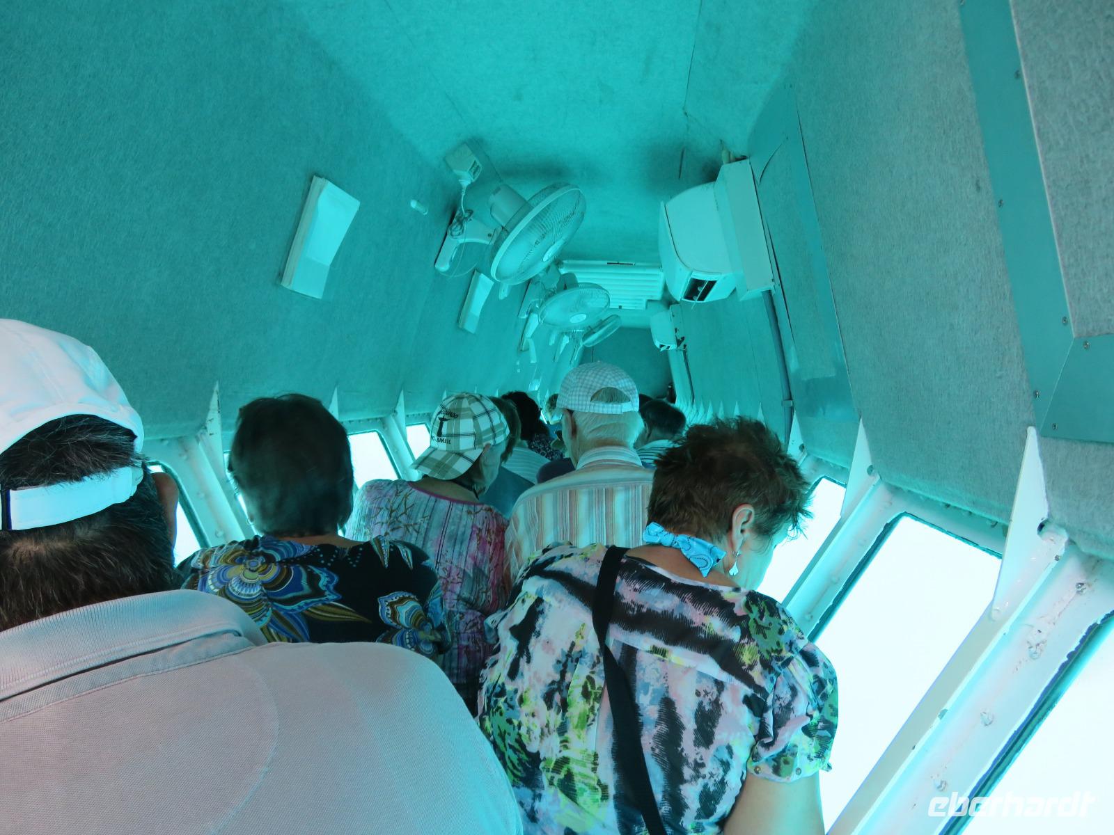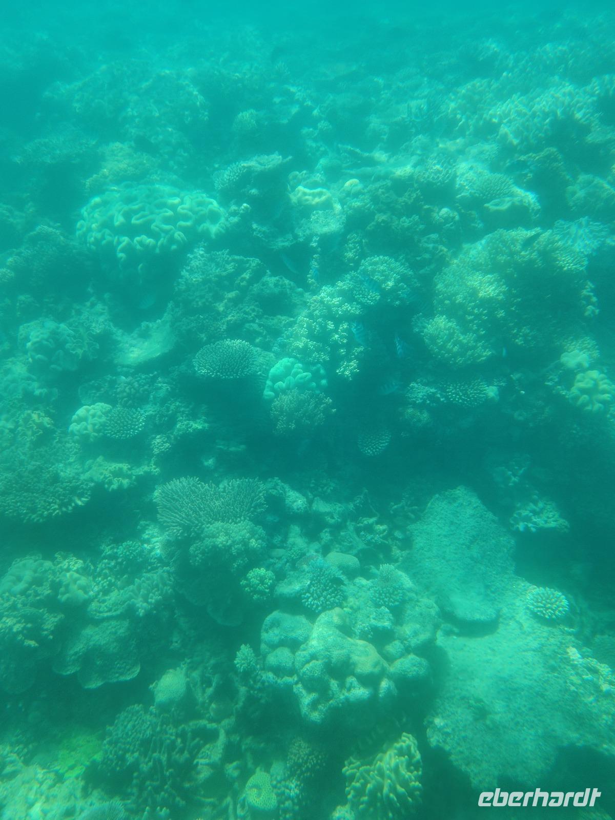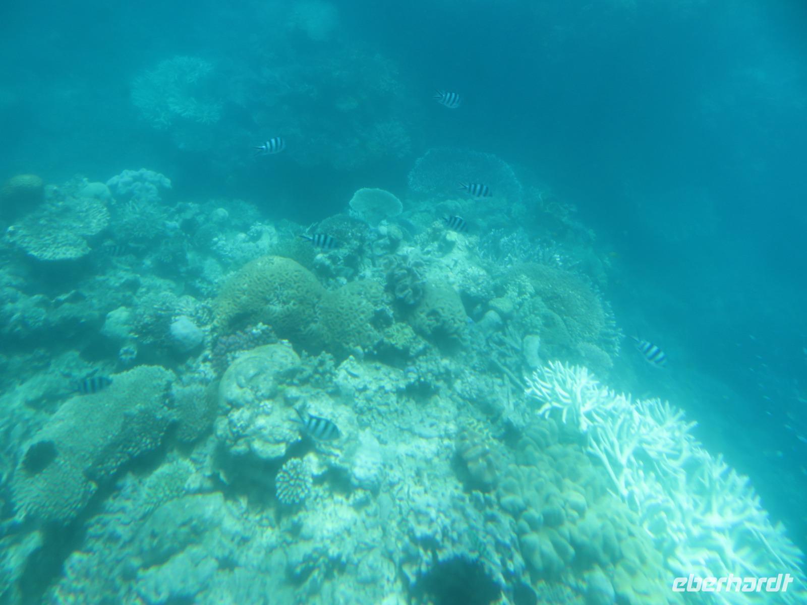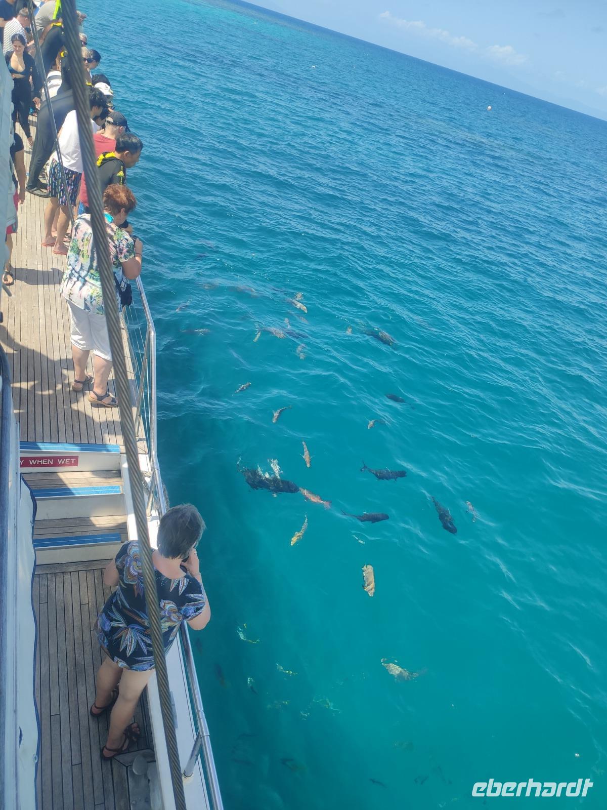 Nachdem man ein schnelles Frühstück zu sich genommen hatte, ging es mit dem Bus in Richtung Cairns zum Katamaran Anleger. Von hier aus sollte der heutige Ausflug zum Great Barrier Reef starten, das sich über eine Länge von 2300 km vor der Nordostküste Australiens erstreckt. An Bord der Ocean Spirit erreichten wir nach anderthalb Stunden Fahrt die Michaelmas Cay, eine kleine Insel. Vor Ort stand zuerst eine Fischfütterung auf dem Programm, ehe die ersten Korallen aus einem „Unterseeboot" in Augenschein genommen wurden. Im Anschluss an das Mittagessen an Bord, wurden die Schnorchel und Schwimmflossen angelegt und man konnte aus nächster Nähe die Korallen und zahlreiche Fische bestaunen. Bis in den Nachmittag hinein konnte man bei herrlichen Temperaturen die Unterwasserwelt beobachten, bevor es wieder Richtung Land ging. Auf dem Rückweg wurde bei einem Glas Sekt und Häppchen auf den großartigen Tag angestoßen. Kurz danach erreichten wir Cairns und hatten nun wieder festen Boden unter den Füßen. Am Abend nutzten einige Gäste noch die Möglichkeit an der Strandpromenade von Palm Cove spazieren zu gehen und den Sonnenuntergang zubeobachten.