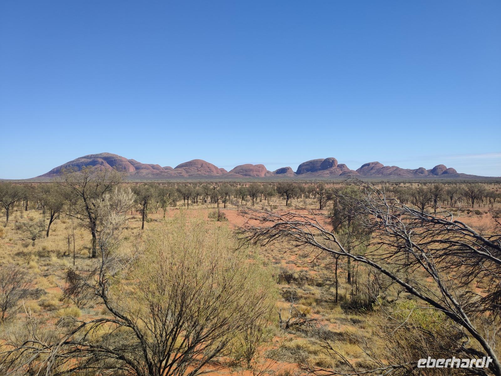 Von der Küste Australiens mit dem endlosen Meer, sollte es heute zum kompletten Gegenteil ins Outback gehen. Es erwartete uns das staubtrockene Landesinnere des roten Kontinents mit dem berühmten Monolithen, dem „Uluru". Bepackt mit einer Frühstücksbox ging es zeitig zum Flughafen nach Cairns. Unterwegs konnte man Wallabys beobachten, die bereits munter über die Straße hüpften. Schon beim Landeanflug konnte man die endlose Weite erahnen, nur unterbrochen vom Uluru und den Kata Tjutas als Erhebungen. Bei Temperaturen um die 35 Grad gab es so gut wie keine Luftfeuchtigkeit im Gegensatz zur Küstenregion. Bevor die Zimmer bezogen werden konnten, machte man sich auf den Weg zur zweiten Erhebung im Nationalpark, den „Kata Tjutas" oder auch „Olgas" genannt. Diese stehen immer ein wenig im Schatten des berühmten Ulurus, sind aber nicht weniger beeindruckend. Bei mehreren kleinen Wanderungen konnten diese Felsformationen betrachtet werden. Nach dem Zimmerbezug konnten dem Swimmingpool ein Besuch abgestattet oder das kleine Zentrum des Dorfes besichtigt werden. Das Dorf entstand erst in den 1980er Jahren, als zunehmend mehr Touristen den Ayers Rock besuchten und eine touristische Infrastruktur zwingend benötigt wurde. Am Abend fuhr man ein zweites Mal in Richtung Nationalpark, um den Sonnenuntergang am Uluru mitzuerleben. Die Sonne tauchte ihn in ein sattes Rot, bevor er im Anschluss minütlich seine Farbe änderte. All dies genossen wir bei Sekt und Häppchen als kleine Stärkung, bevor man im Hotel ein typisch australisches BBQ zu sich nahm. Hierbei hatte man die Wahl zwischen verschiedenen Fleischsorten, u.a. Krokodil oder Känguru. Während des Essens wurde Live-Music geboten und man konnte die Gelegenheit nutzen selbst das Tanzbein zu schwingen.