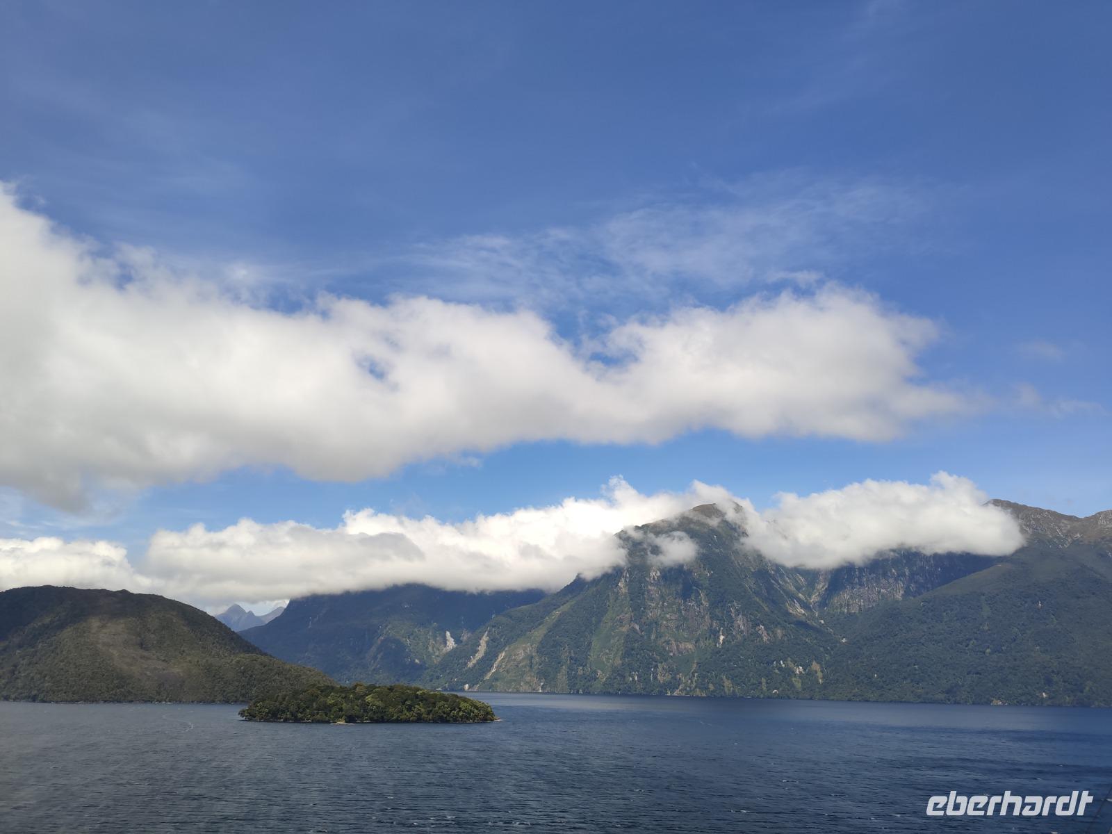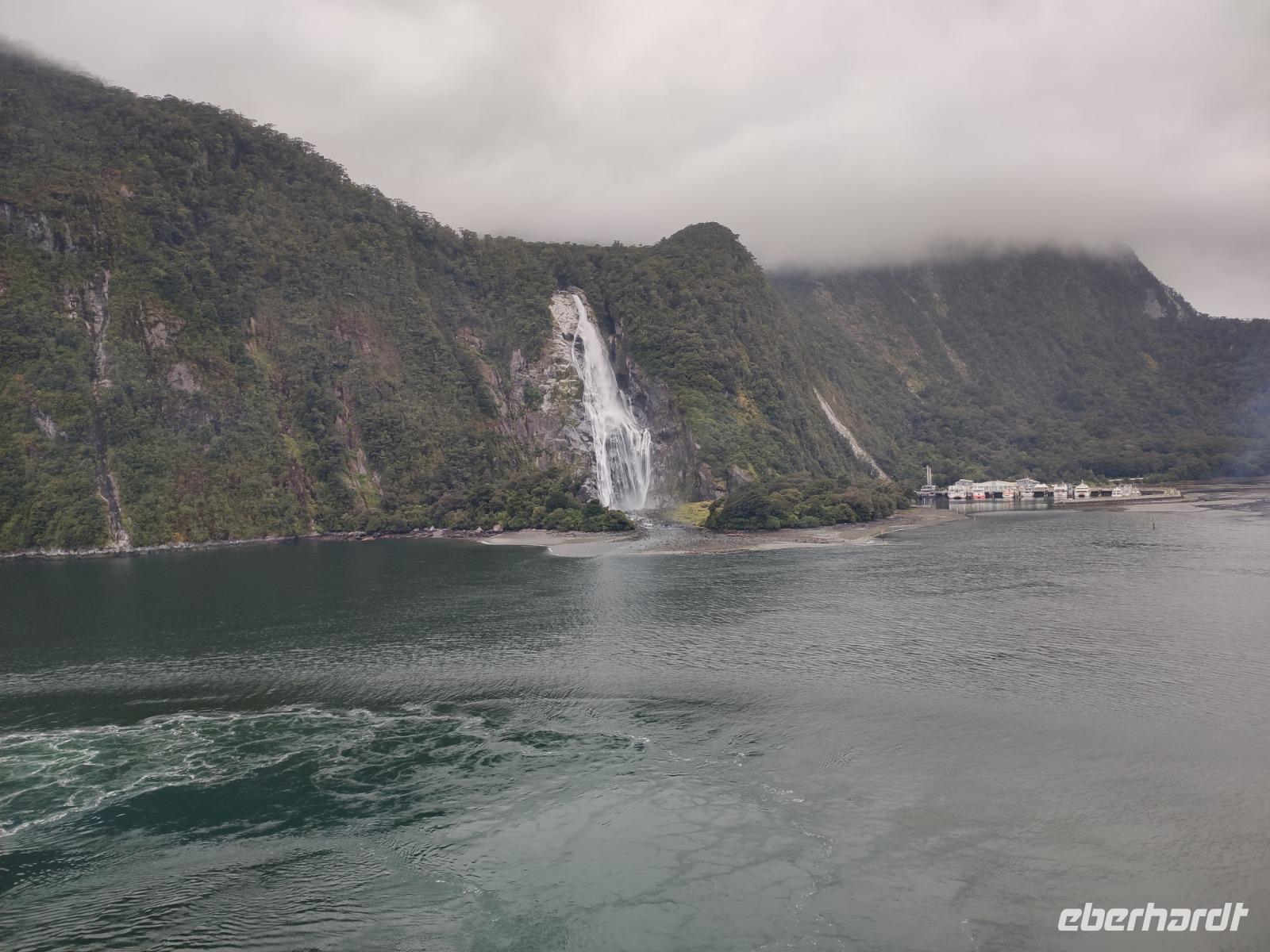 Heute befuhr man mit dem Schiff den größten Nationalpark Neuseelands, den Fiordland Nationalpark. Dieser besteht aus drei Fjorden, und wurde 1990 in die Liste des UNESCO Welterbes aufgenommen. Den Anfang machte der Milford Sound, den man während des Frühstücks befuhr, hierbei war vor allem der 1600m hohe Mitre Peak (Bischhofsmütze) besonders spektakulär. Rudyard Kipling beschrieb diesen als achtes Weltwunder. So rast das Wasser 161m bei den Bowen Falls in die Tiefe. Zur Mittagszeit klarte das Wetter auf, sodass man bei Sonnenschein den Doubtful Sound, mit 420m Tiefe, der tiefste der Fjorde Neuseelands, passierte. Der Name kommt dabei von einem zweifelnden James Cook, der sich nicht sicher war, ob er diesen befahren könne. Ein ungewöhnliches Schauspiel und Ökosystem entsteht durch das Aufeinandertreffen einer Wasserschicht aus Süßwasser und einer aus Salzwasser. Am Nachmittag stand der 44km lange Dusky Sound auf dem Programm, den man teilweise befuhr. Hier war der Name, den ihm James Cook im Jahre 1770 gab, passend zum Wetter, nämlich nebelig und bewölkt. Wieder auf offener See hieß es Kurs in Richtung Dunedin zu nehmen.