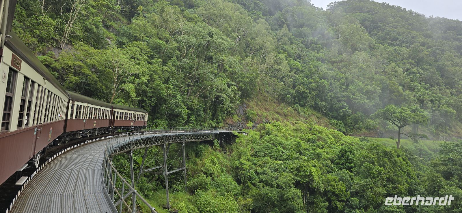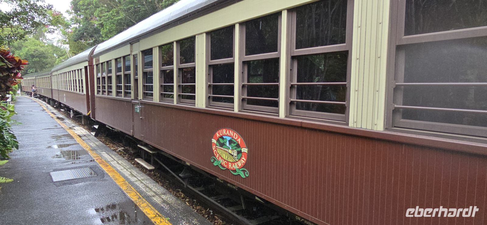 Am Nachmittag wartet Nostalgie pur: die Scenic Railway. Gemächlich ruckelt der historische Zug durch den Regenwald, vorbei an tiefen Schluchten, dichter Vegetation und immer wieder an den Barron Falls. Die Fensterblicke liefern Fotomotive am laufenden Band.
