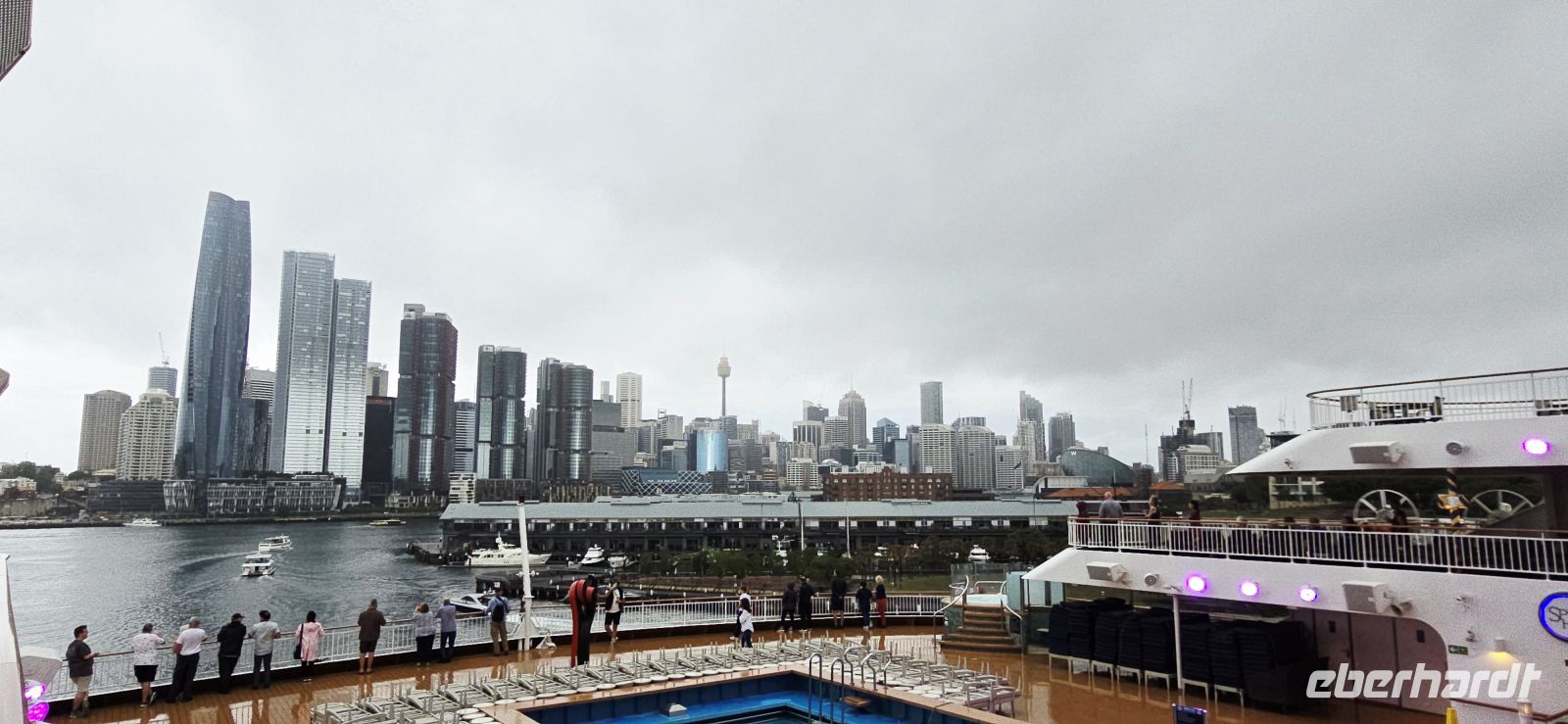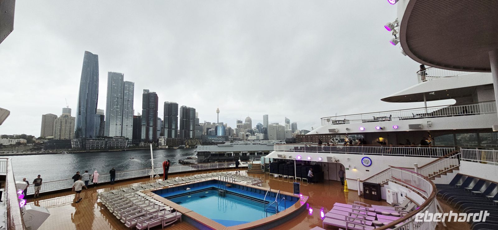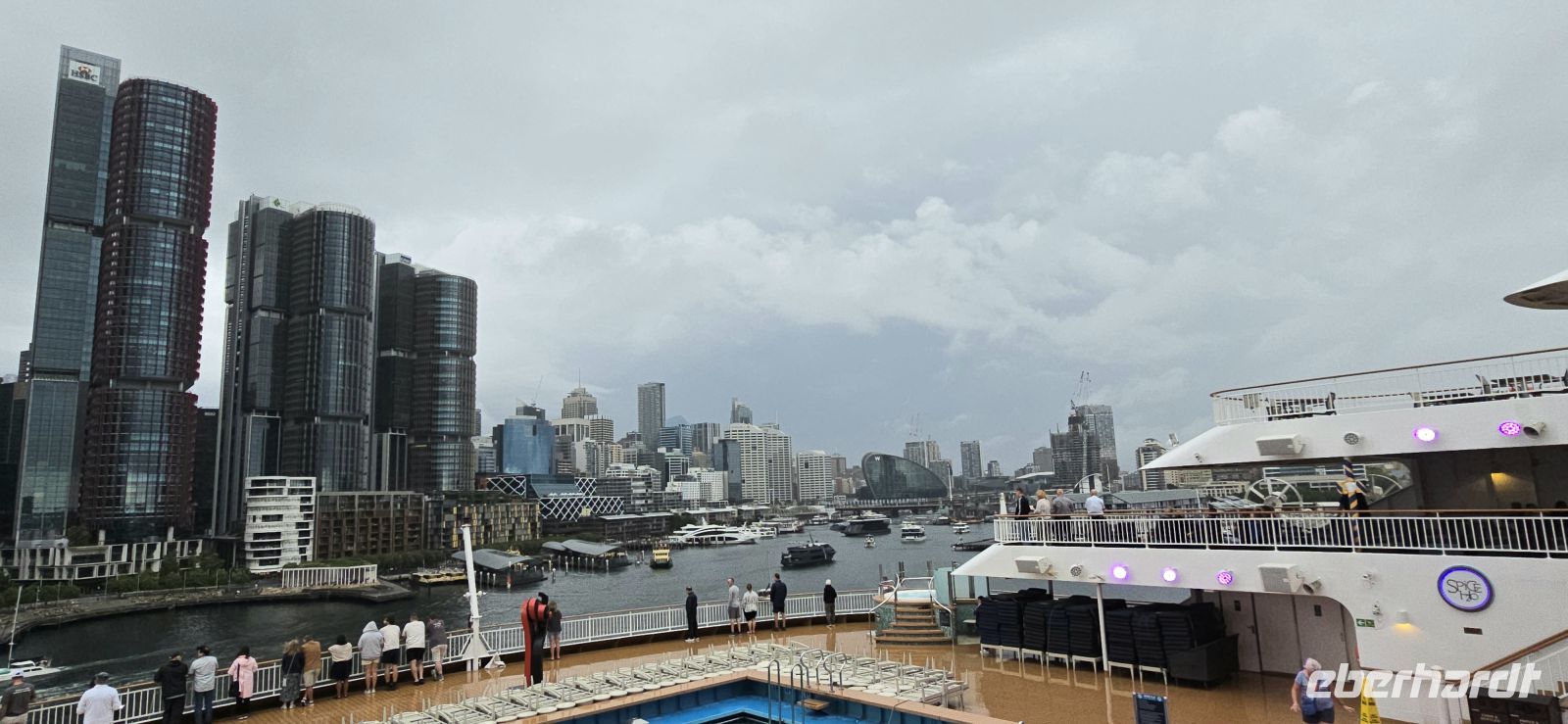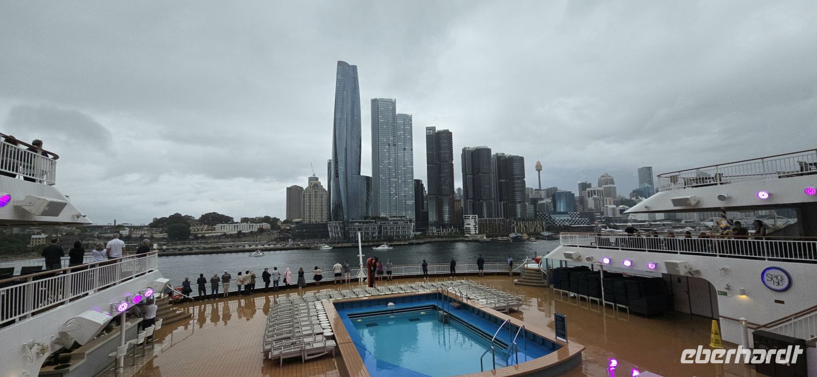 Der Check-in selbst läuft erstaunlich flott. Kaum an Bord, gibt es den ersten Snack, und fast schon unheimlich schnell sind die Kabinen bezugsfertig. Die Koffer folgen kurz darauf – besser kann ein Start kaum laufen. Zeit für den ersten Drink, diesmal mit Regenschutz, und natürlich für jede Menge Fotos. Der Blick auf Darling Harbour und die Skyline ist einfach zu schön, um ihn nur einmal festzuhalten.