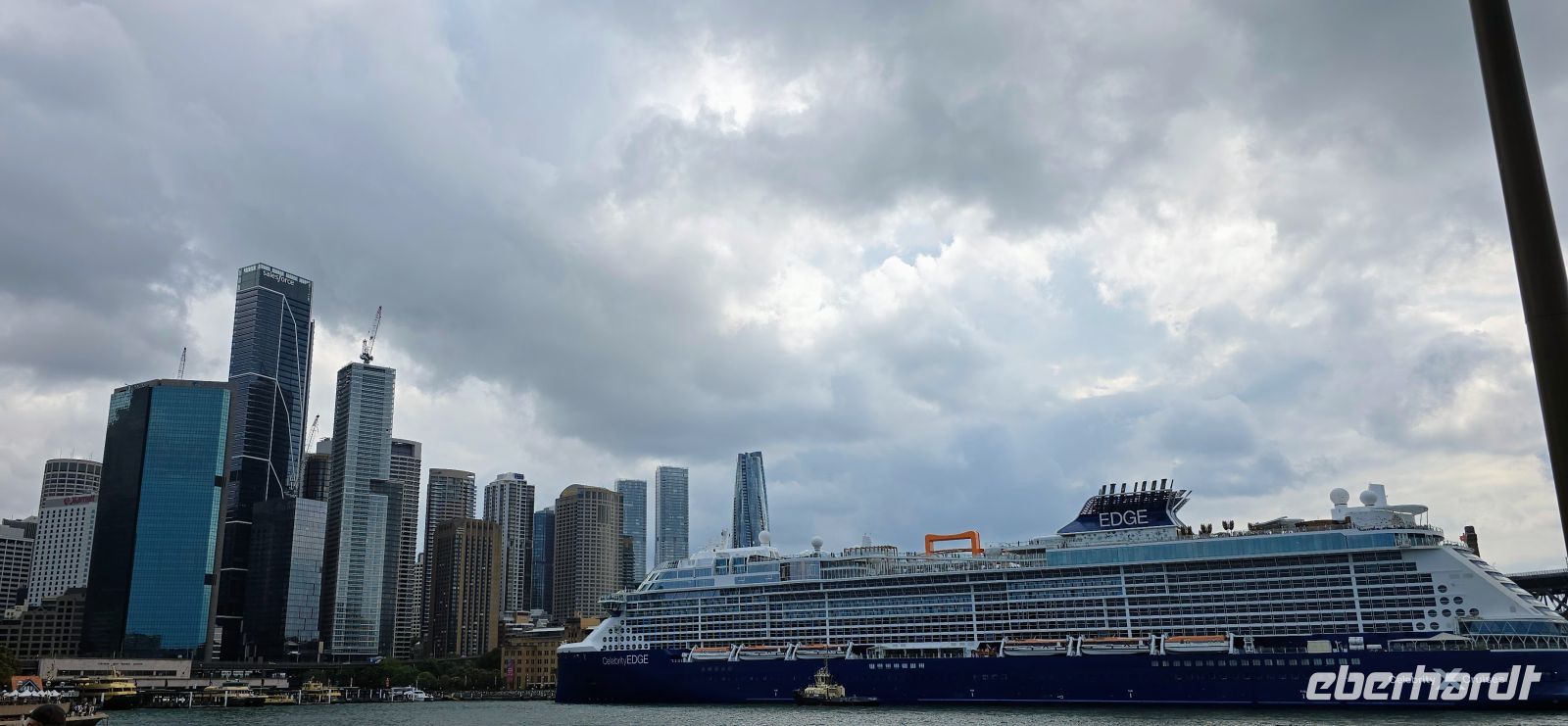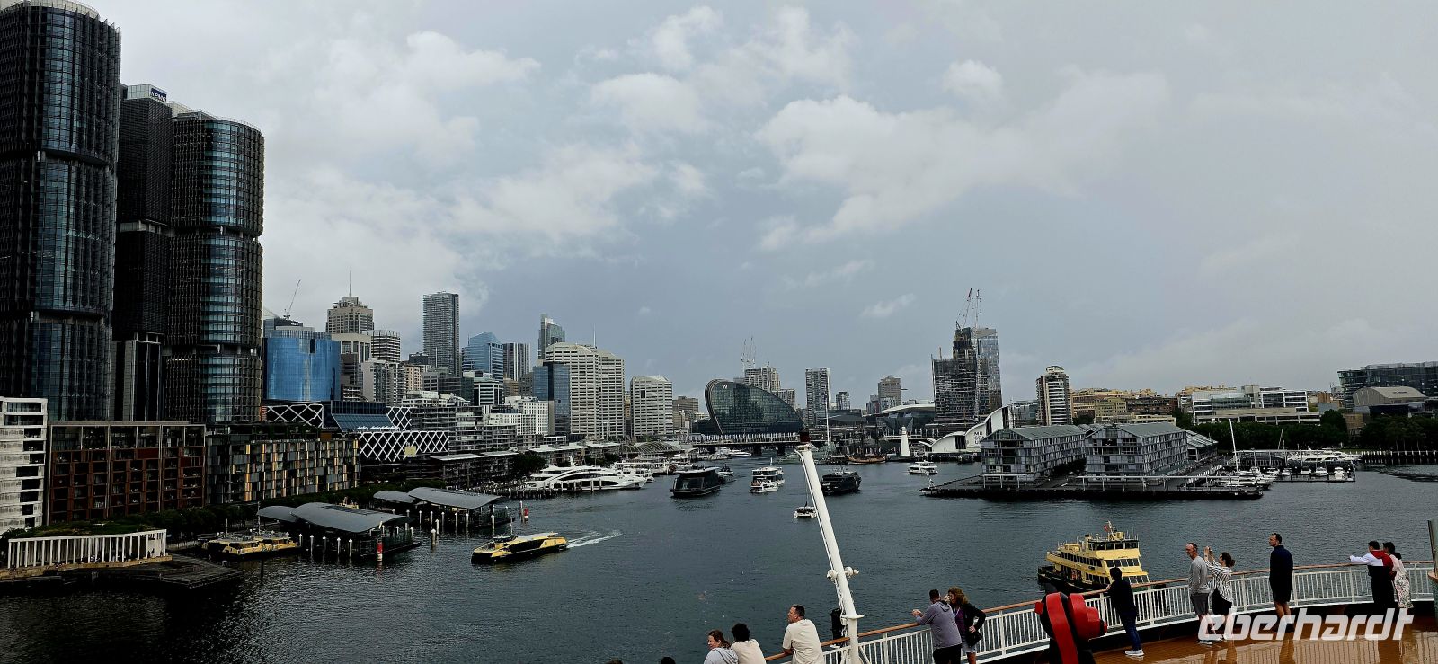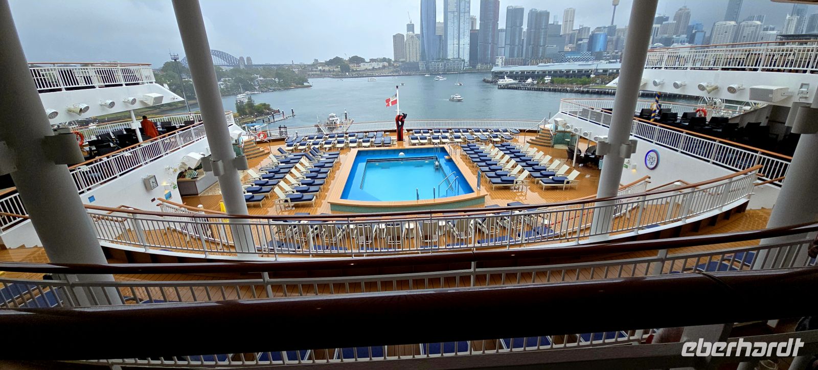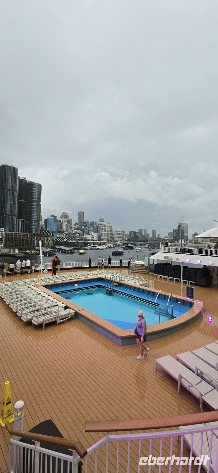 Der Check-in selbst läuft erstaunlich flott. Kaum an Bord, gibt es den ersten Snack, und fast schon unheimlich schnell sind die Kabinen bezugsfertig. Die Koffer folgen kurz darauf – besser kann ein Start kaum laufen. Zeit für den ersten Drink, diesmal mit Regenschutz, und natürlich für jede Menge Fotos. Der Blick auf Darling Harbour und die Skyline ist einfach zu schön, um ihn nur einmal festzuhalten.