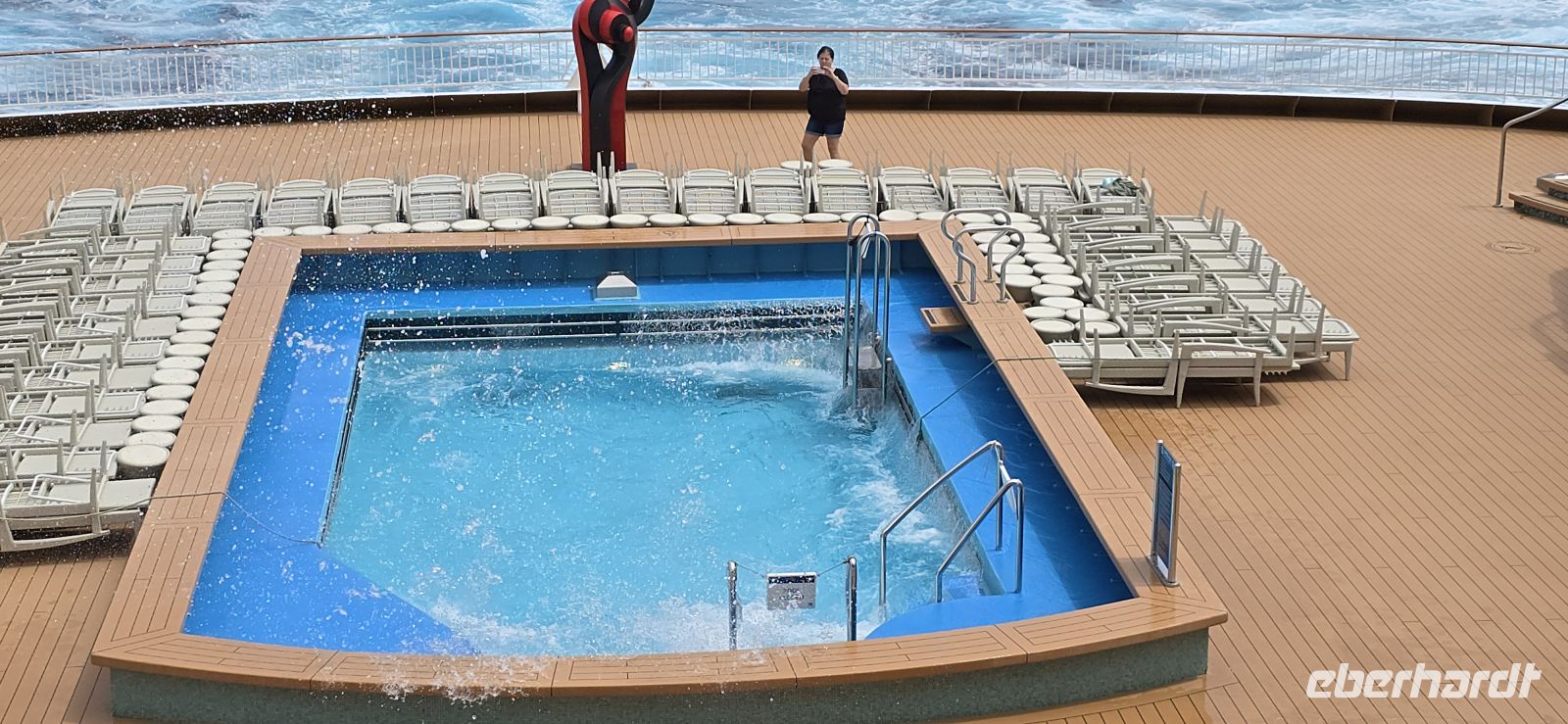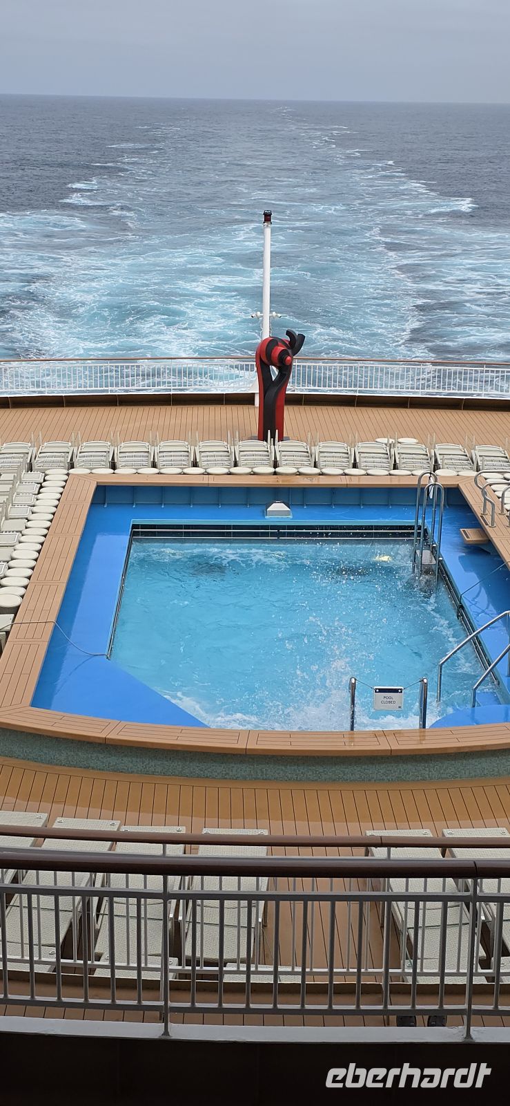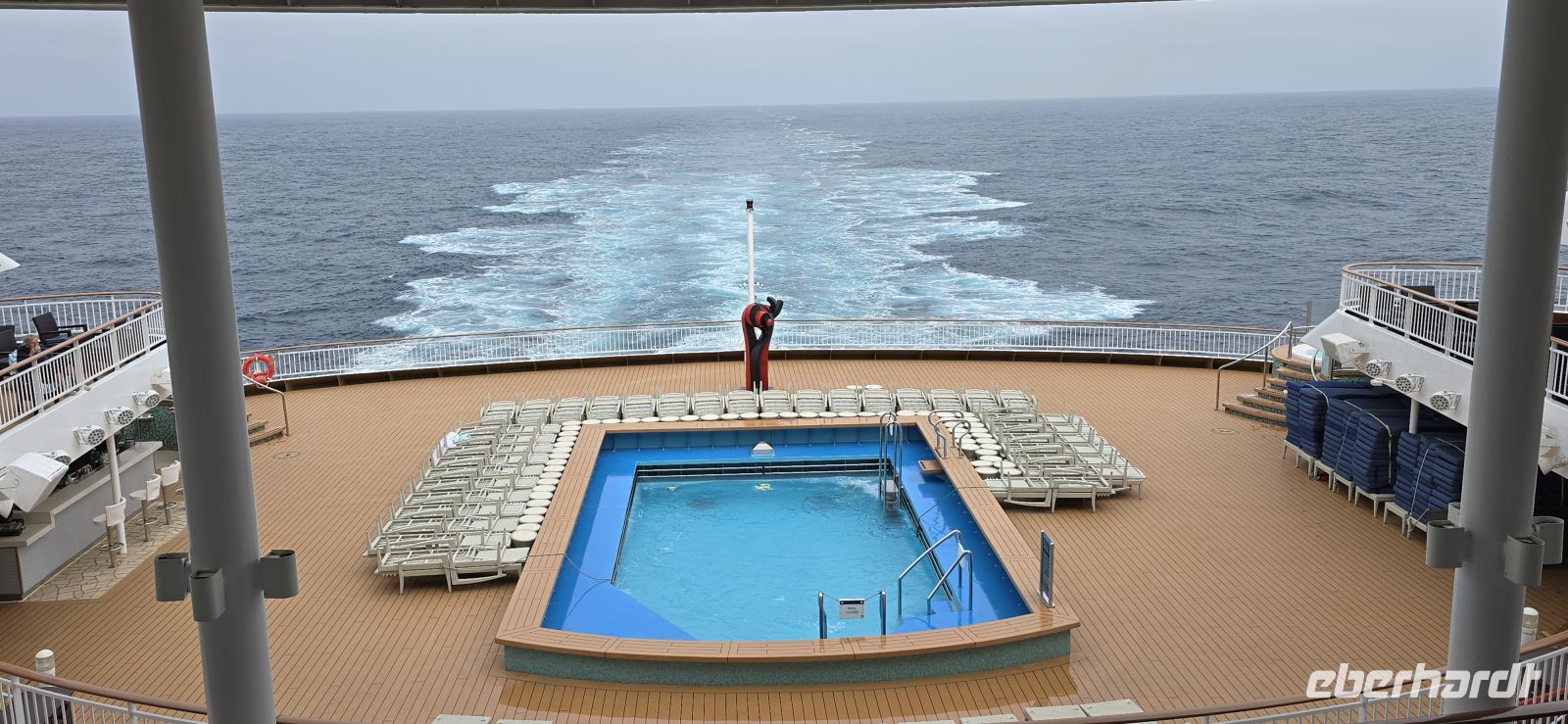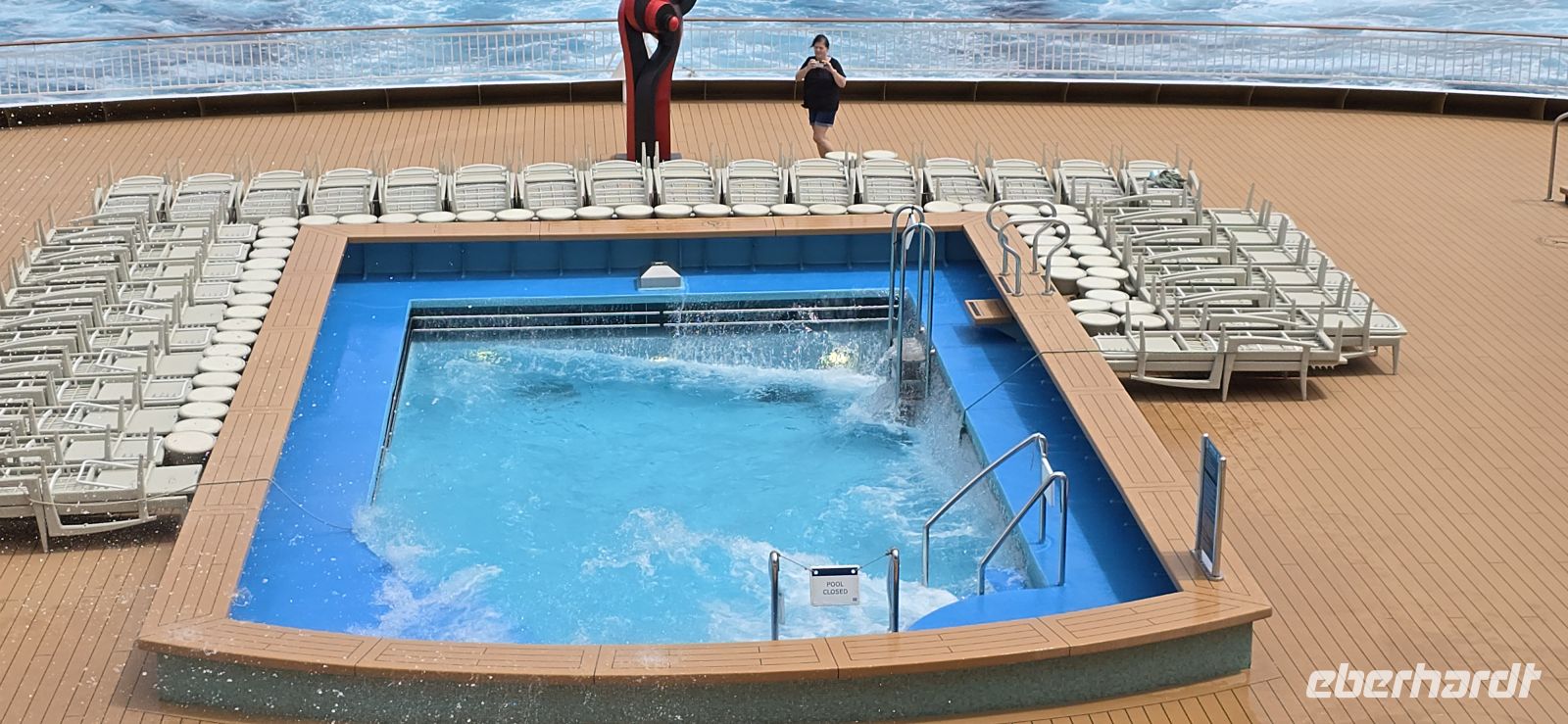 Die Pools bleiben vorsorglich geschlossen. Das Restwasser hätte sich bei jeder größeren Welle ohnehin großzügig über das Deck verteilt – kostenlose Duschen gibt es heute also nicht. Sicherheit geht vor, Humor hilft.
