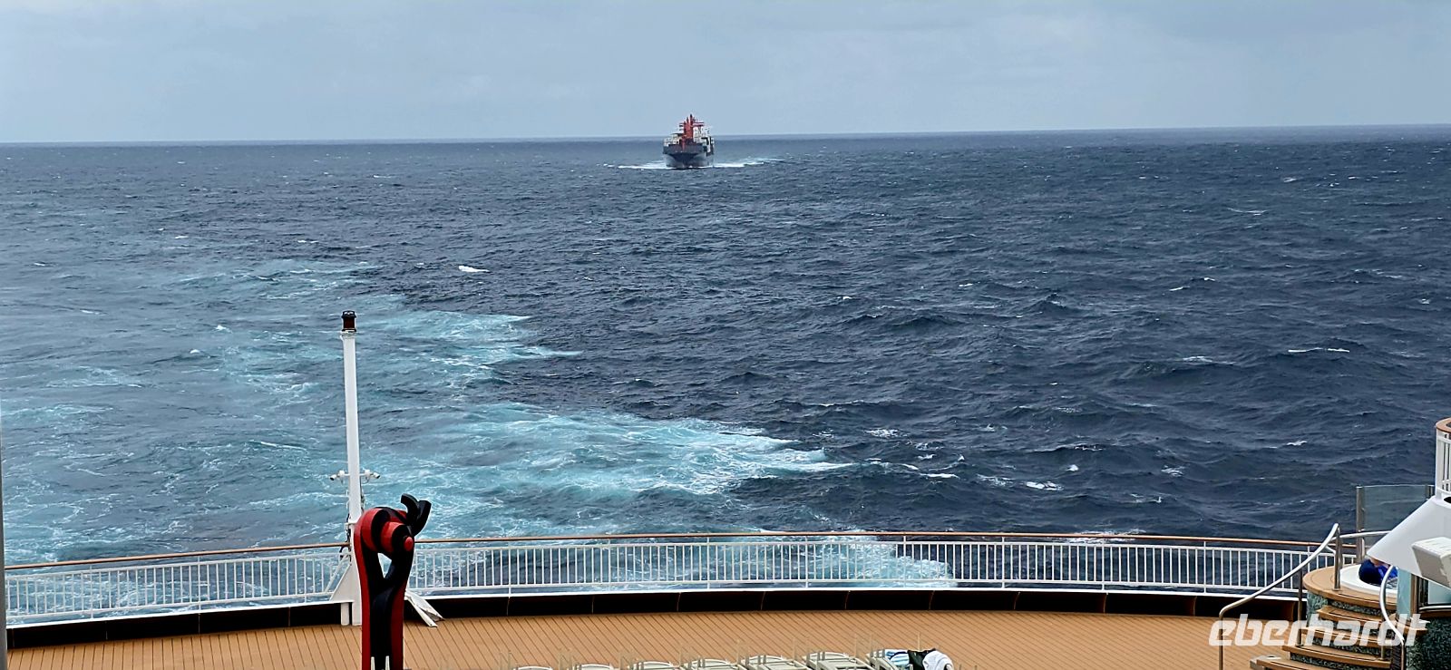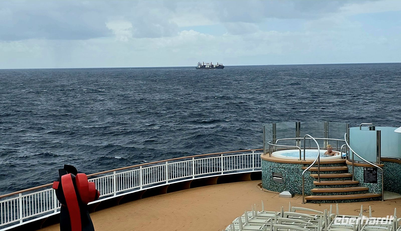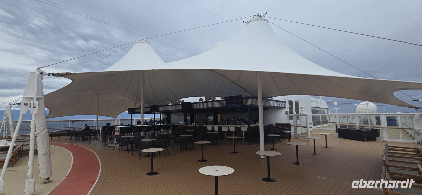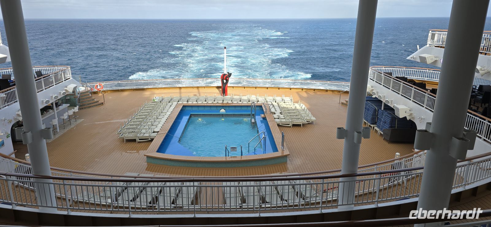 Die Pools bleiben vorsorglich geschlossen. Das Restwasser hätte sich bei jeder größeren Welle ohnehin großzügig über das Deck verteilt – kostenlose Duschen gibt es heute also nicht. Sicherheit geht vor, Humor hilft.