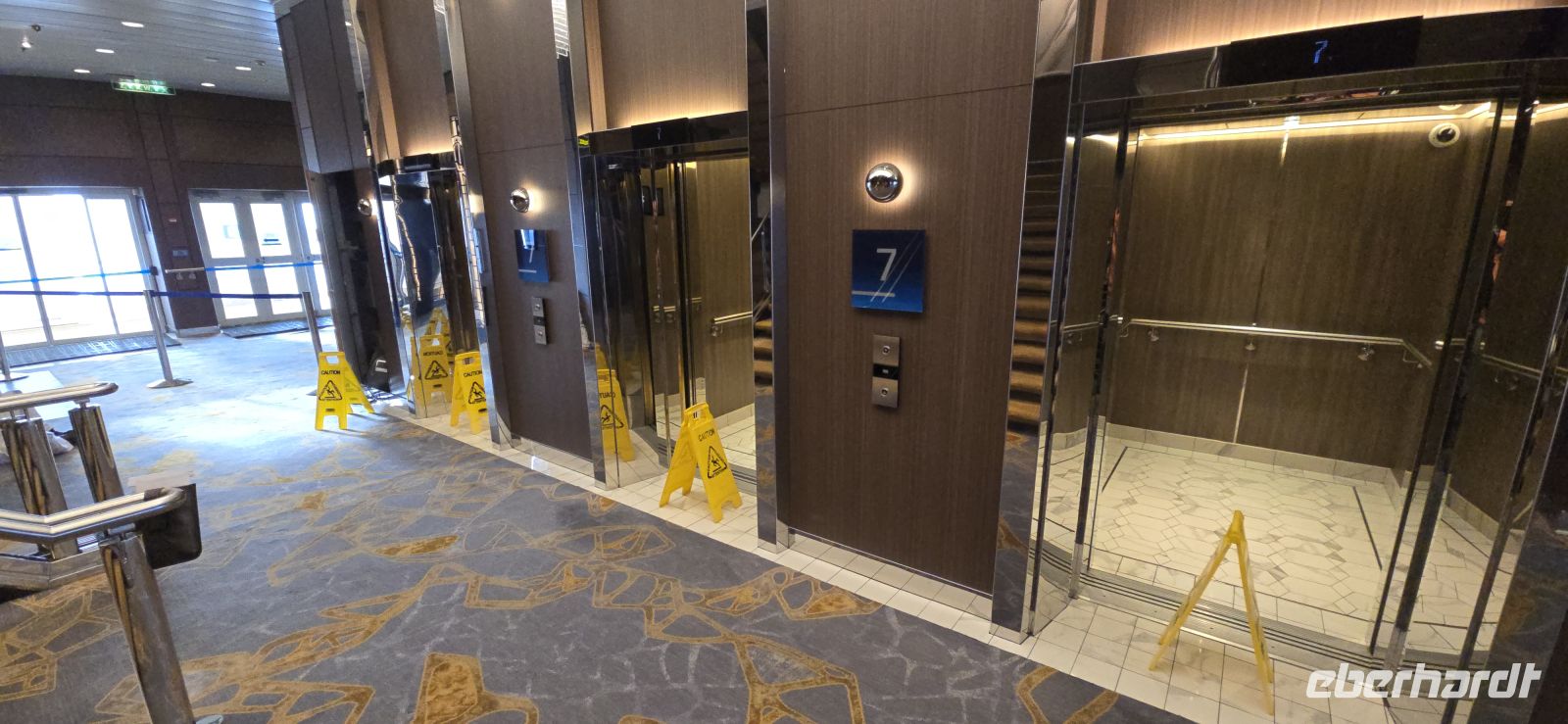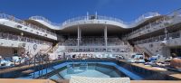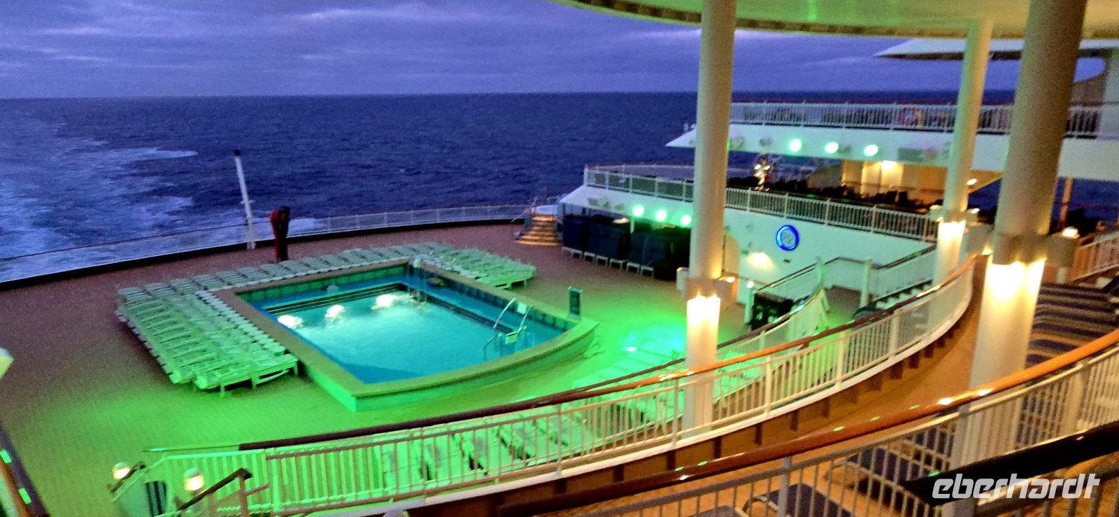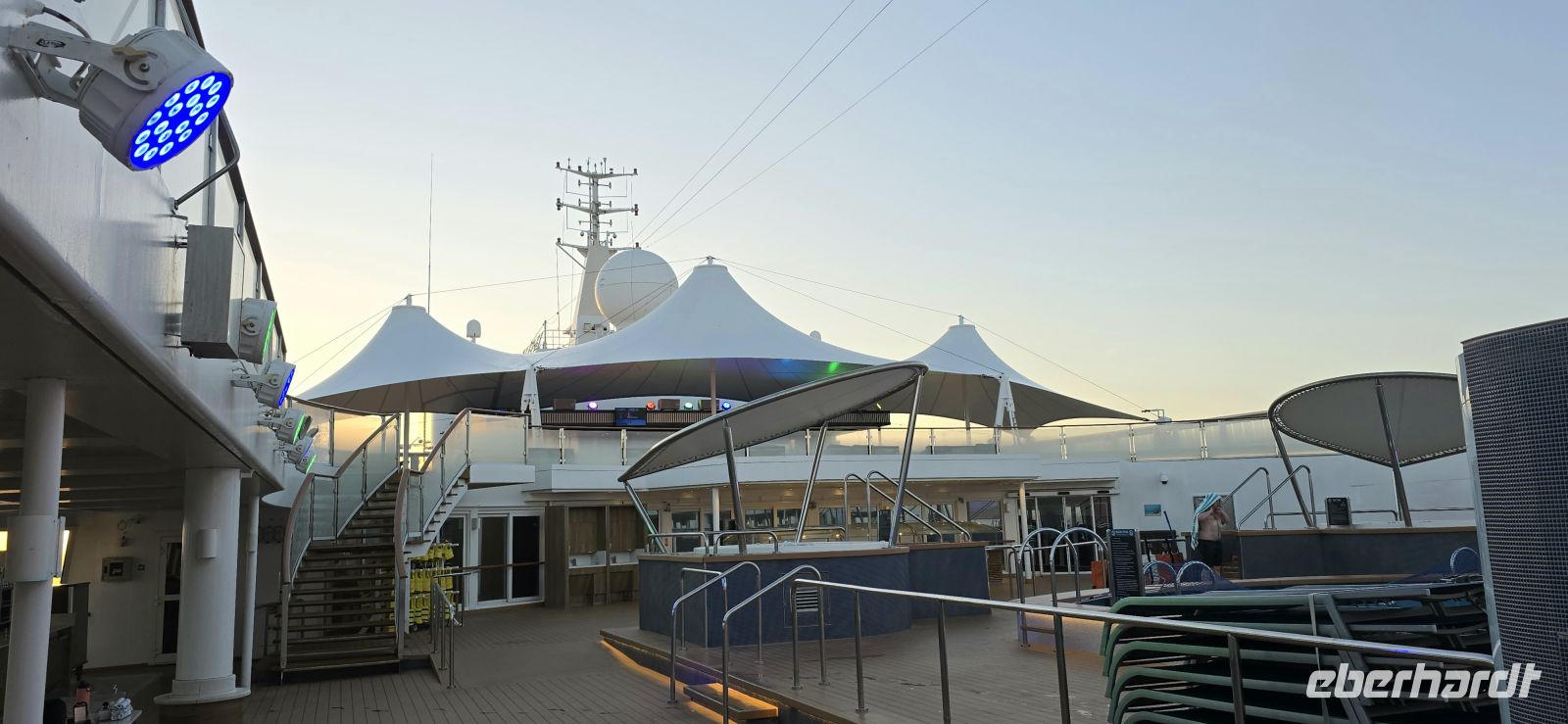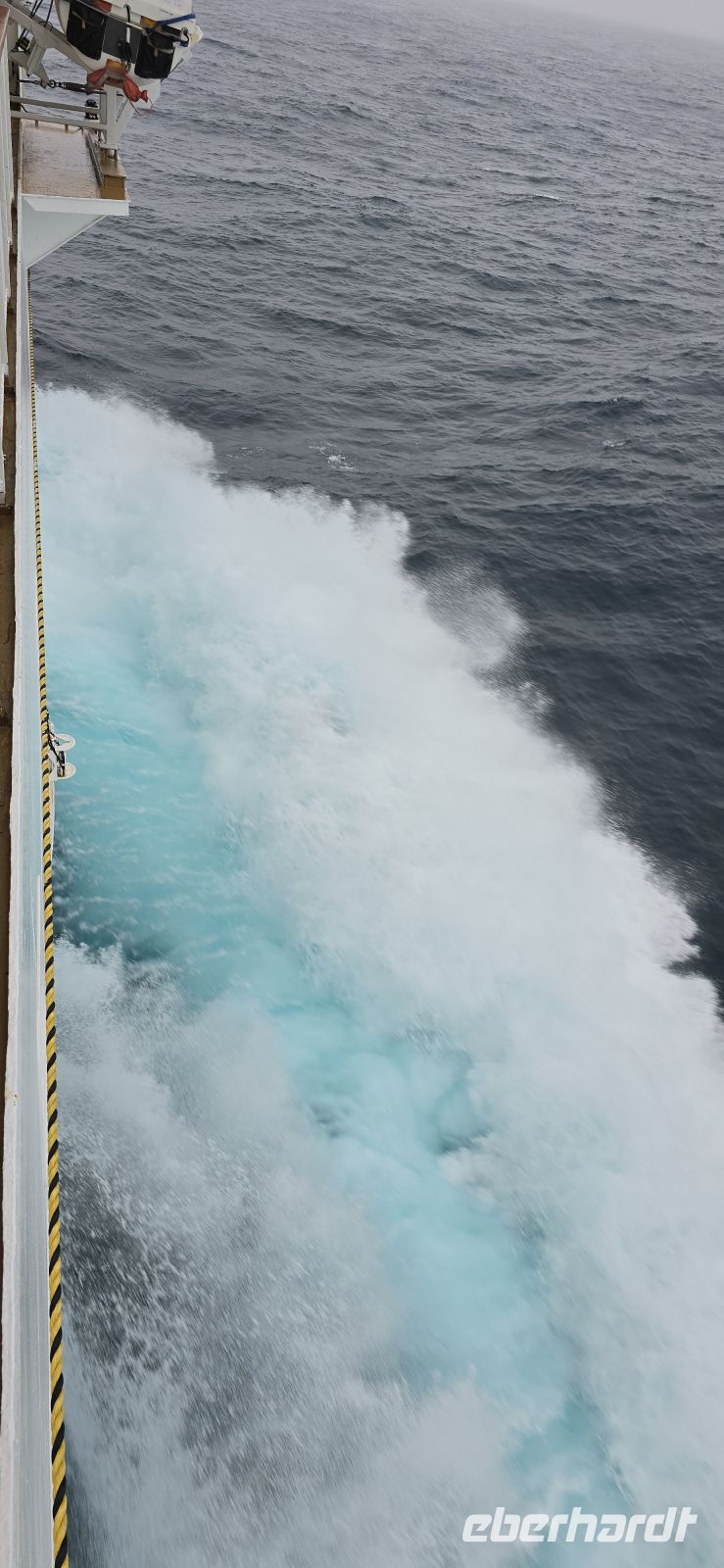 Die Pools bleiben vorsorglich geschlossen. Das Restwasser hätte sich bei jeder größeren Welle ohnehin großzügig über das Deck verteilt – kostenlose Duschen gibt es heute also nicht. Sicherheit geht vor, Humor hilft.
