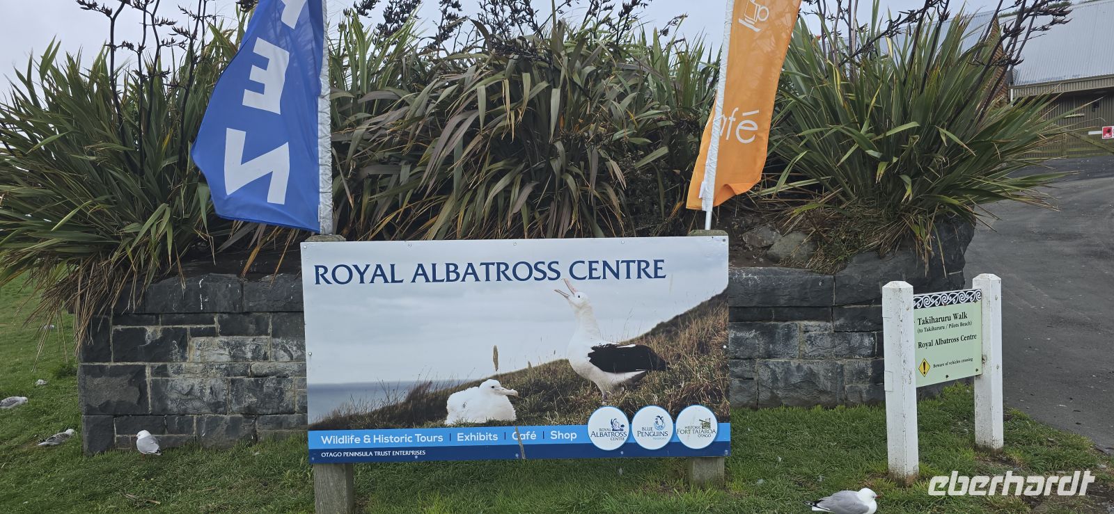 Die Busfahrt führt entlang der idyllischen Bucht hinein nach Dunedin, hübsch eingebettet zwischen grünen Hügeln und Wasserläufen. Quer durch die Stadt geht es vorbei am imposanten Rugby-Stadion, dann auf die andere Seite der Bucht bis zum Taiaroa Head. Hier wartet ein echtes Highlight: das Royal Albatross Centre.